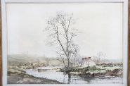 A peaceful riverside composition showing cottages and trees reflected in still water under soft skies, painted with Egginton’s precise brushwork and delicate tonality.