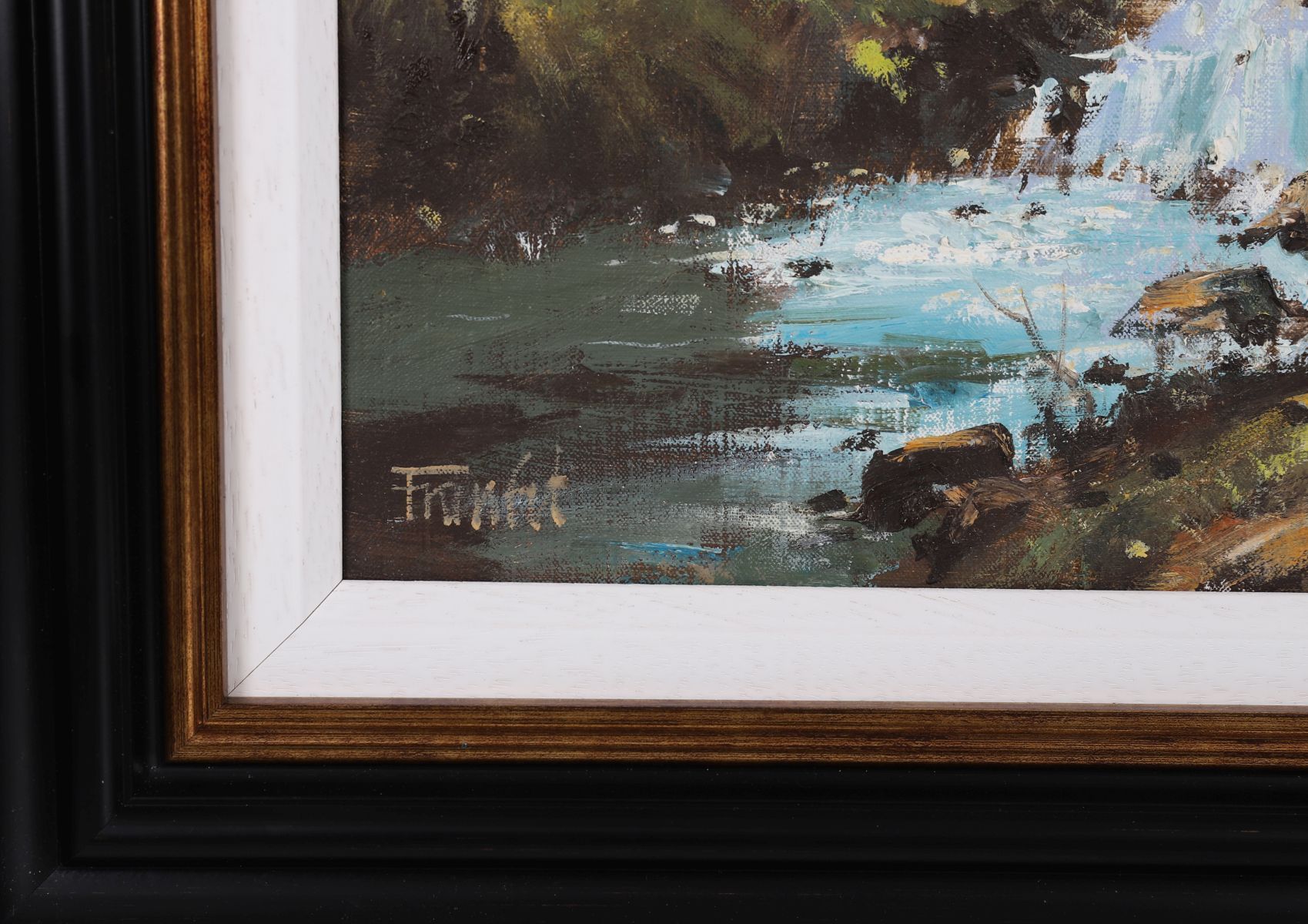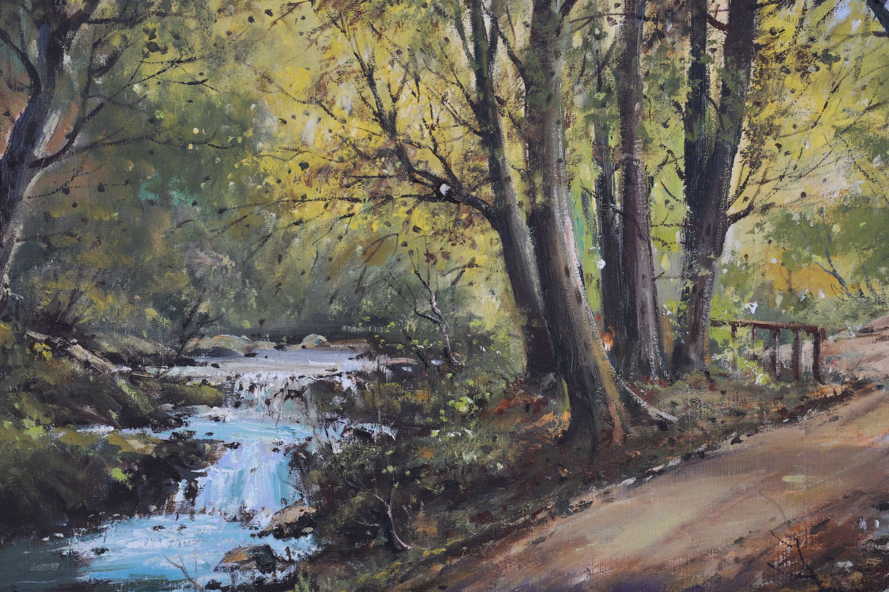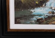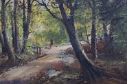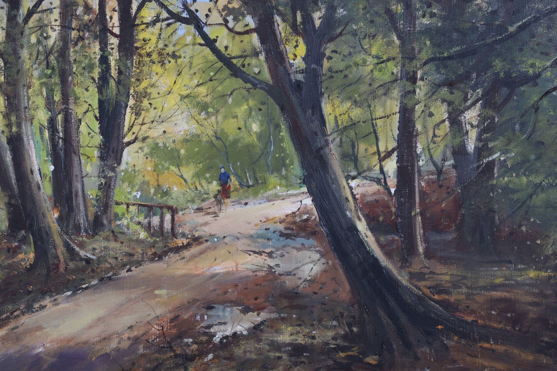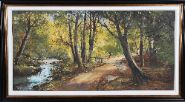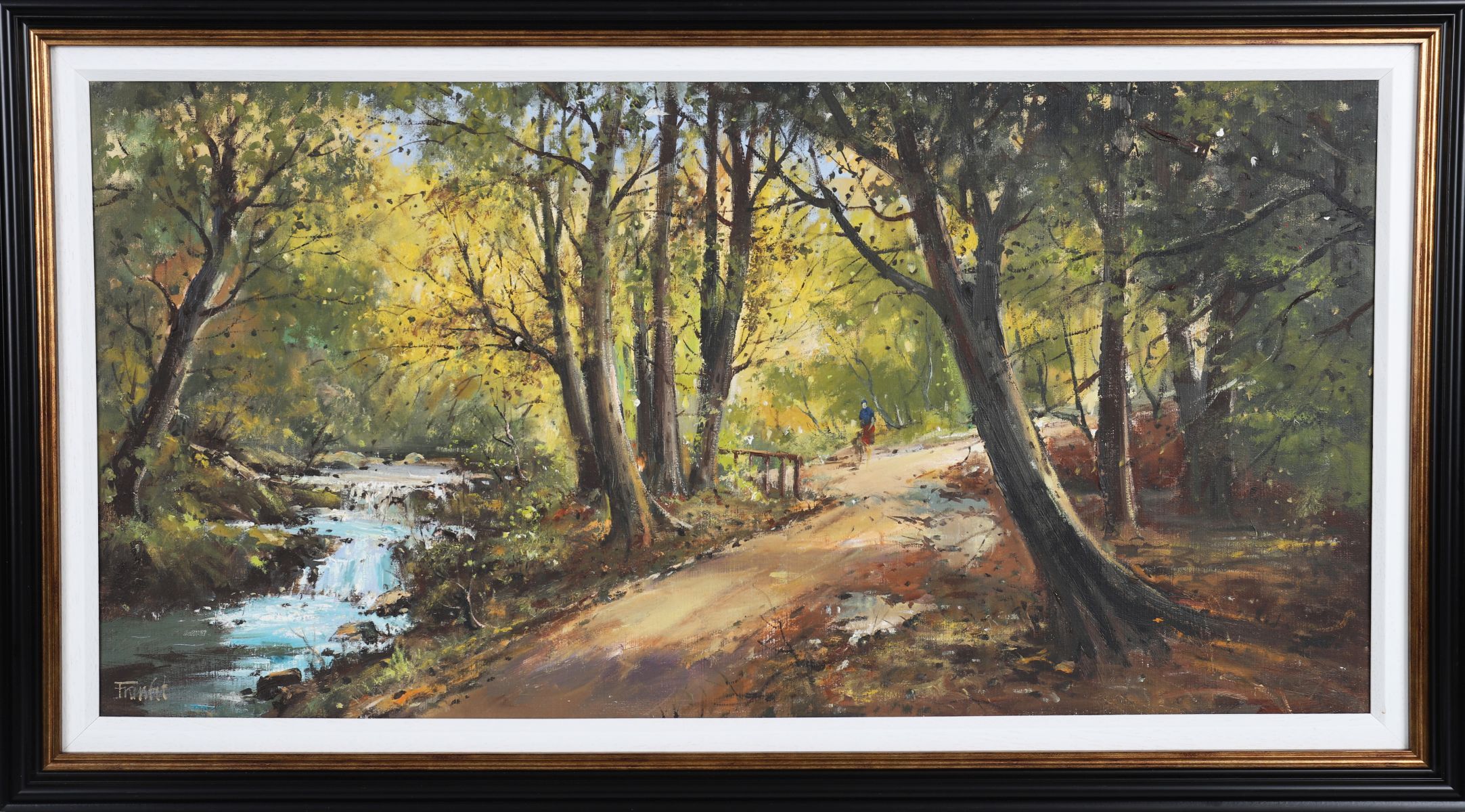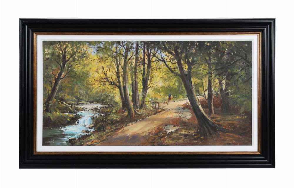 An atmospheric woodland landscape depicting a winding path beneath tall trees in full autumn foliage. A figure walks towards a clearing, while a stream runs alongside the track. Painted with Fitzsimmons’ characteristic broken brushwork and warm natural palette, the scene captures depth, movement and filtered light through dense foliage. Framed in a dark moulded frame with ivory slip.