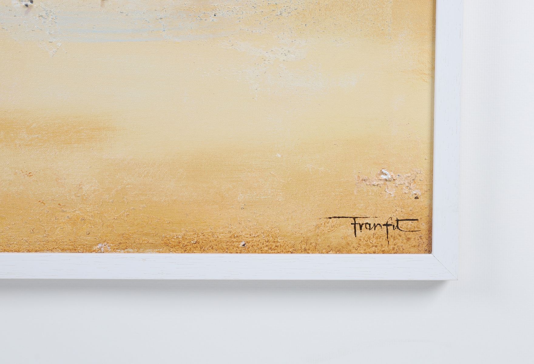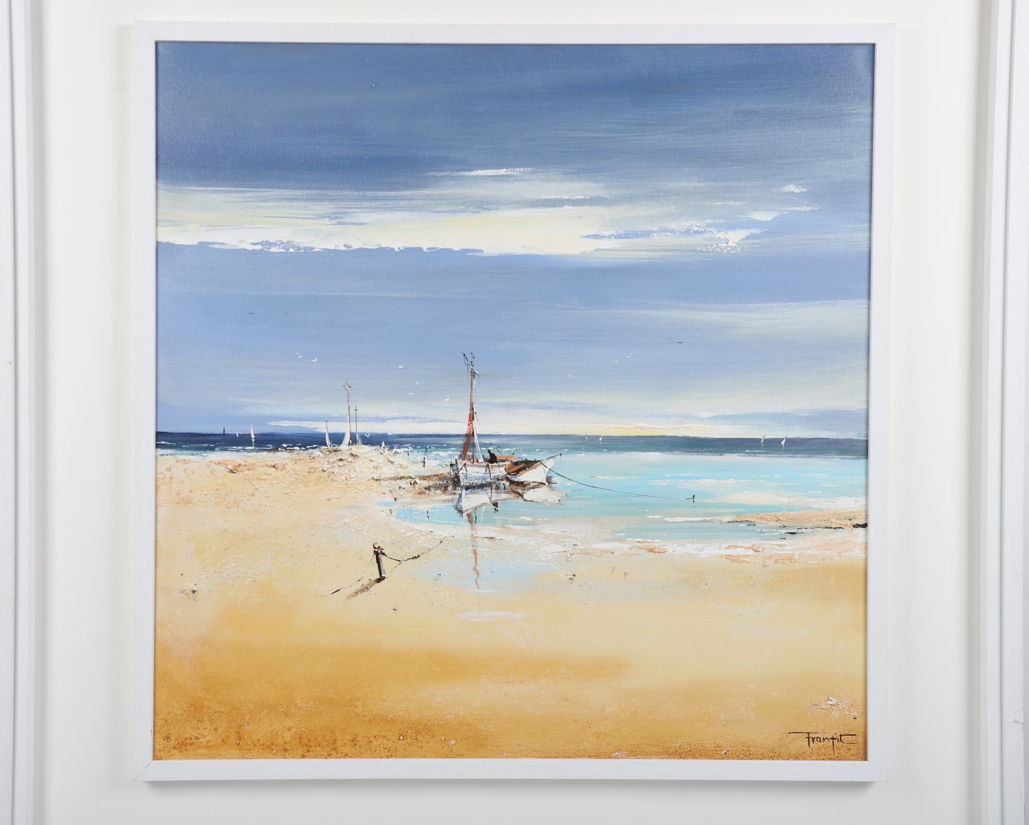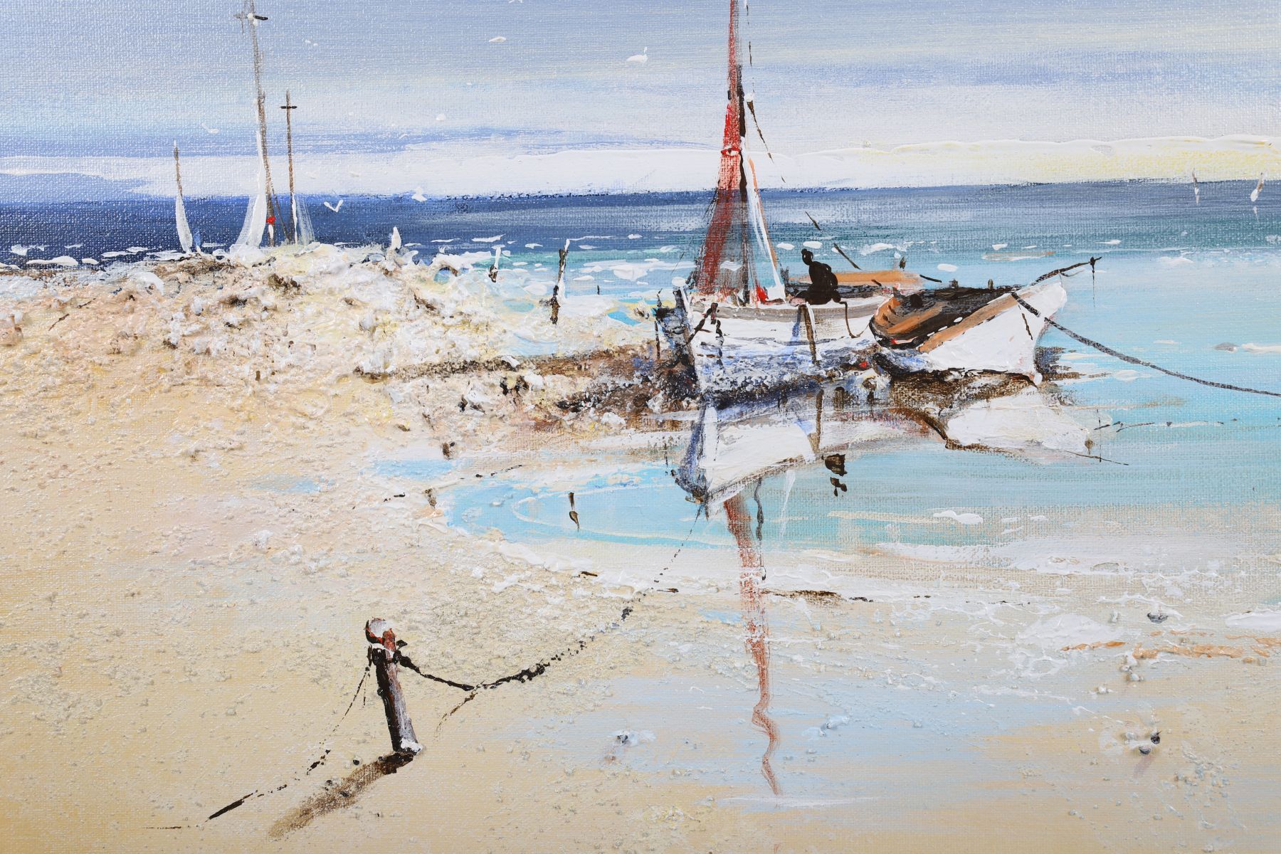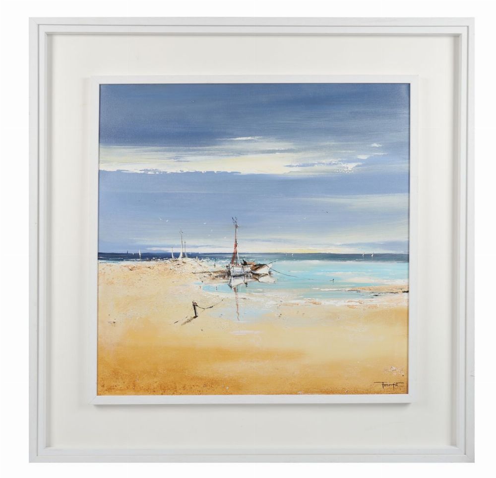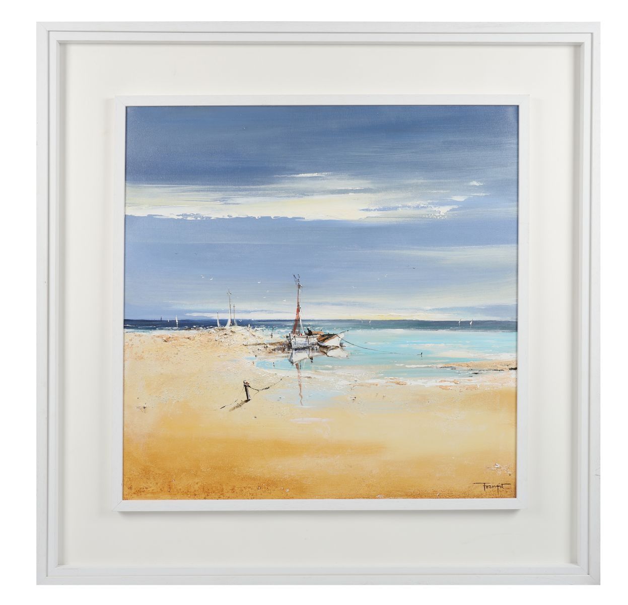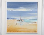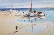 A serene coastal landscape showing boats resting on the shore under a vast, tranquil sky. Fitzsimons employs his trademark palette-knife impasto technique, capturing the reflective calm of the Irish coast with texture and tonal subtlety.