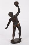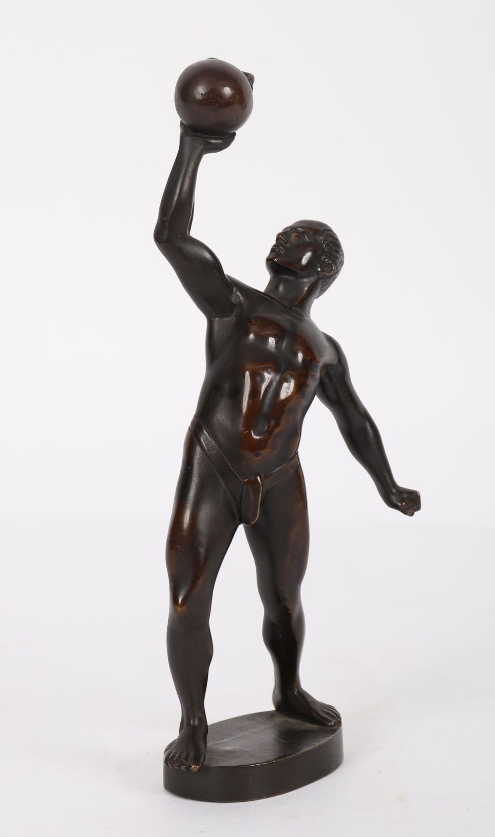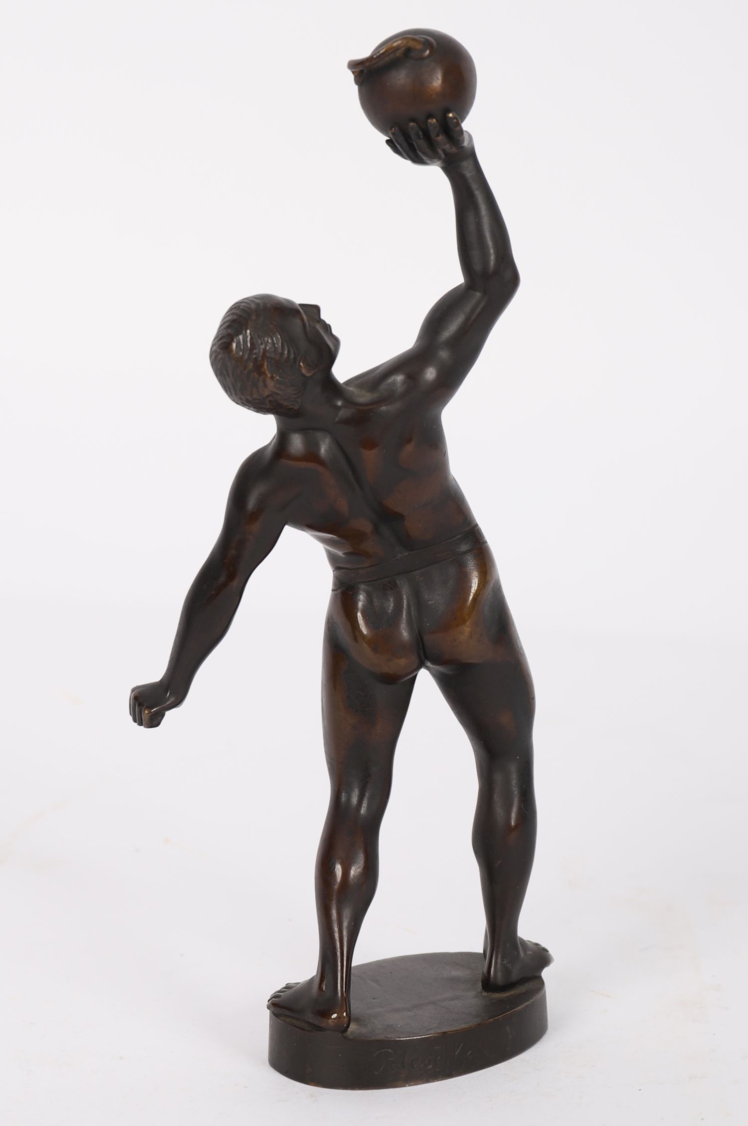 A patinated bronze figure of a nude male holding a spherical vessel aloft, signed Frank Pelesch to base.
