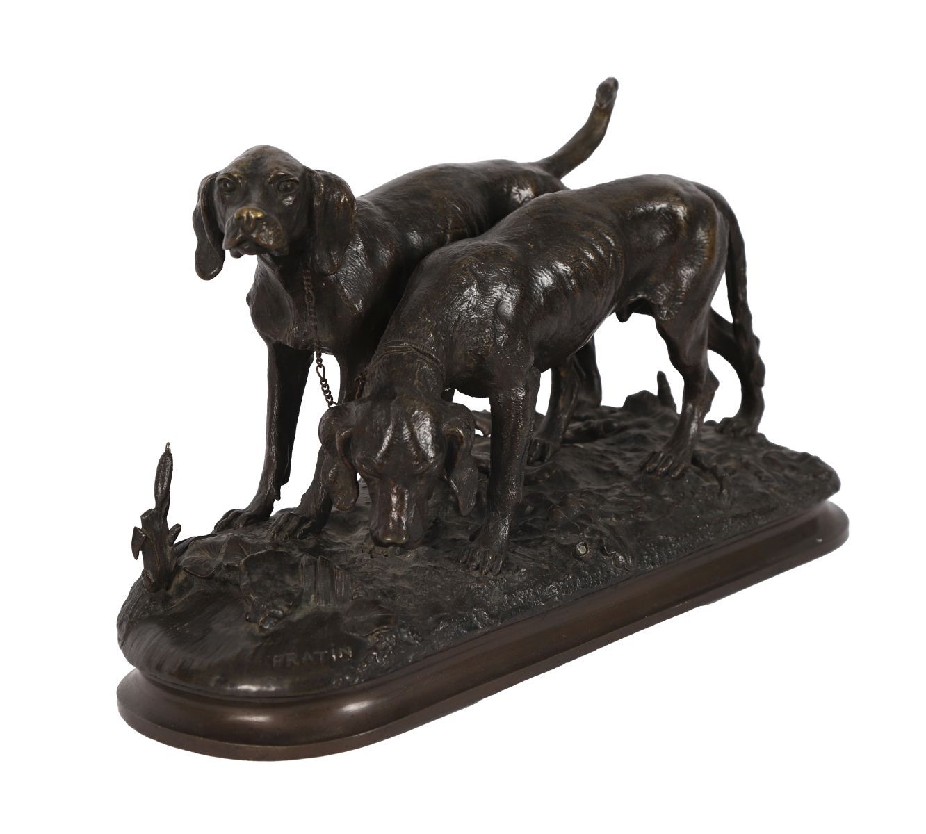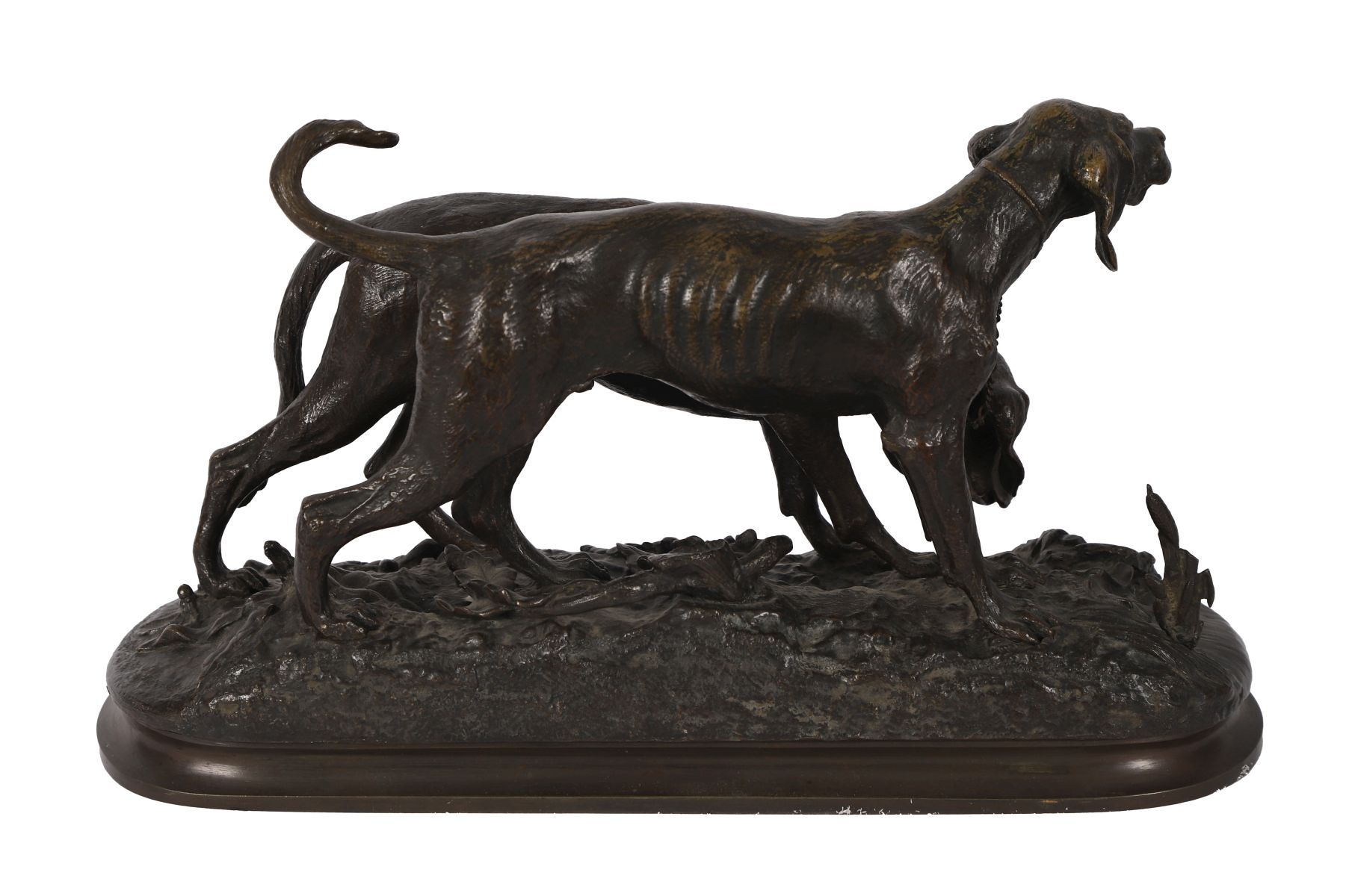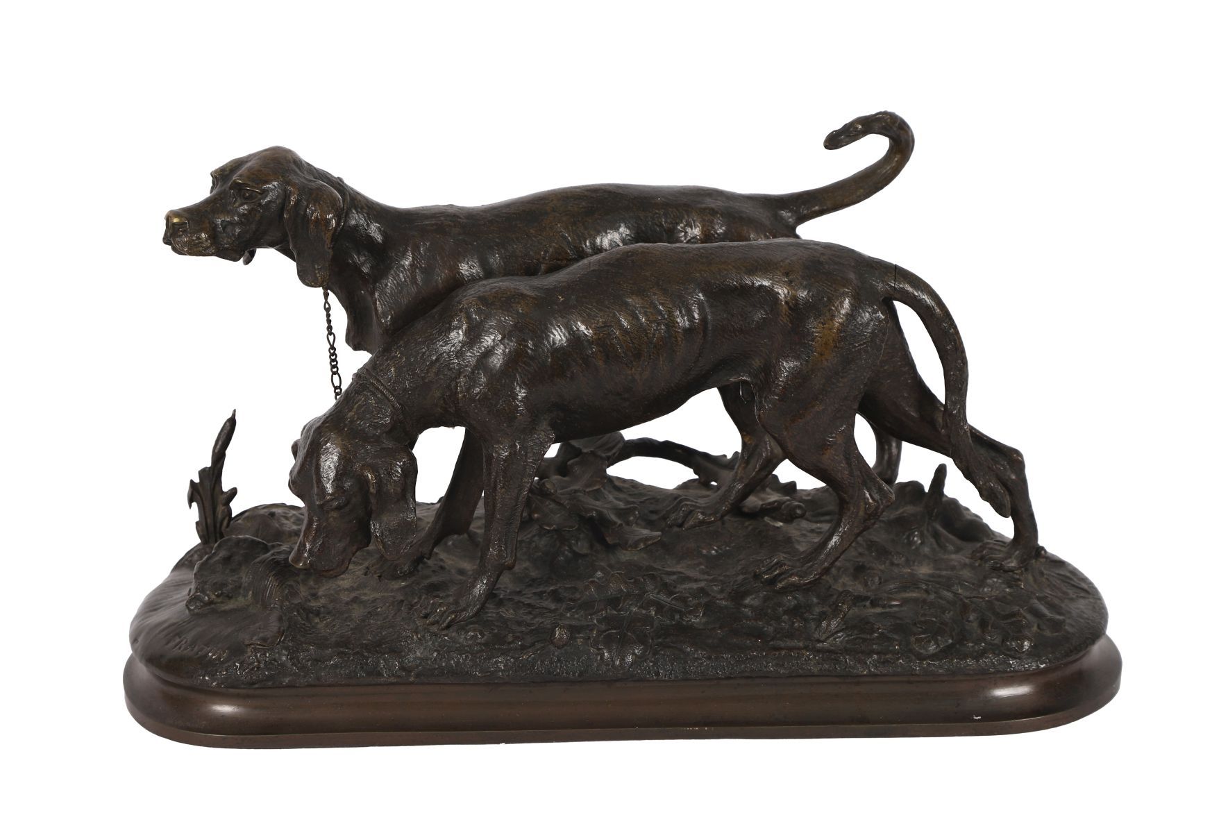 A 19th-century French bronze sculpture after Fratin, modelled as a pair of setters scenting the ground, cast with naturalistic detail and animated movement, raised on an oval base.