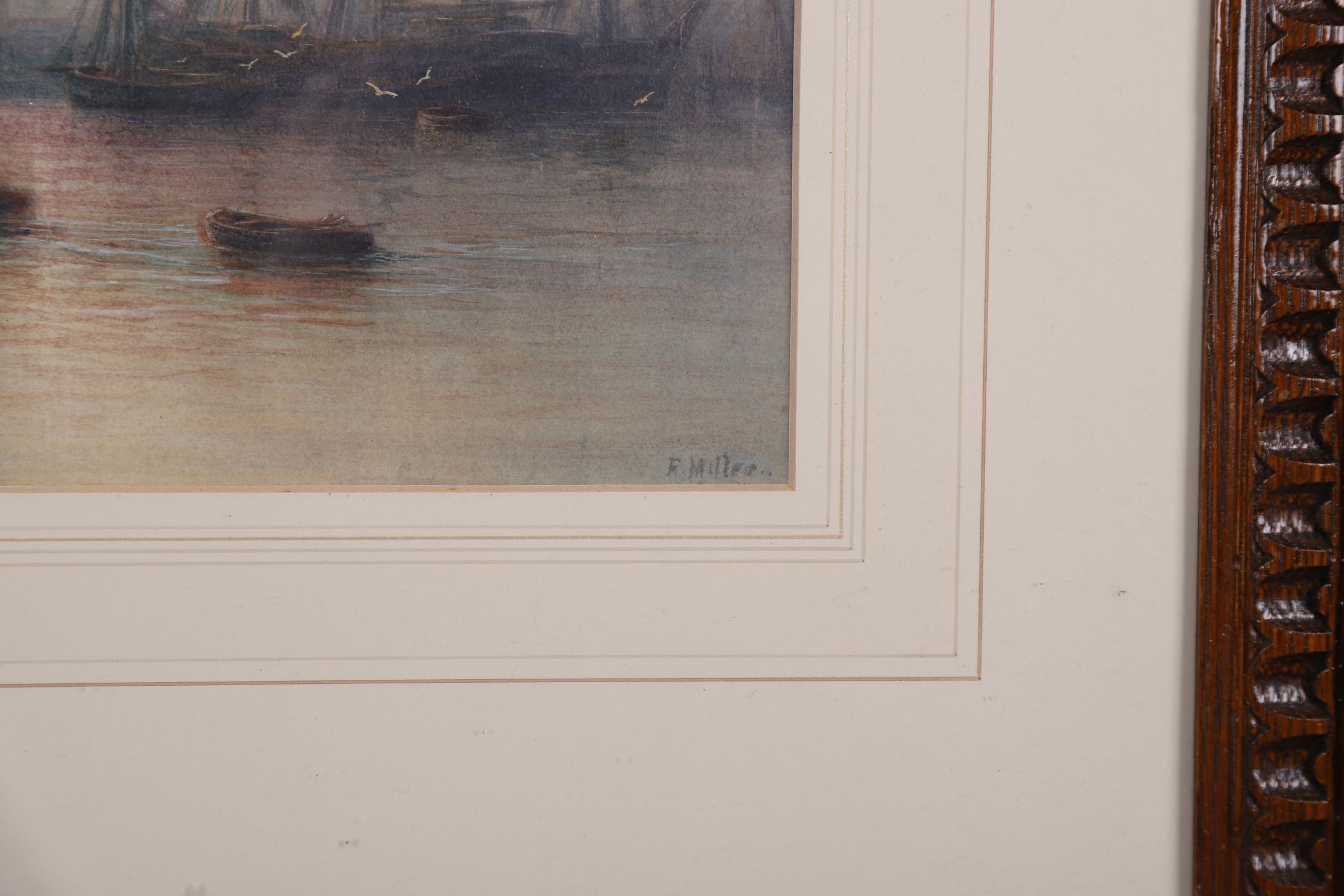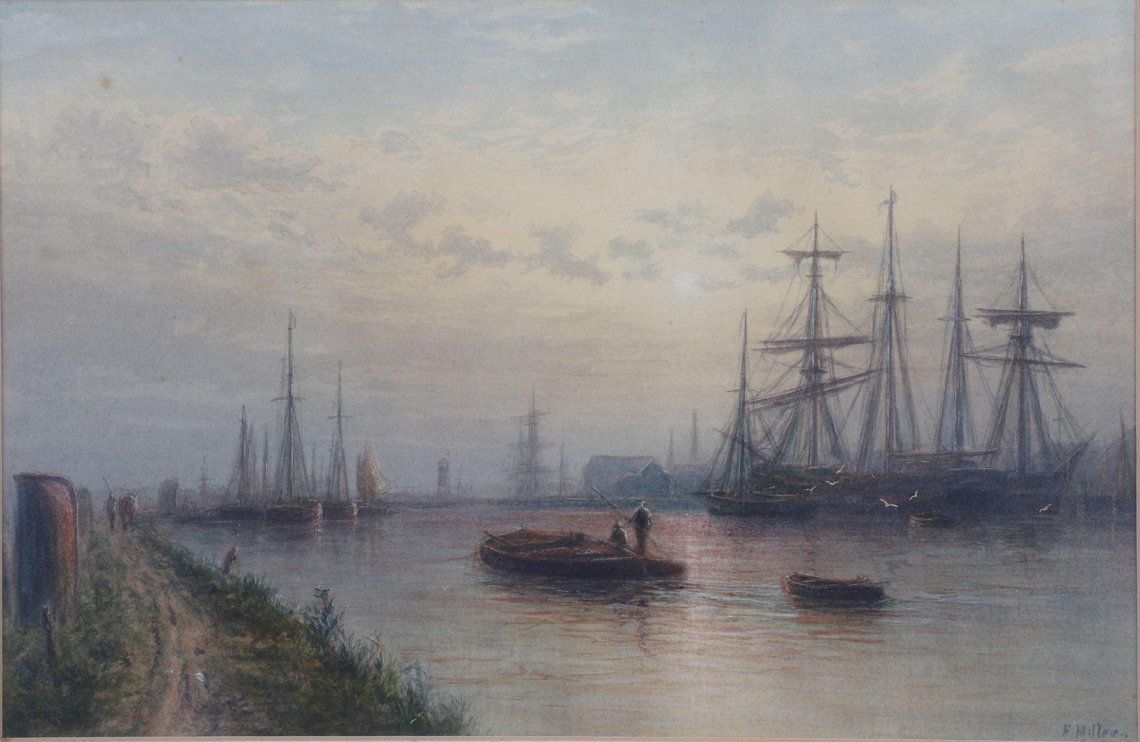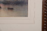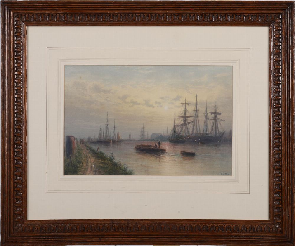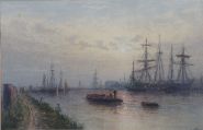 A watercolour depicting tall ships and small boats moored at Portsmouth Harbour under a fading sky, with figures along the quayside. Signed lower right and framed. Watercolour.