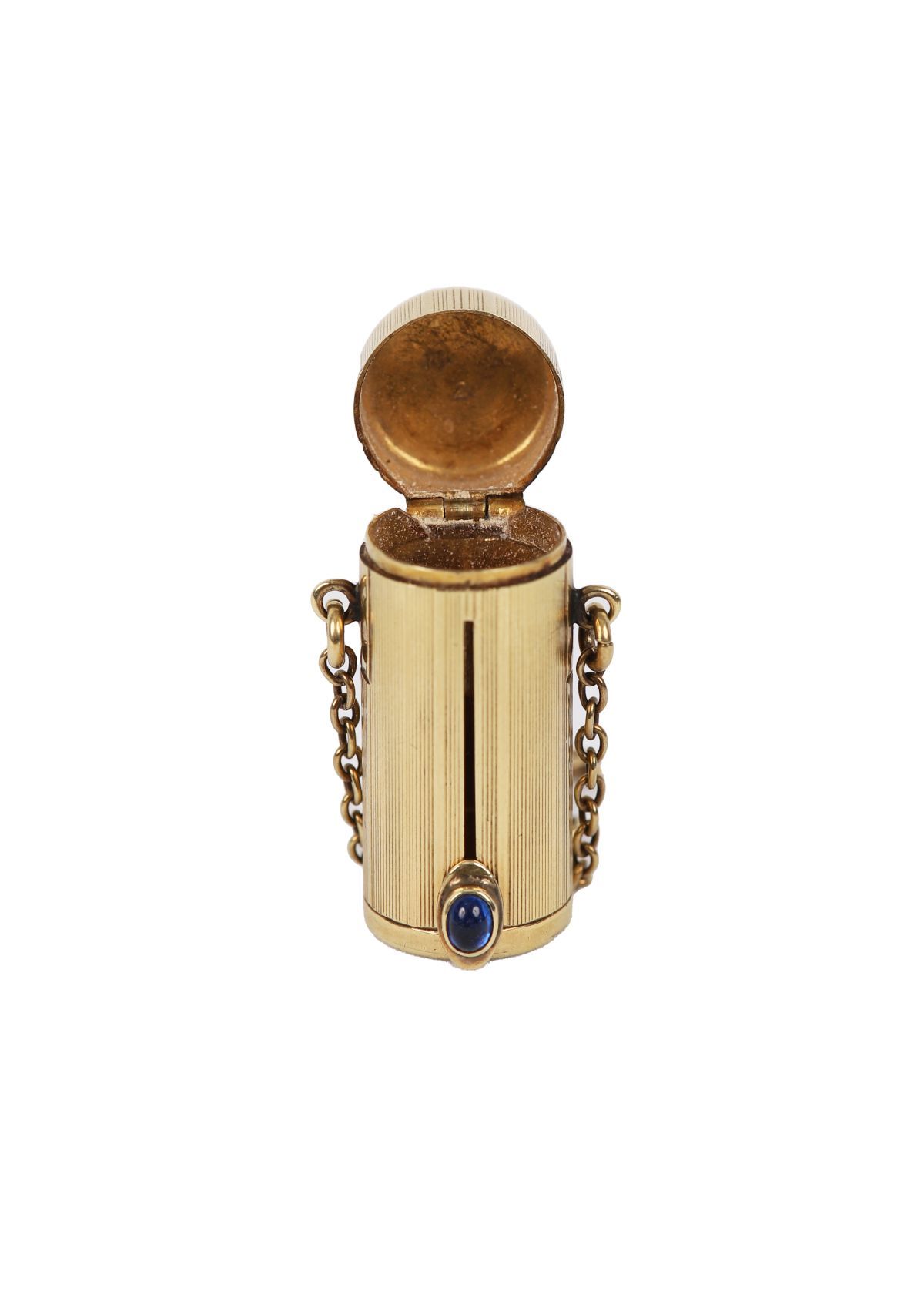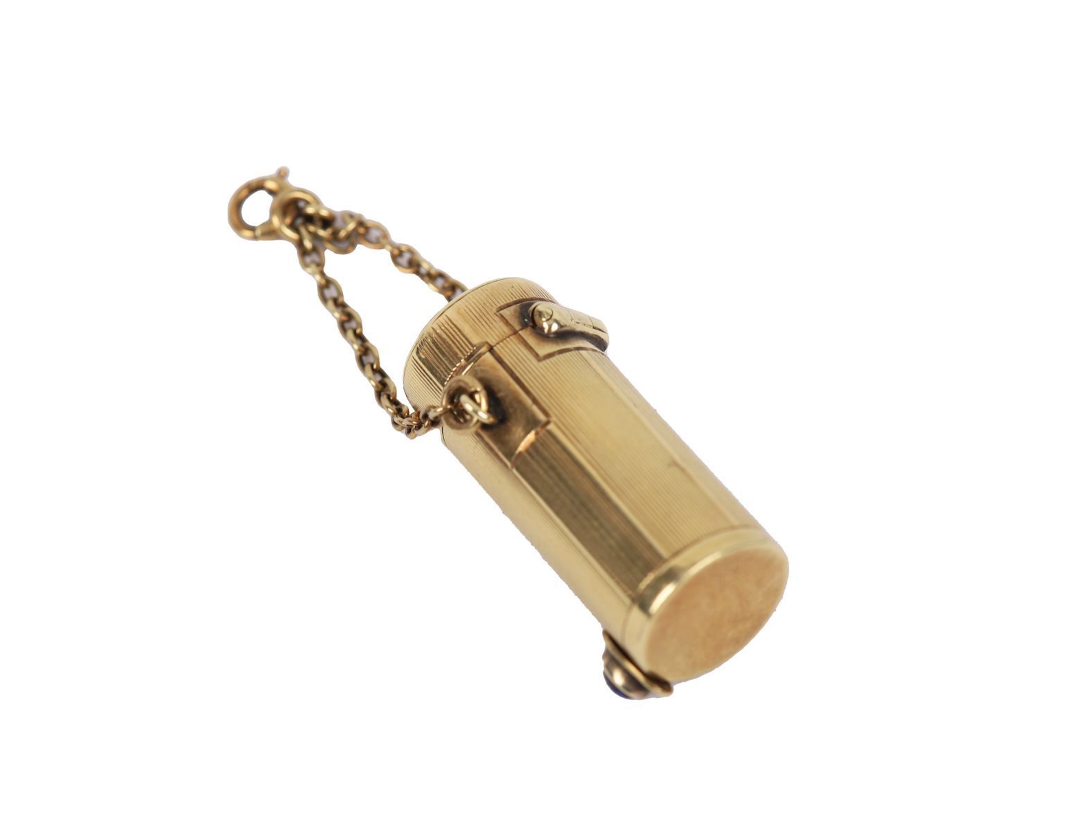 A French Art Deco 14 ct. gold lipstick holder pendant of cylindrical form with engine-turned finish, inset with cabochon sapphires, fitted with chain and safety ring.