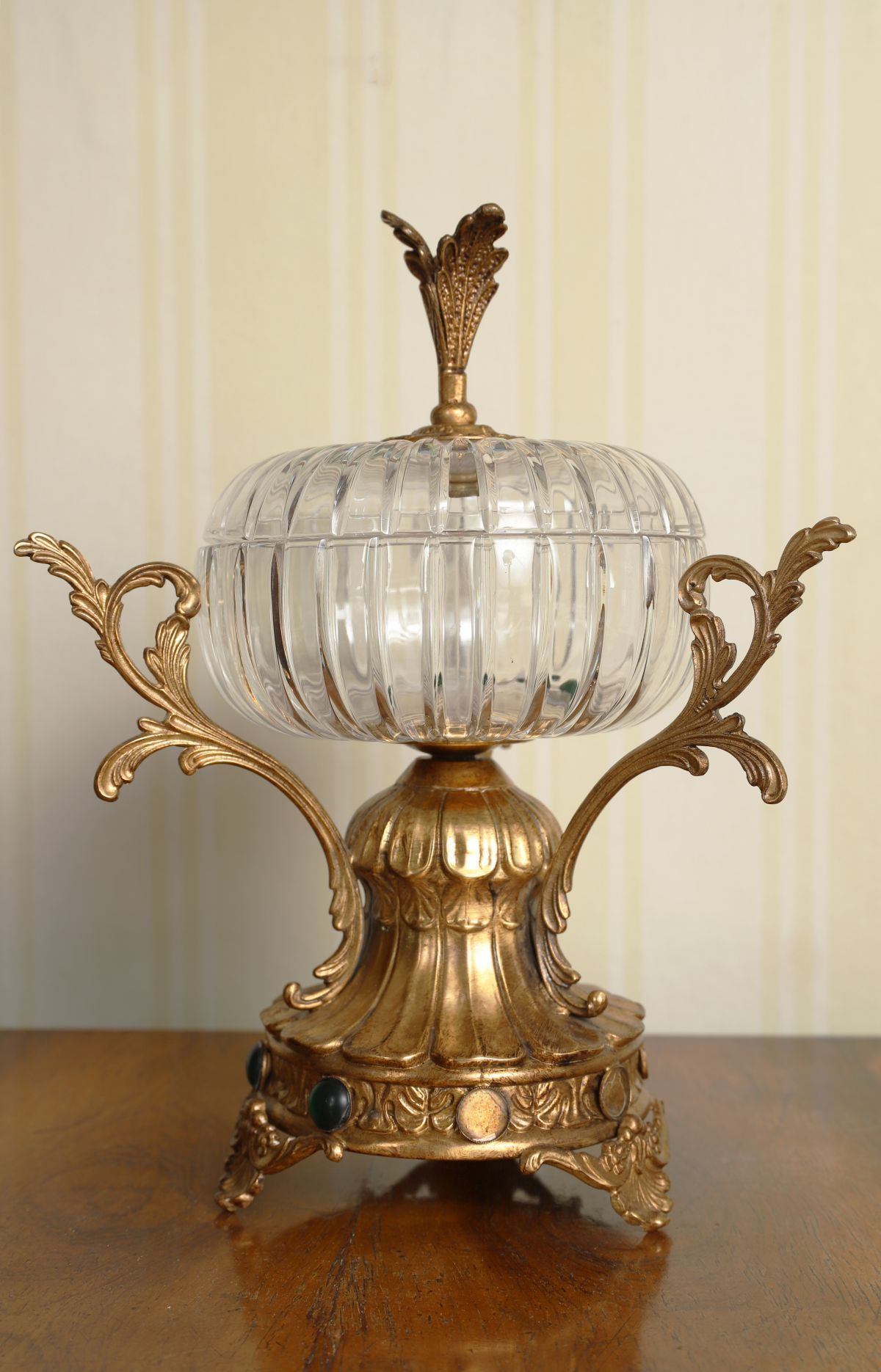 of circular pumpkin form, raised on a rococo scroll base, surmounted by a leaf finial.