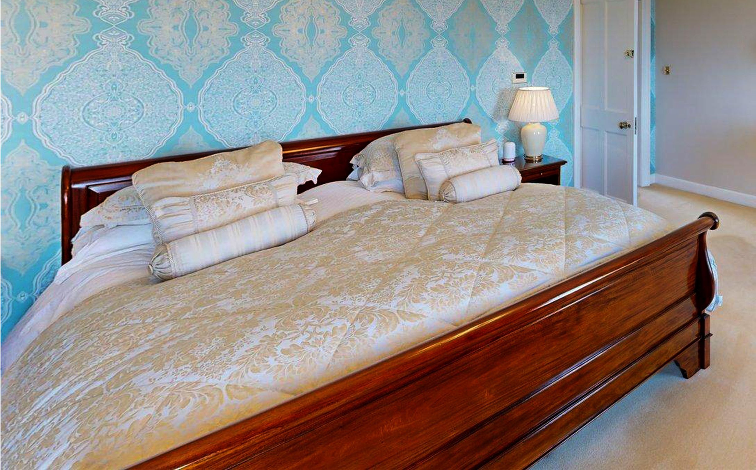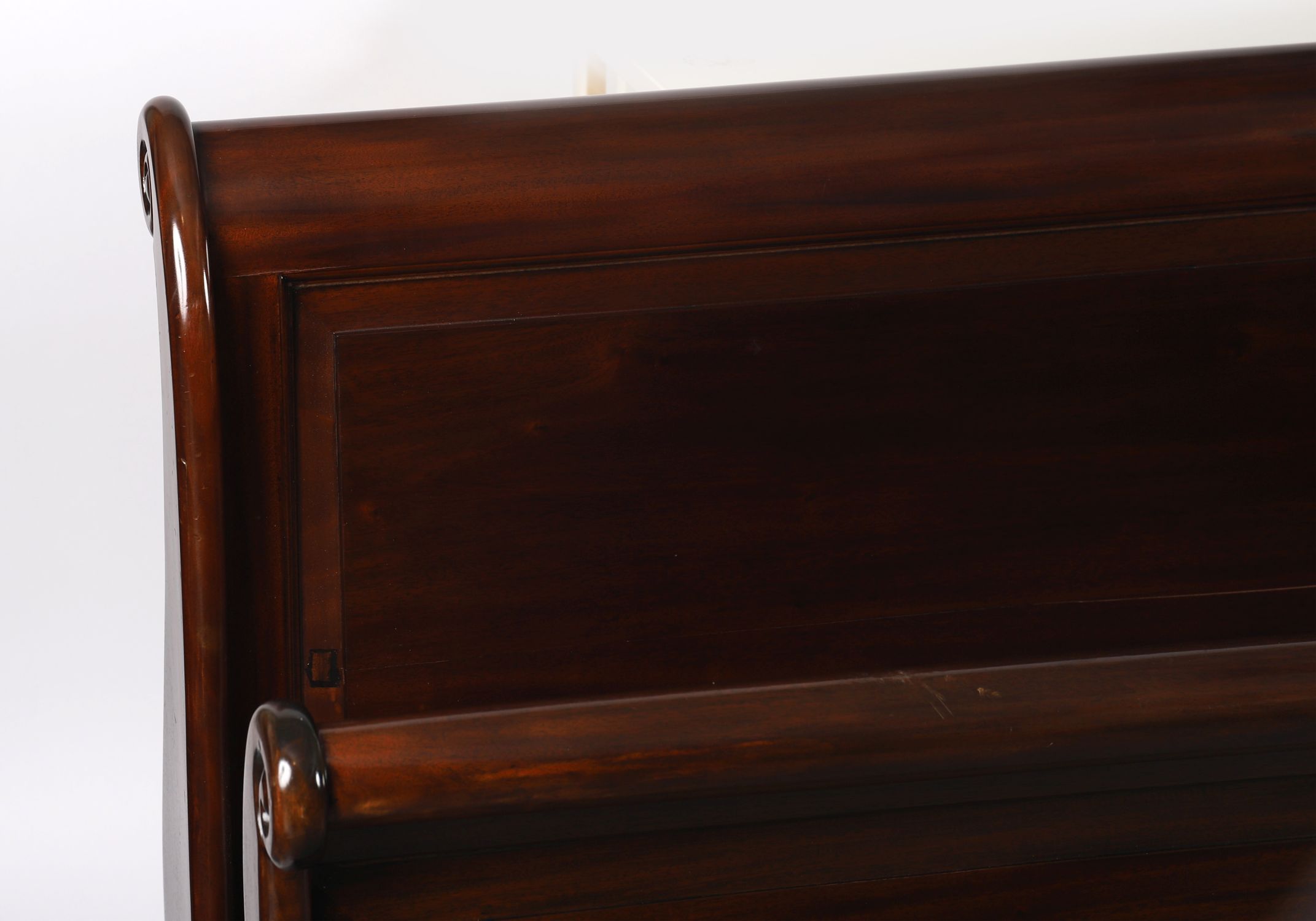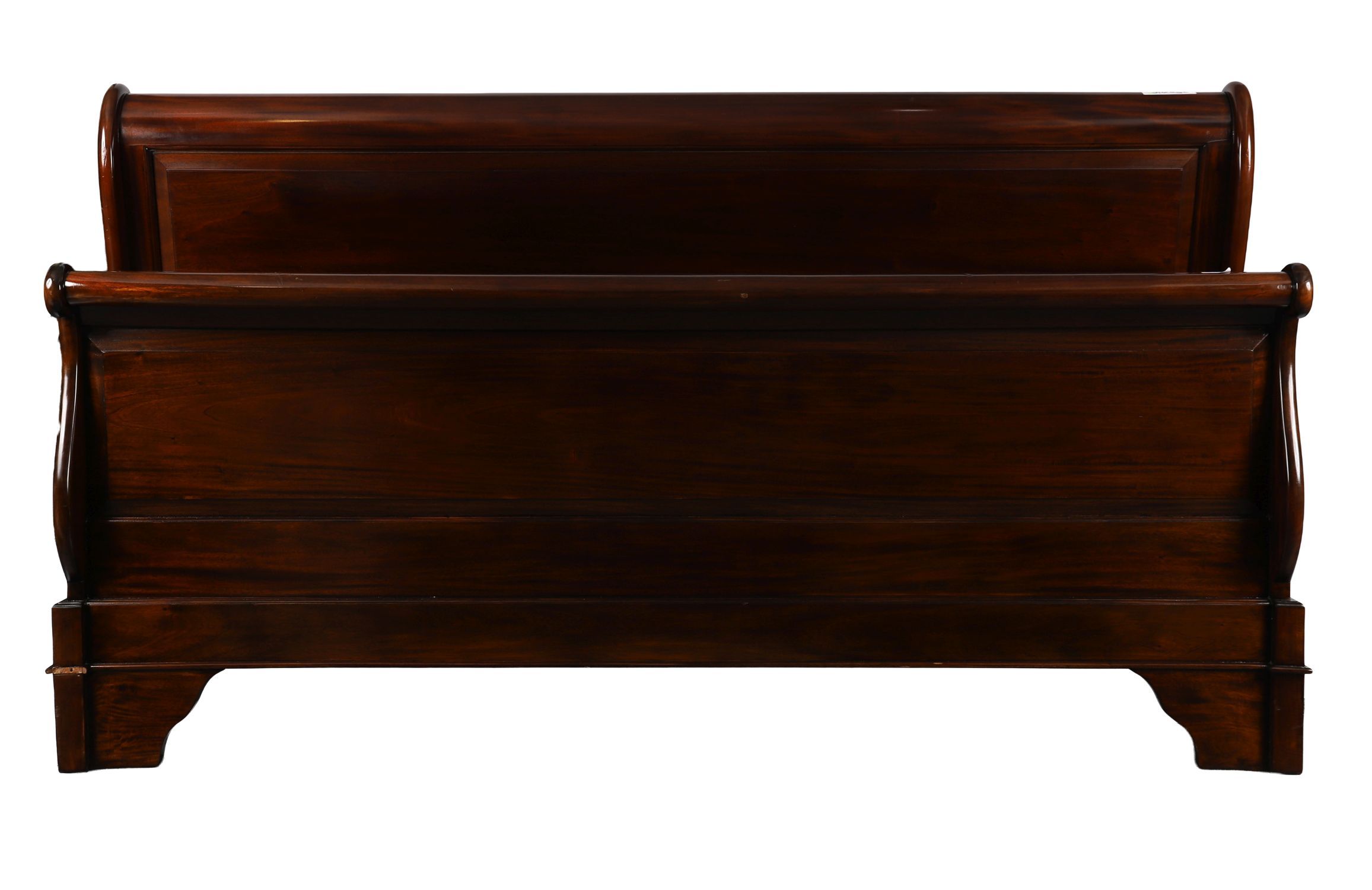 A French Empire style mahogany king-size sleigh bed with rolled headboard and footboard, both with panelled fronts and rich polish, raised on block feet — classical and imposing form.