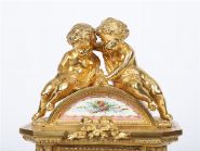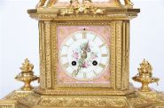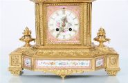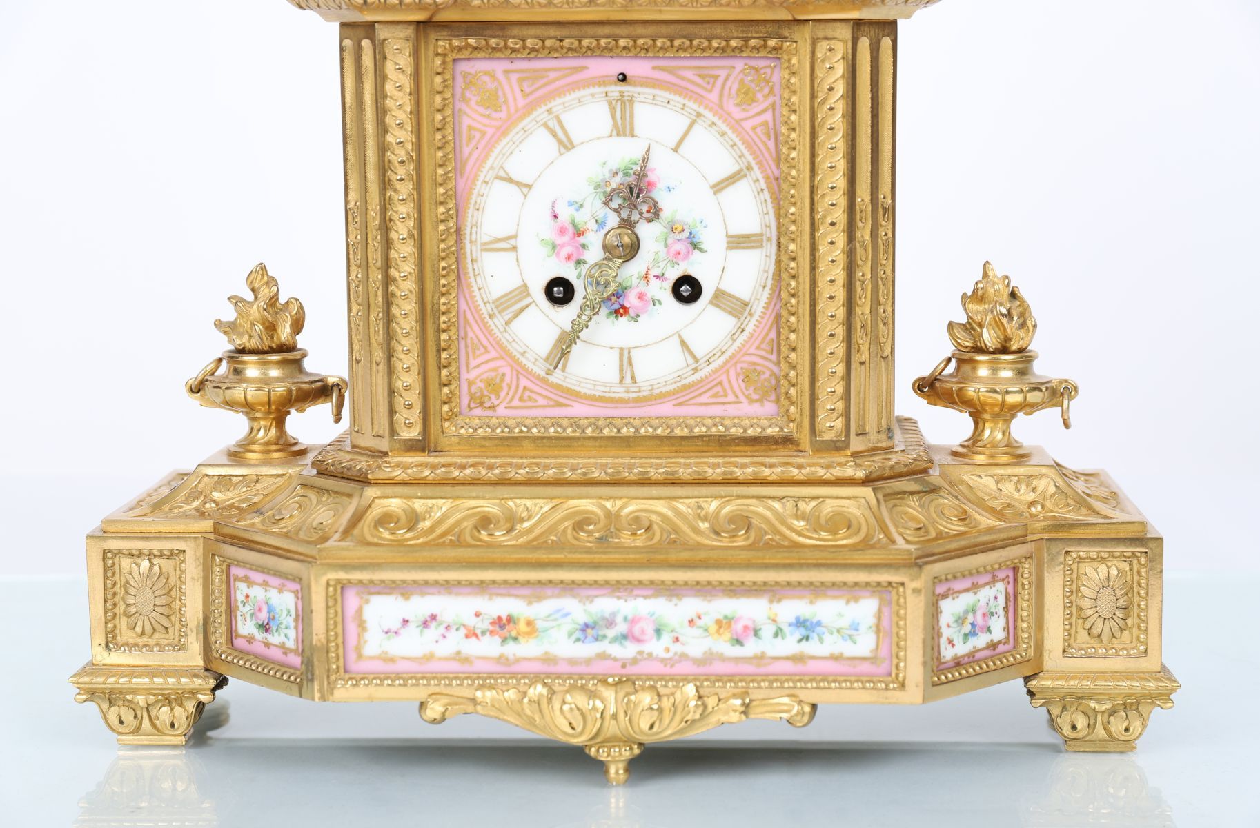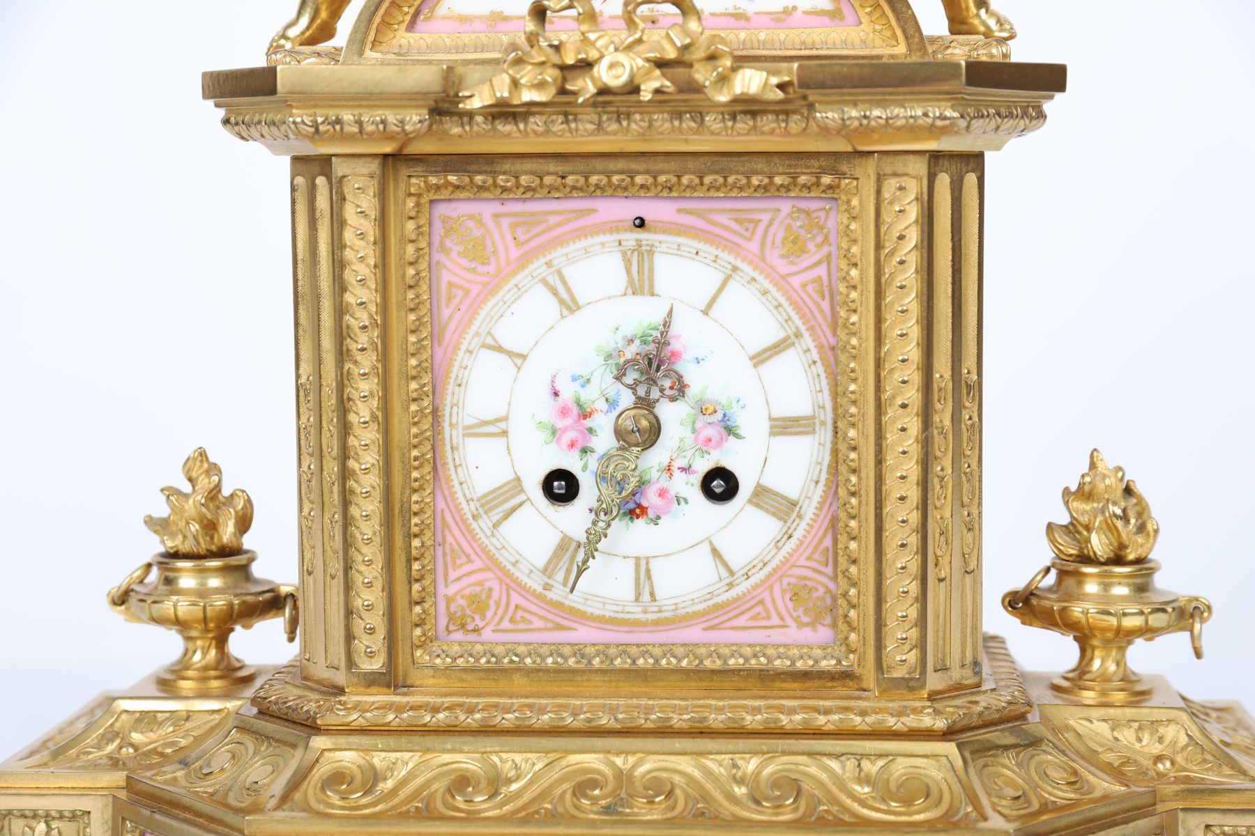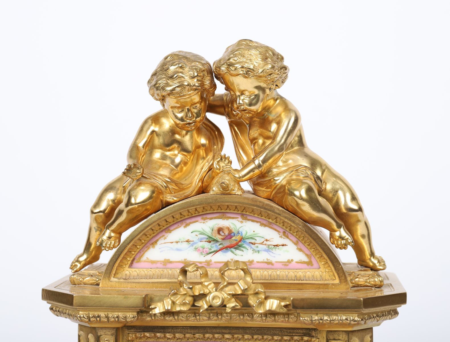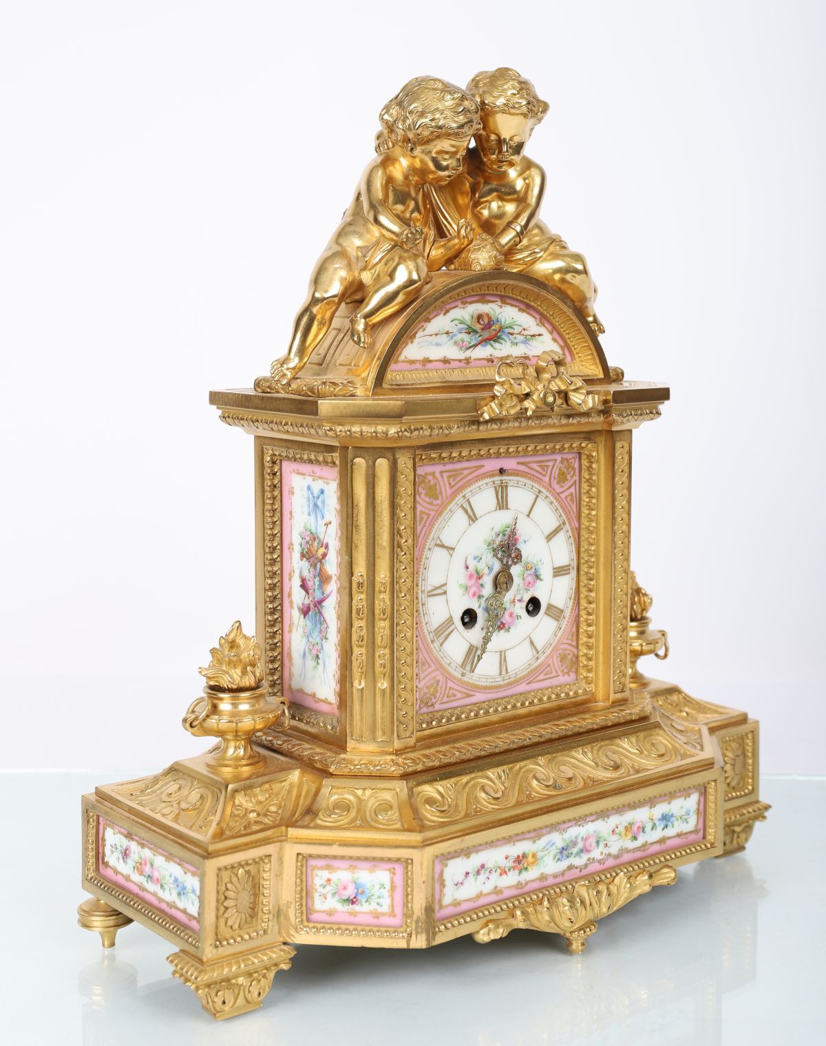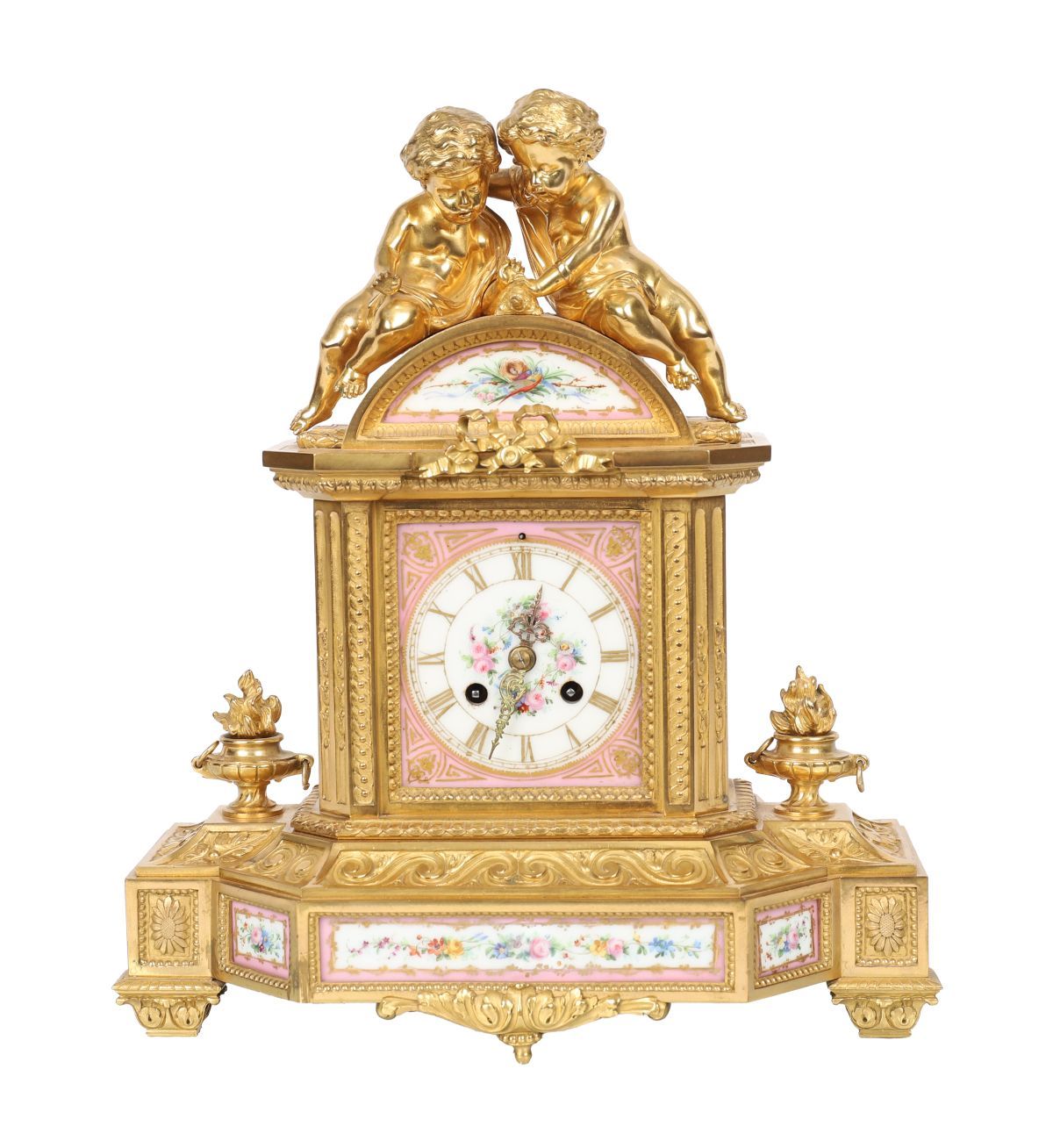 A French gilt bronze mantel clock with inset Sèvres-style porcelain panels decorated with floral reserves on a pink ground, surmounted by twin putti figures.