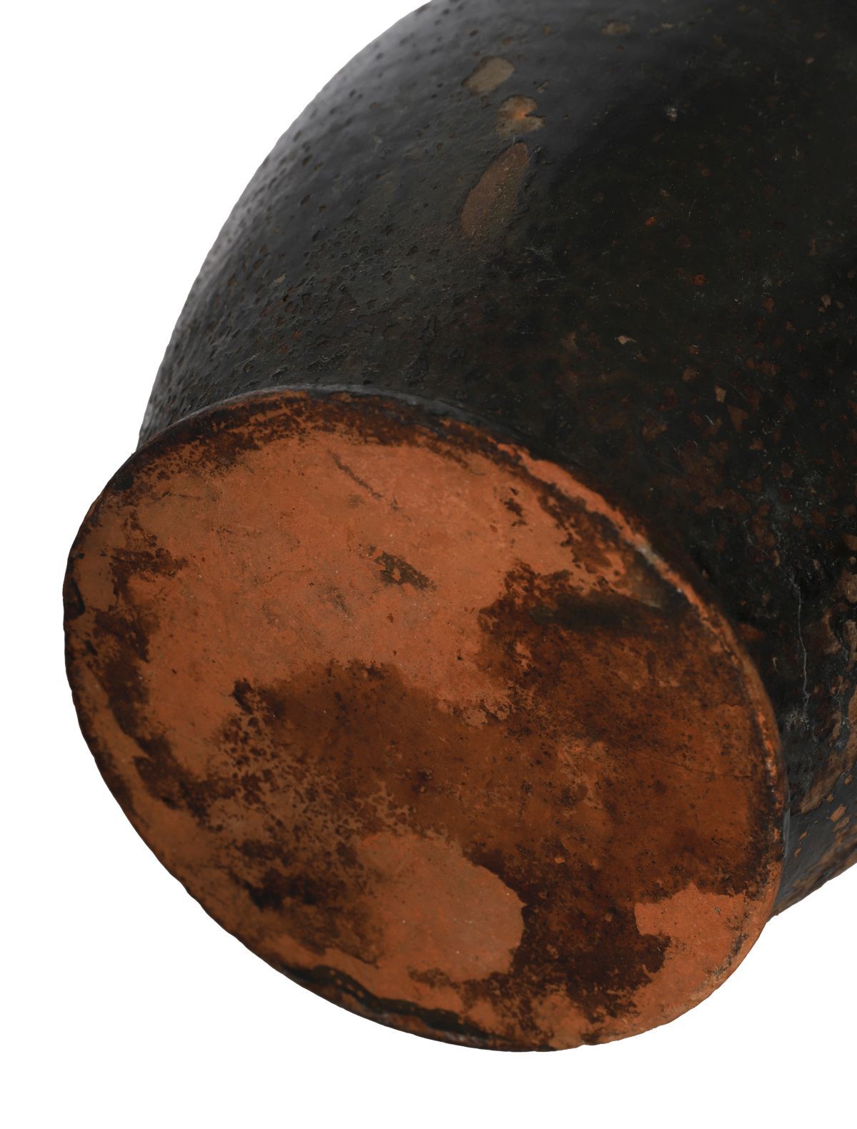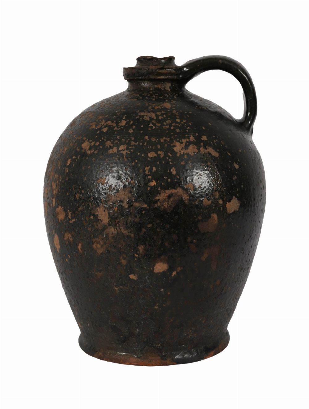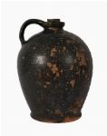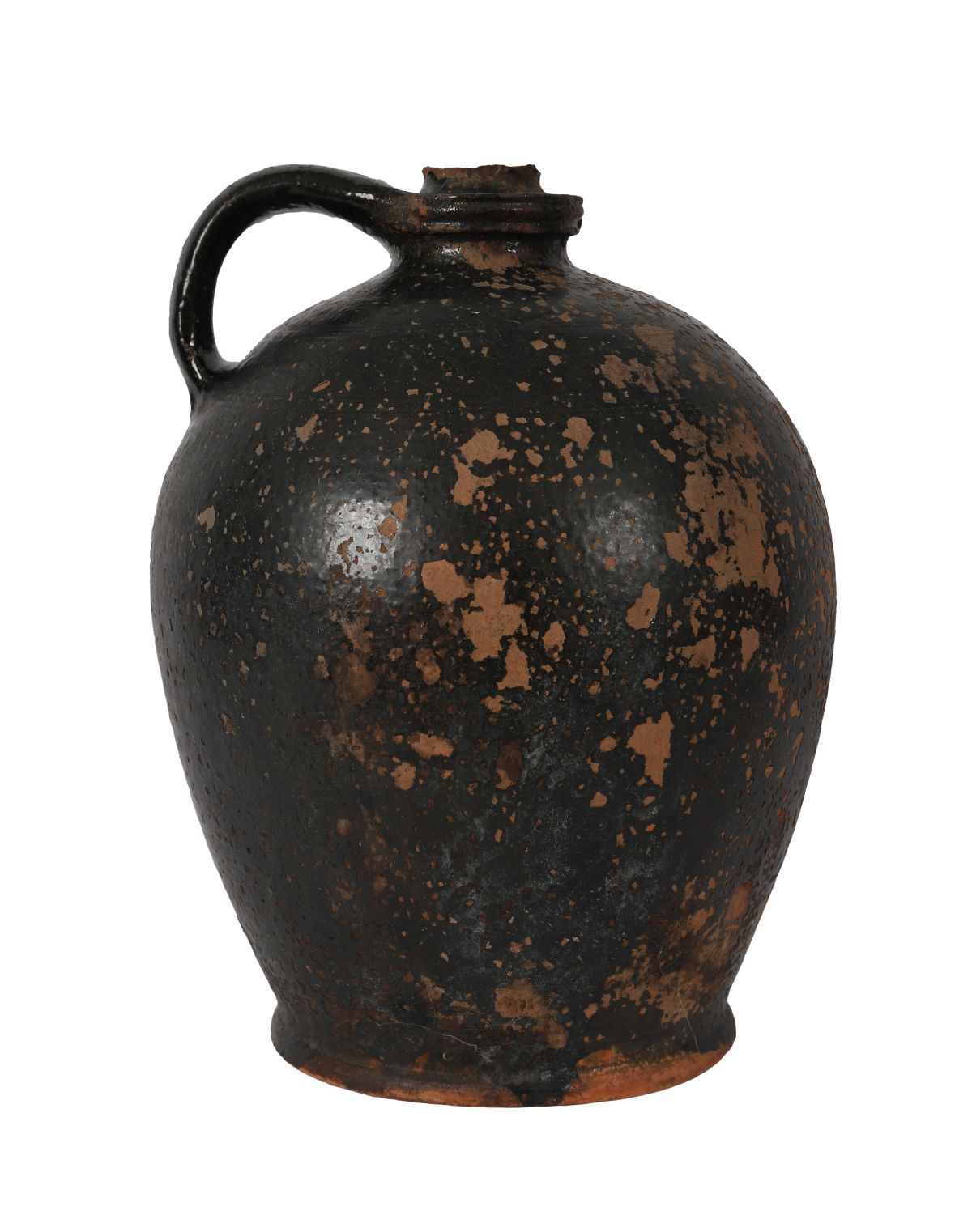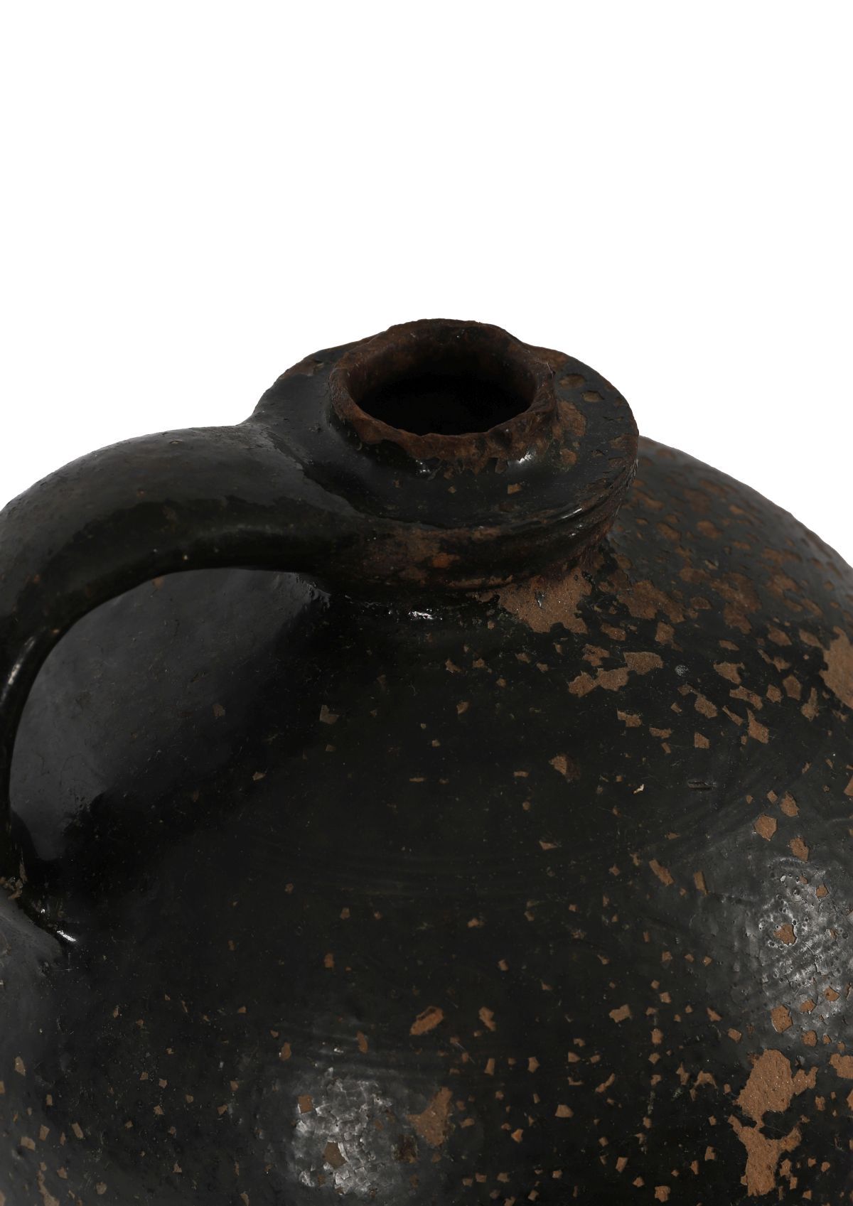 A rustic French earthenware oil jar of globular form with spout and handle, covered in a dark mottled brown glaze with areas of wear revealing the natural clay beneath.