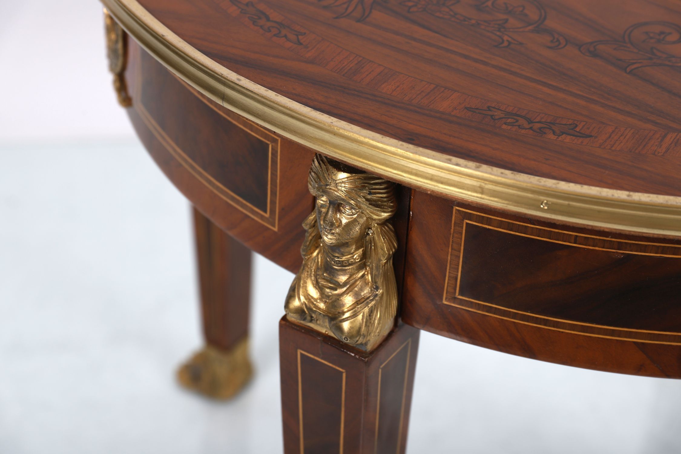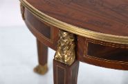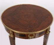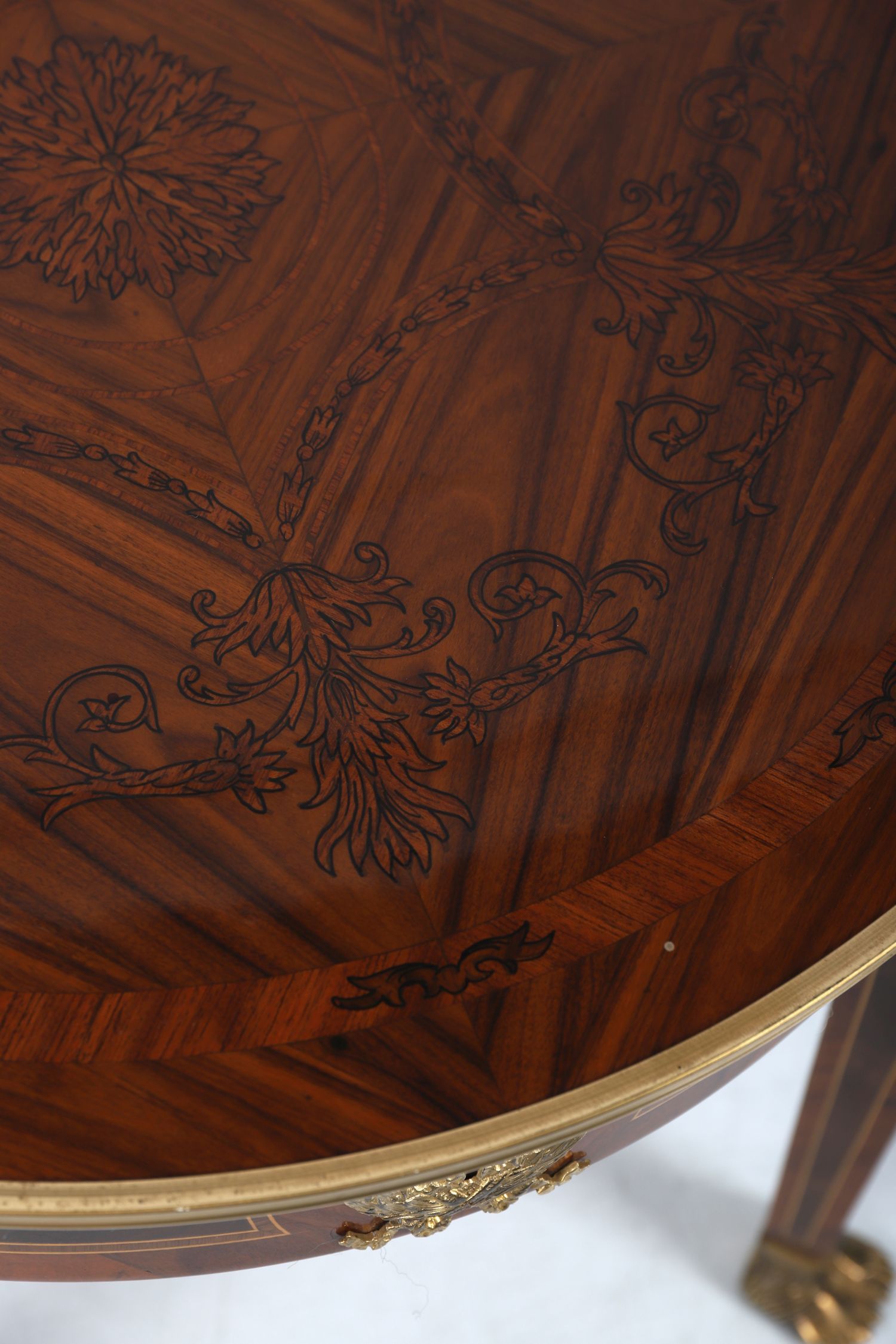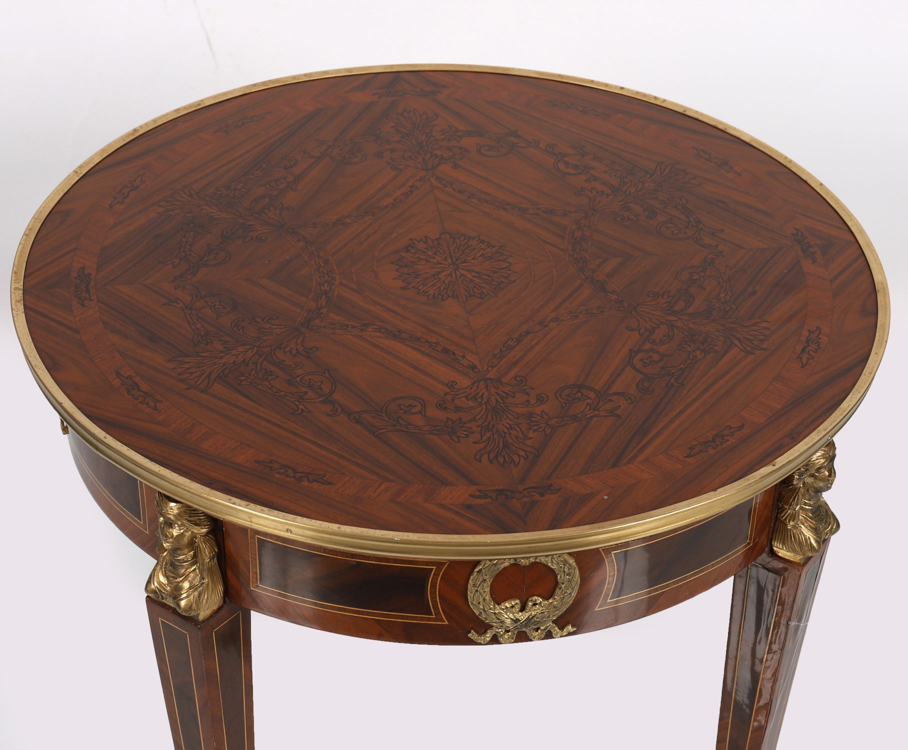 A circular coffee table in the Napoleon III style, the kingwood and crossbanded top with floral marquetry and gilt-bronze banding, raised on tapered legs with gilt mounts and paw feet.