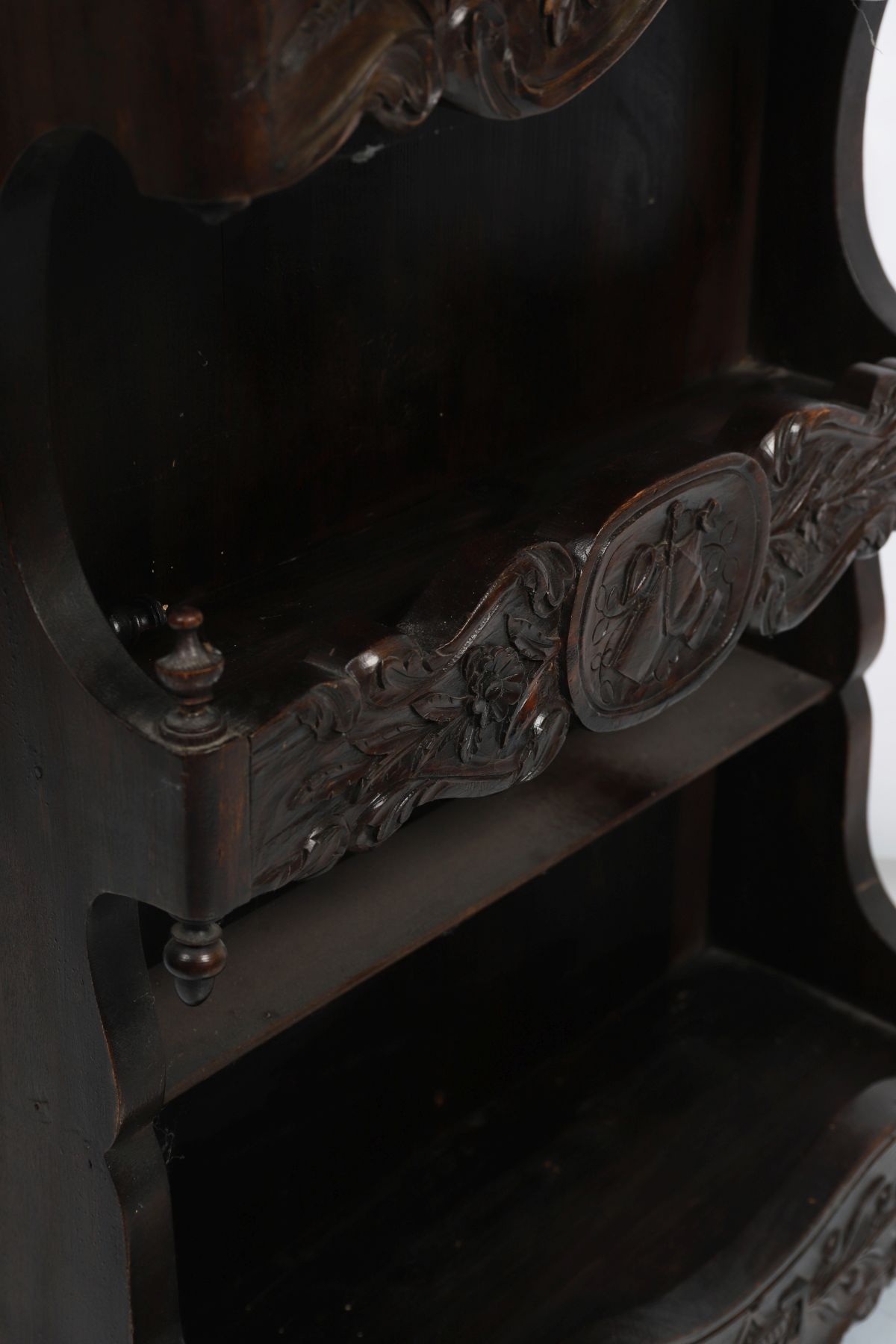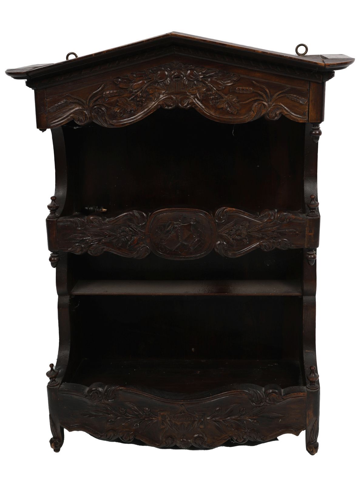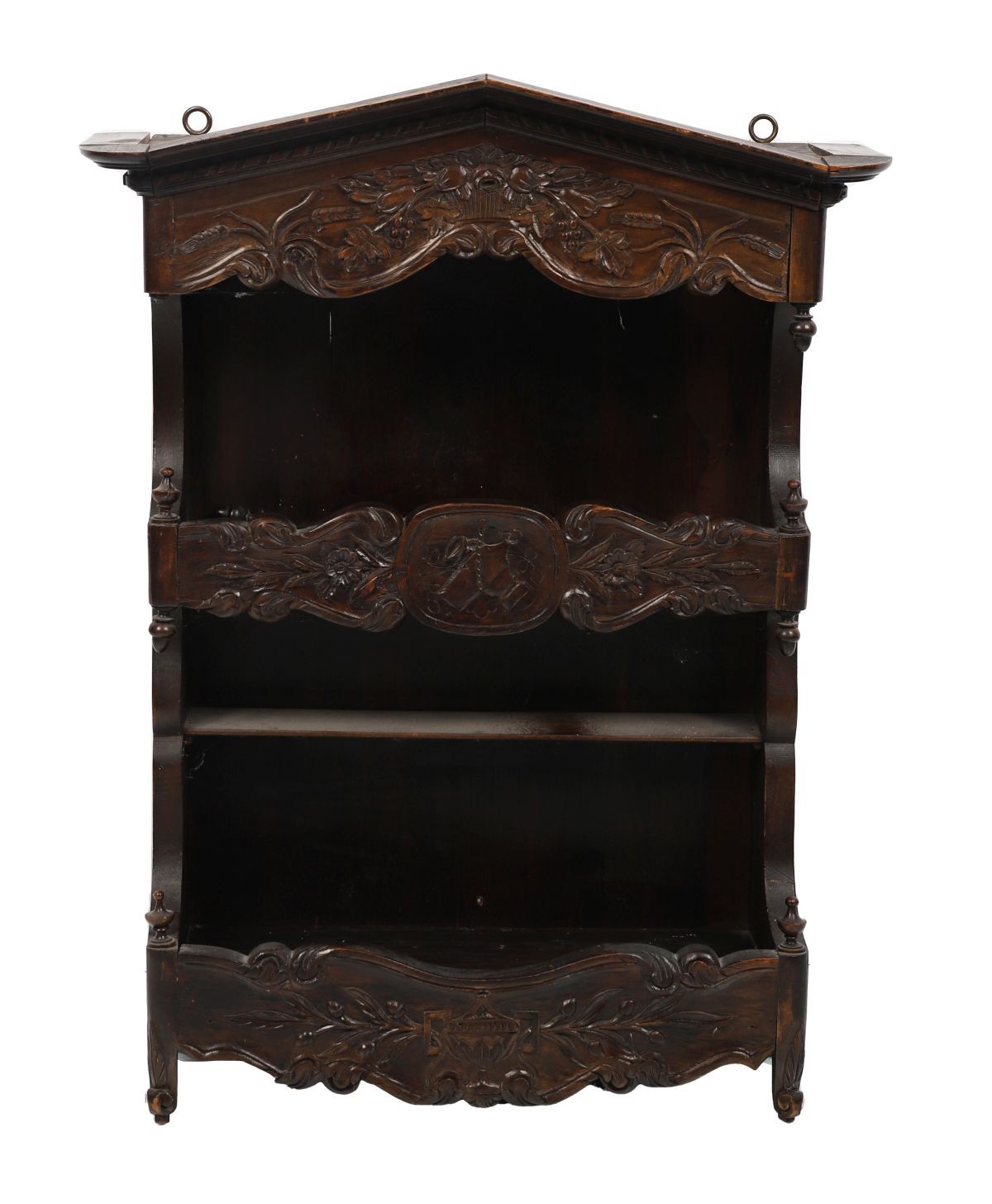 A French provincial carved wood hanging shelves, the upper section decorated with scrolling foliage and fruiting motifs, above shaped shelves, of open architectural form.