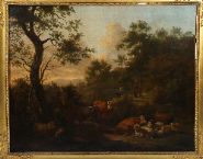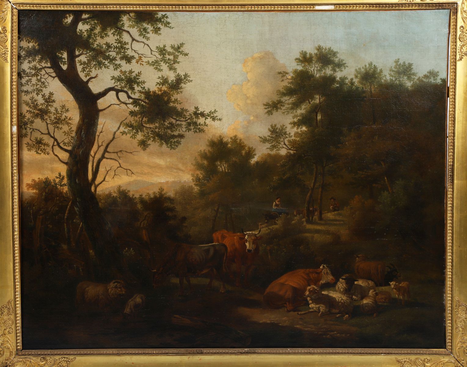 An oil on canvas landscape depicting a pastoral wooded scene with figures and cattle, painted in warm tonal hues, enclosed in a giltwood frame