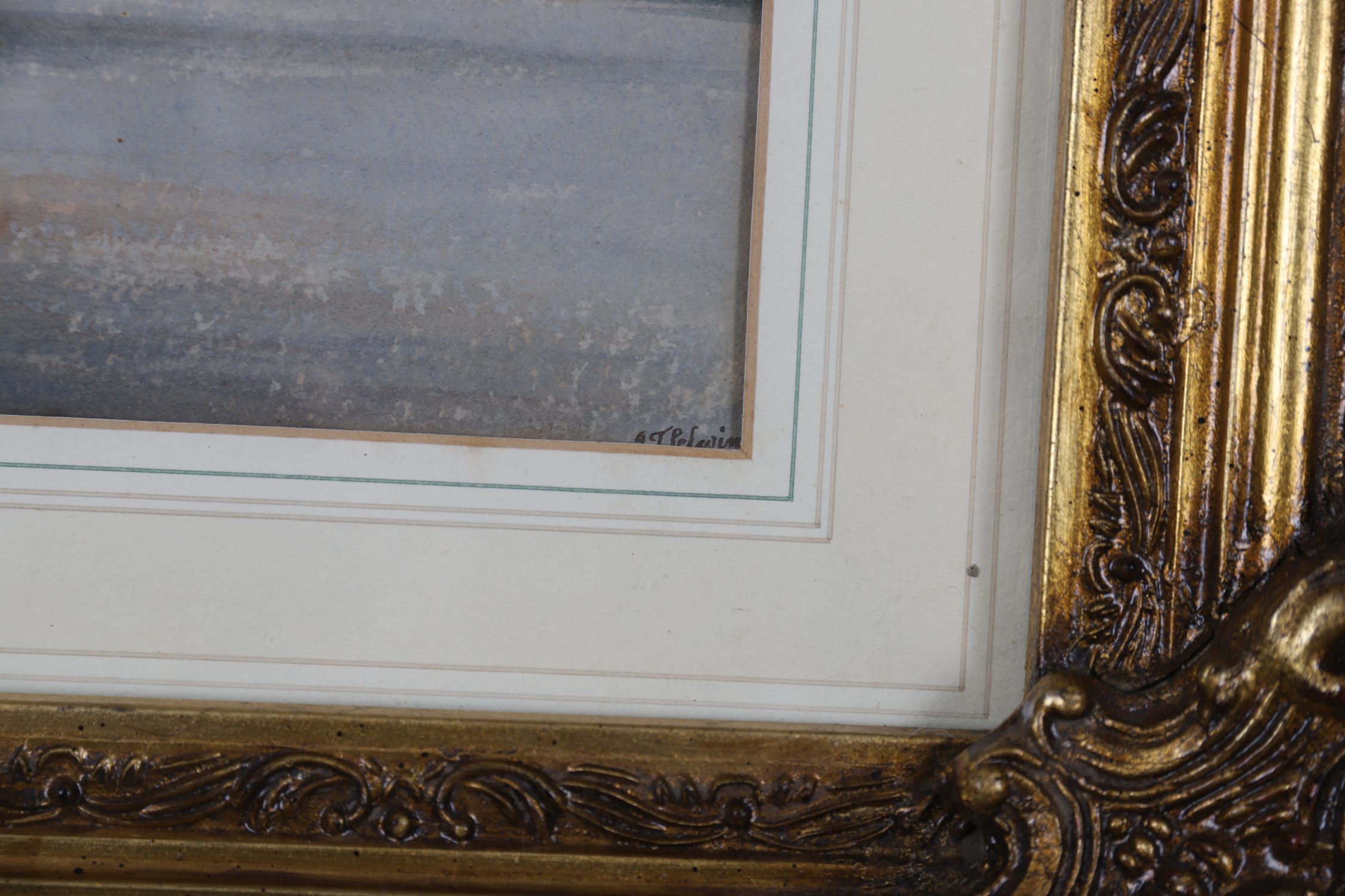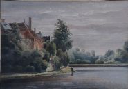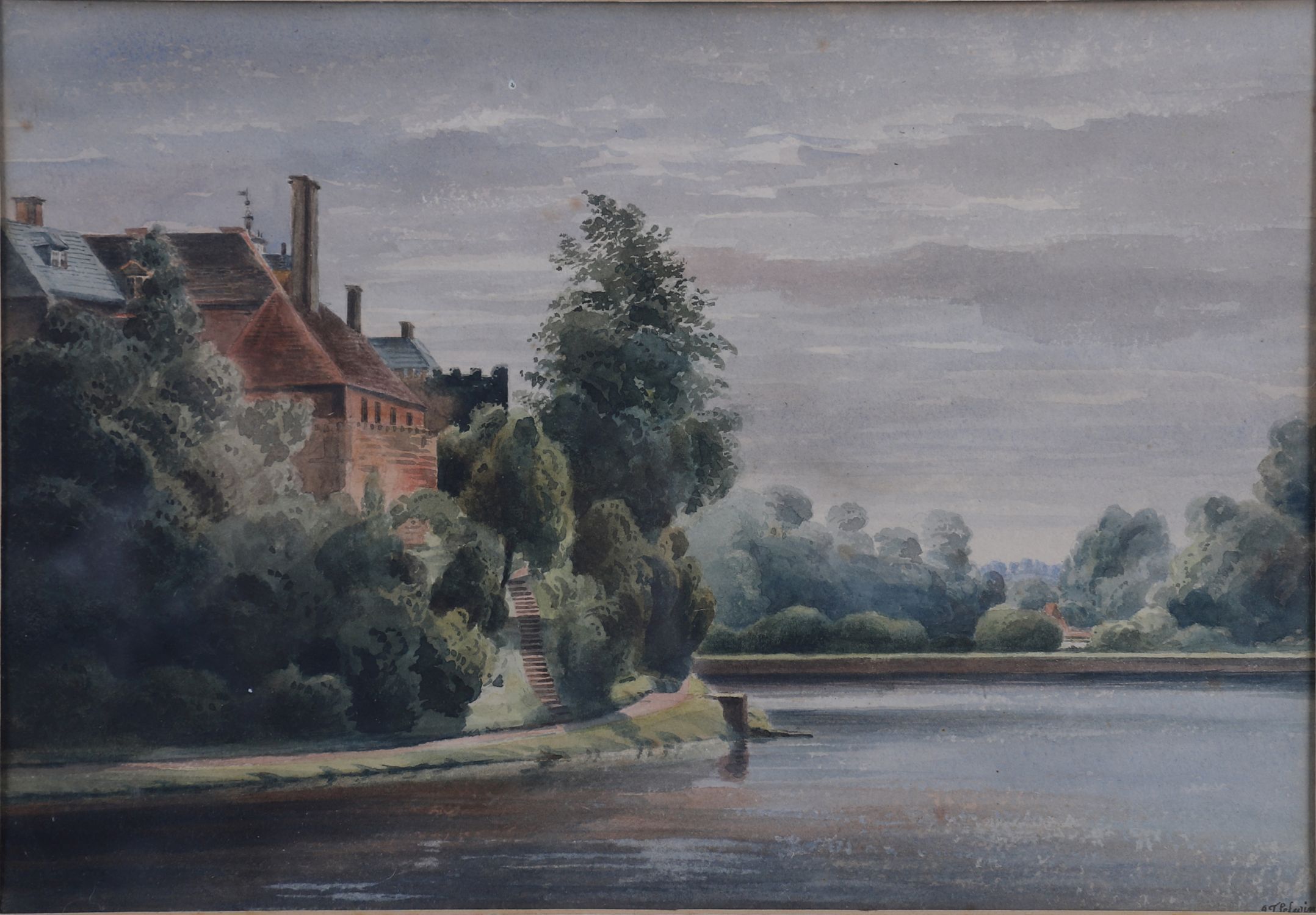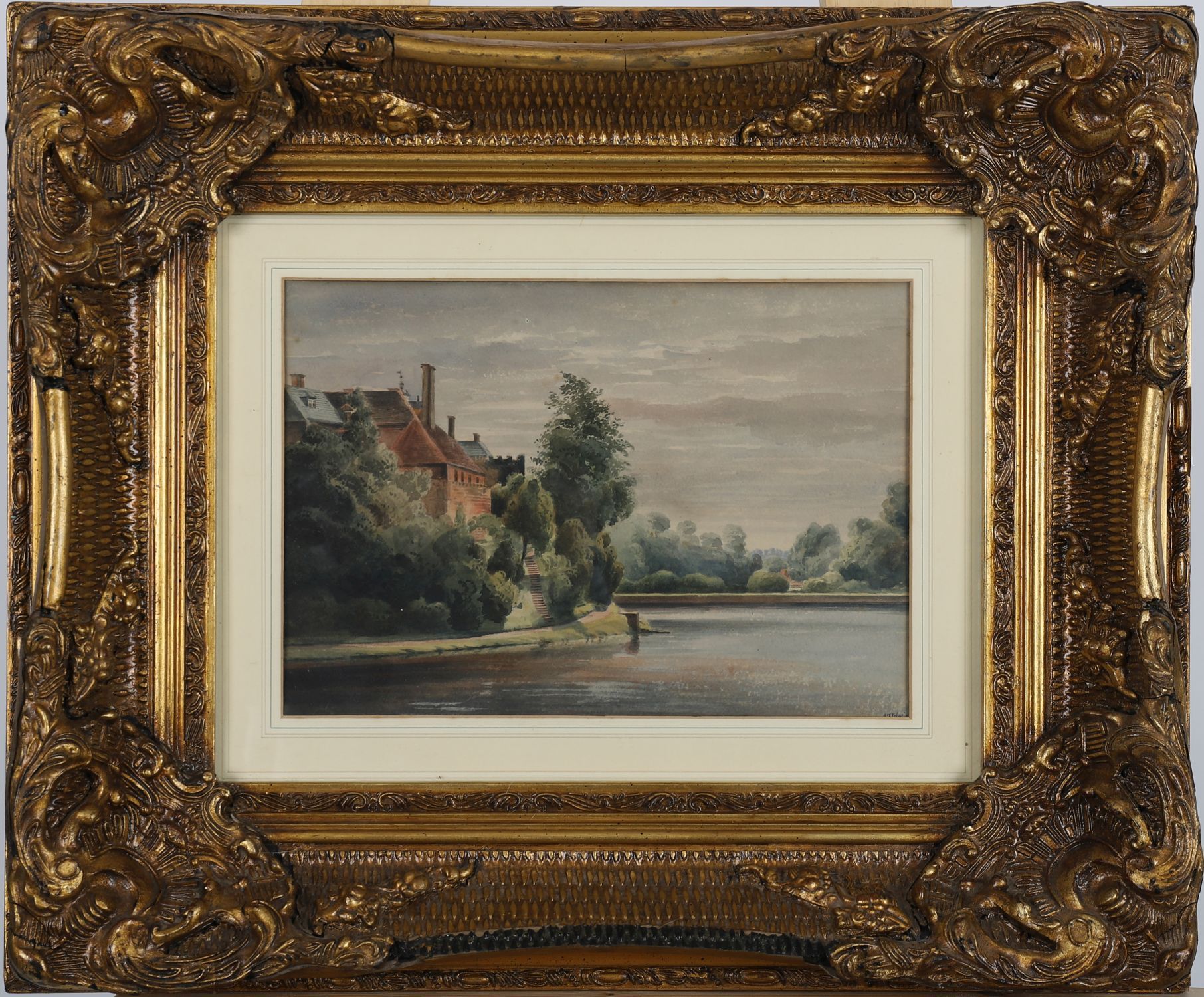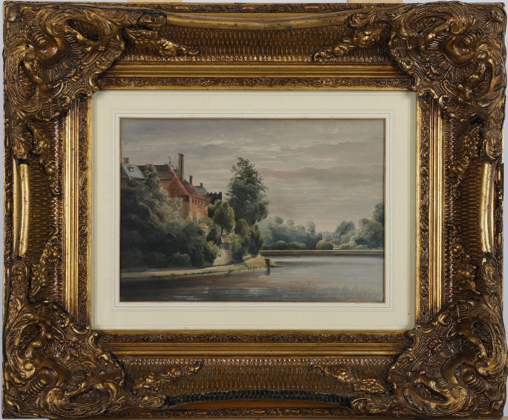 Watercolour, depicting a rural river landscape with trees and a large house beyond. Presented in a gilt frame with mount. Watercolour.