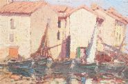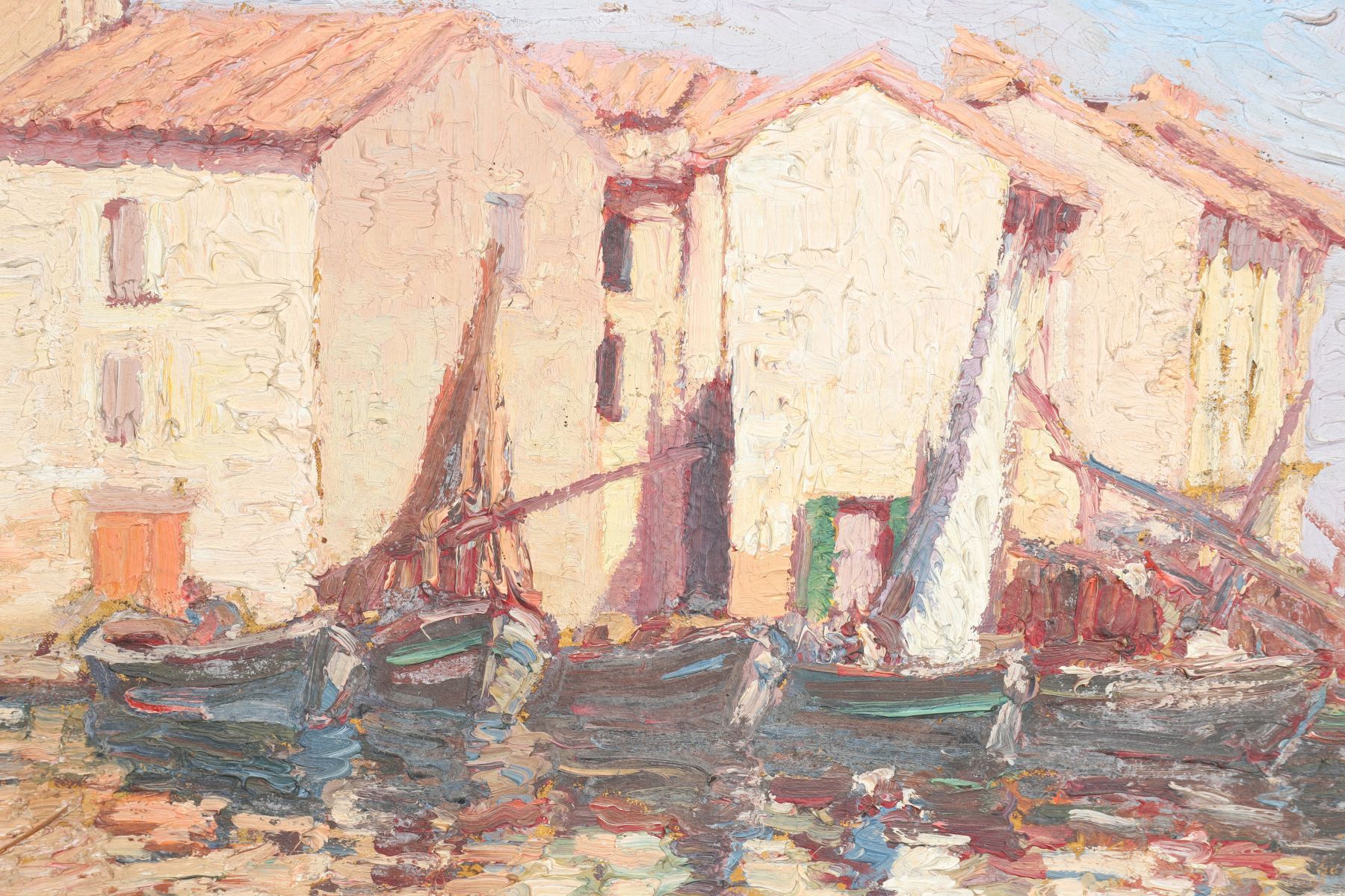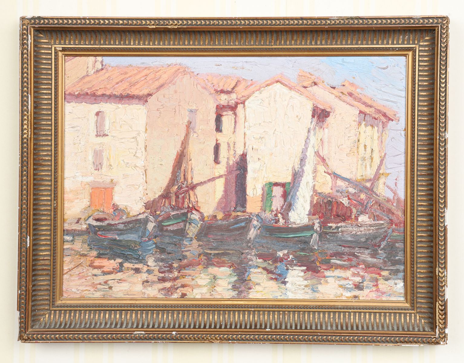 Sailing boats in a harbour. Oil on canvas. Enclosed in a gilt frame.