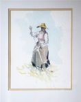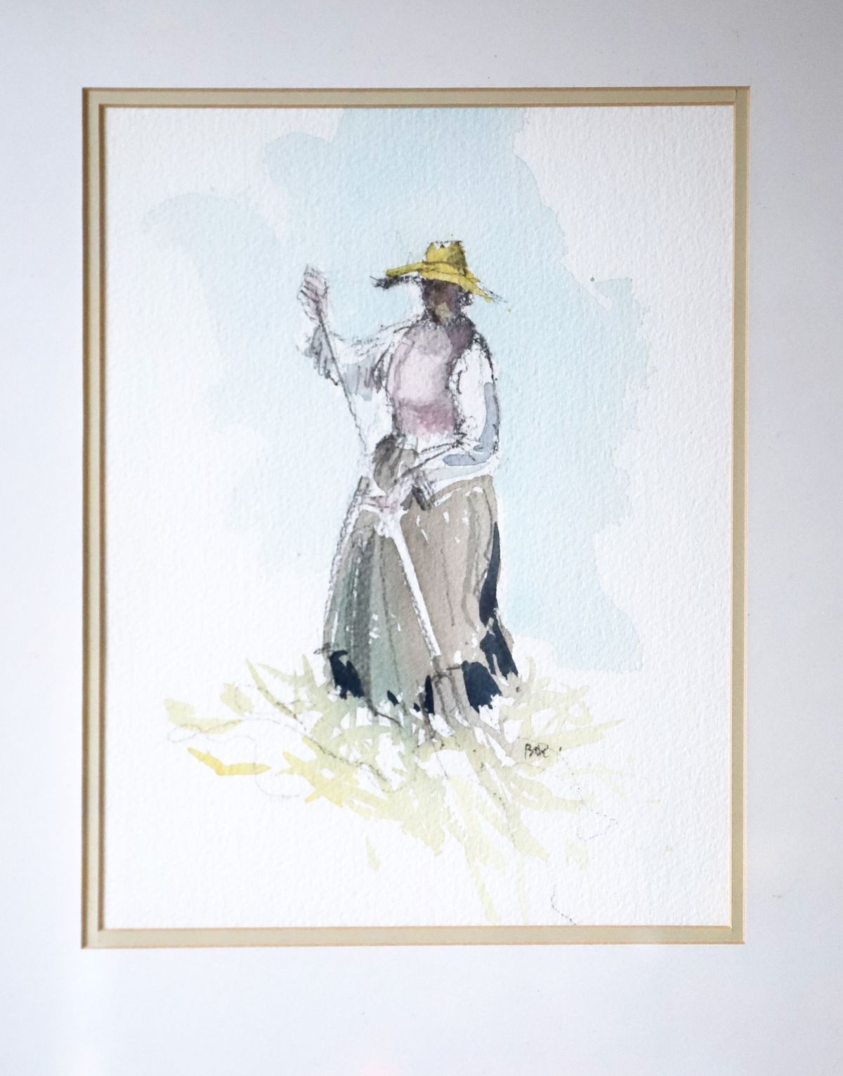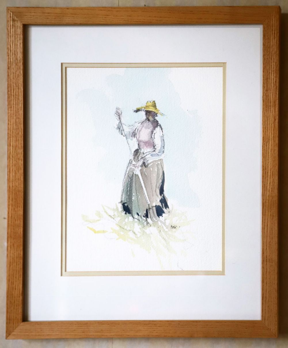 French School watercolour depicting a standing figure in a cornfield landscape, rendered in a loose, expressive manner. Signed.