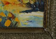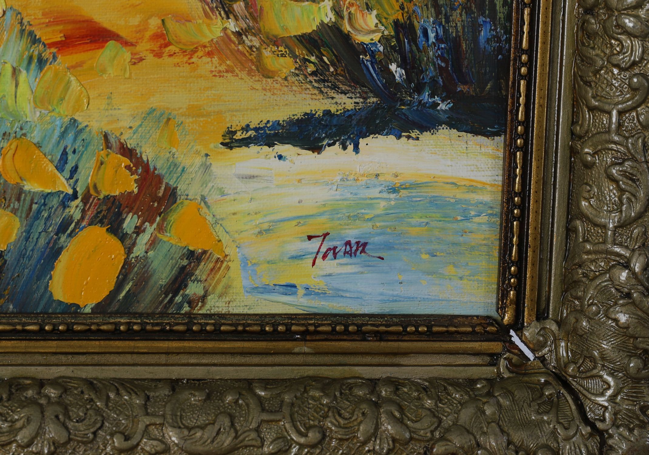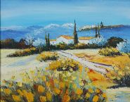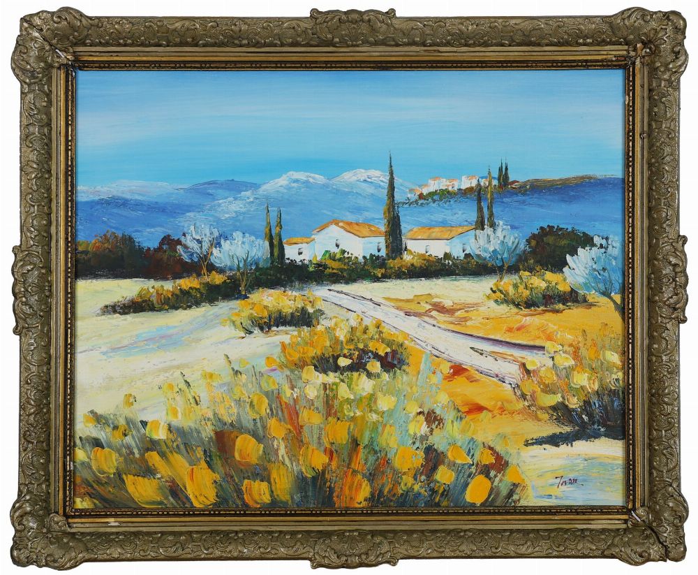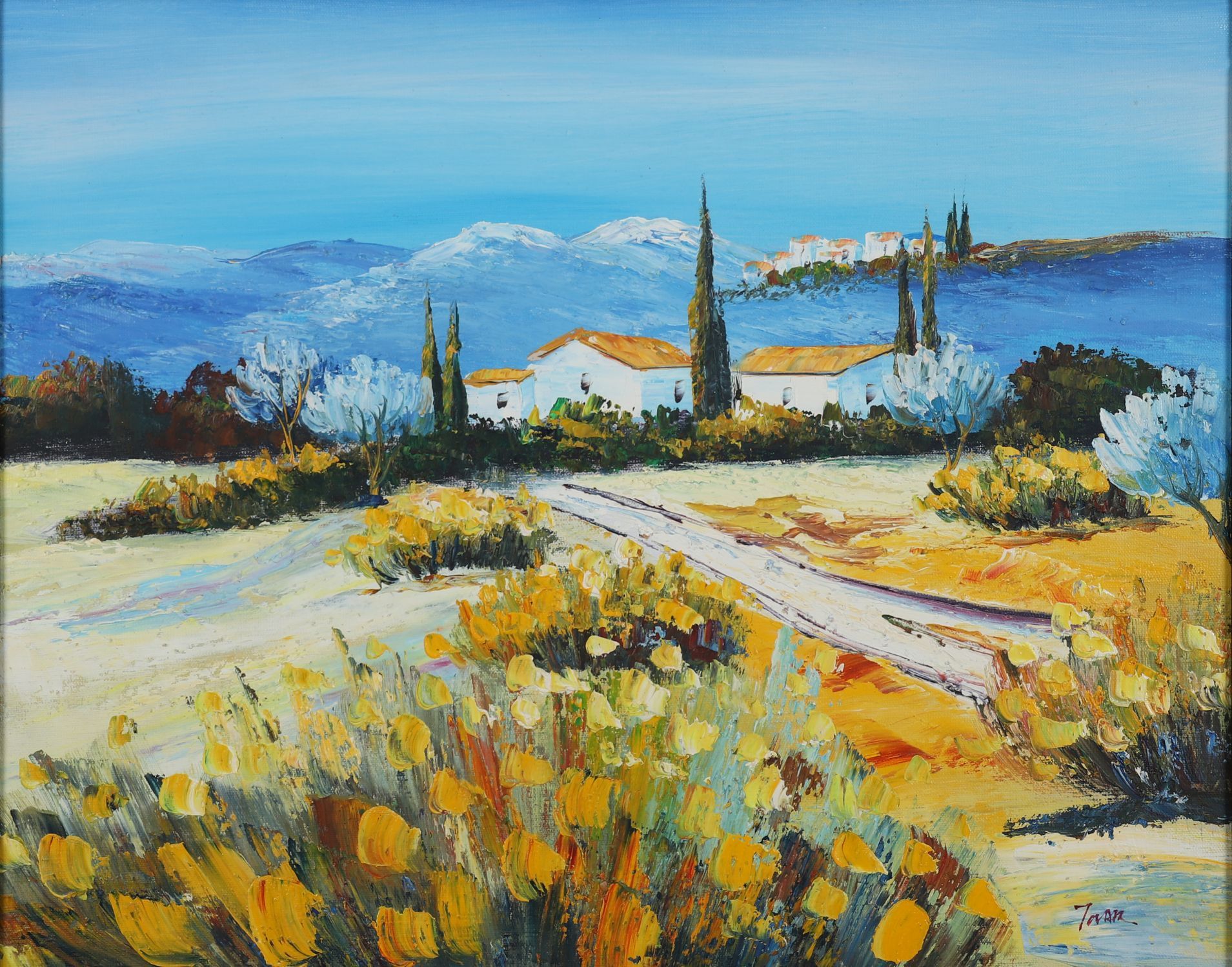 Oil on canvas, depicting a brightly coloured impressionist landscape with cypress trees, cottages, and distant mountains, in strong yellows and blues. Framed. Signed lower left. Oil on canvas.