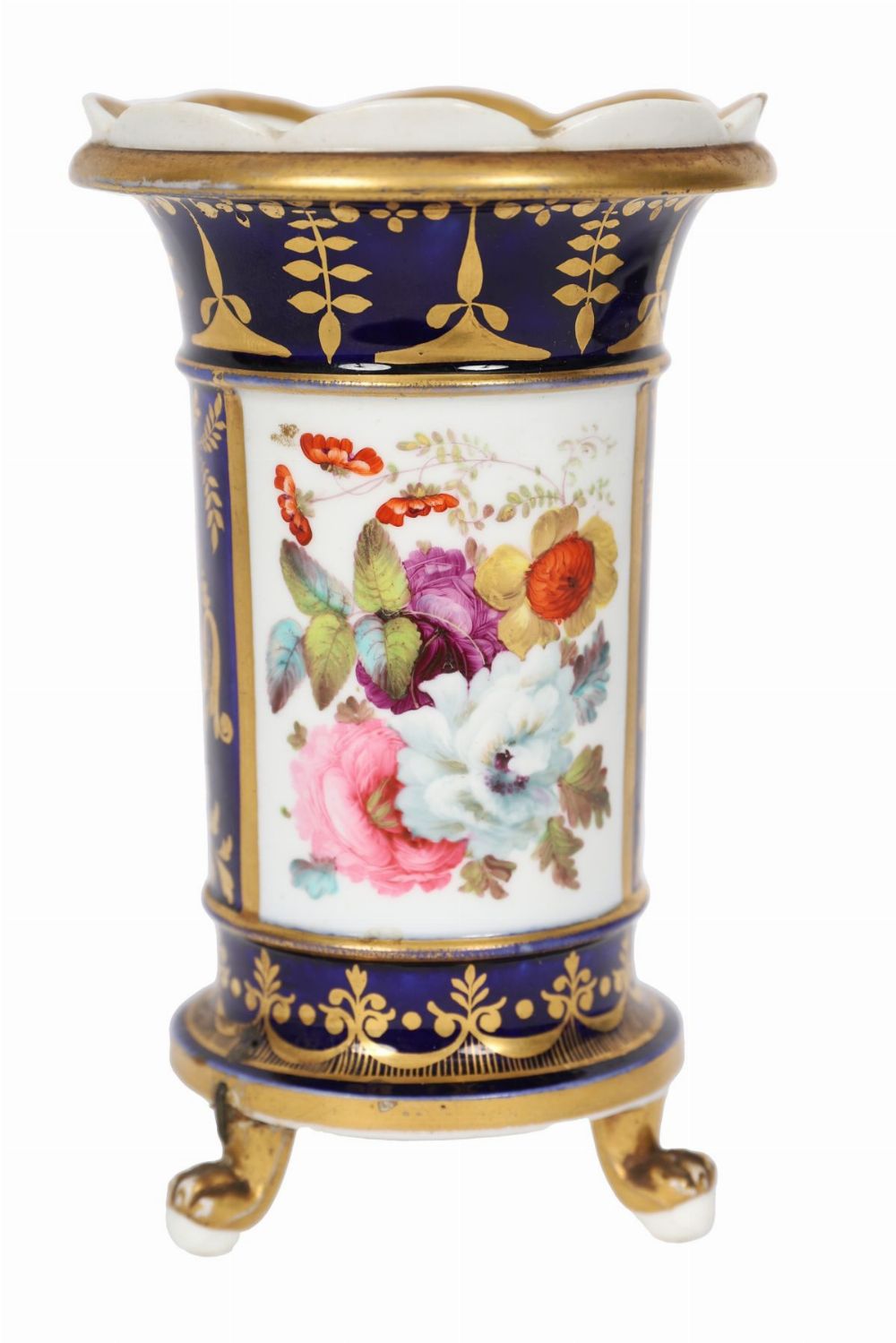 A French Sèvres-style porcelain vase of cylindrical form, decorated with a central floral panel against a cobalt blue ground with gilt foliate borders, raised on scroll feet.