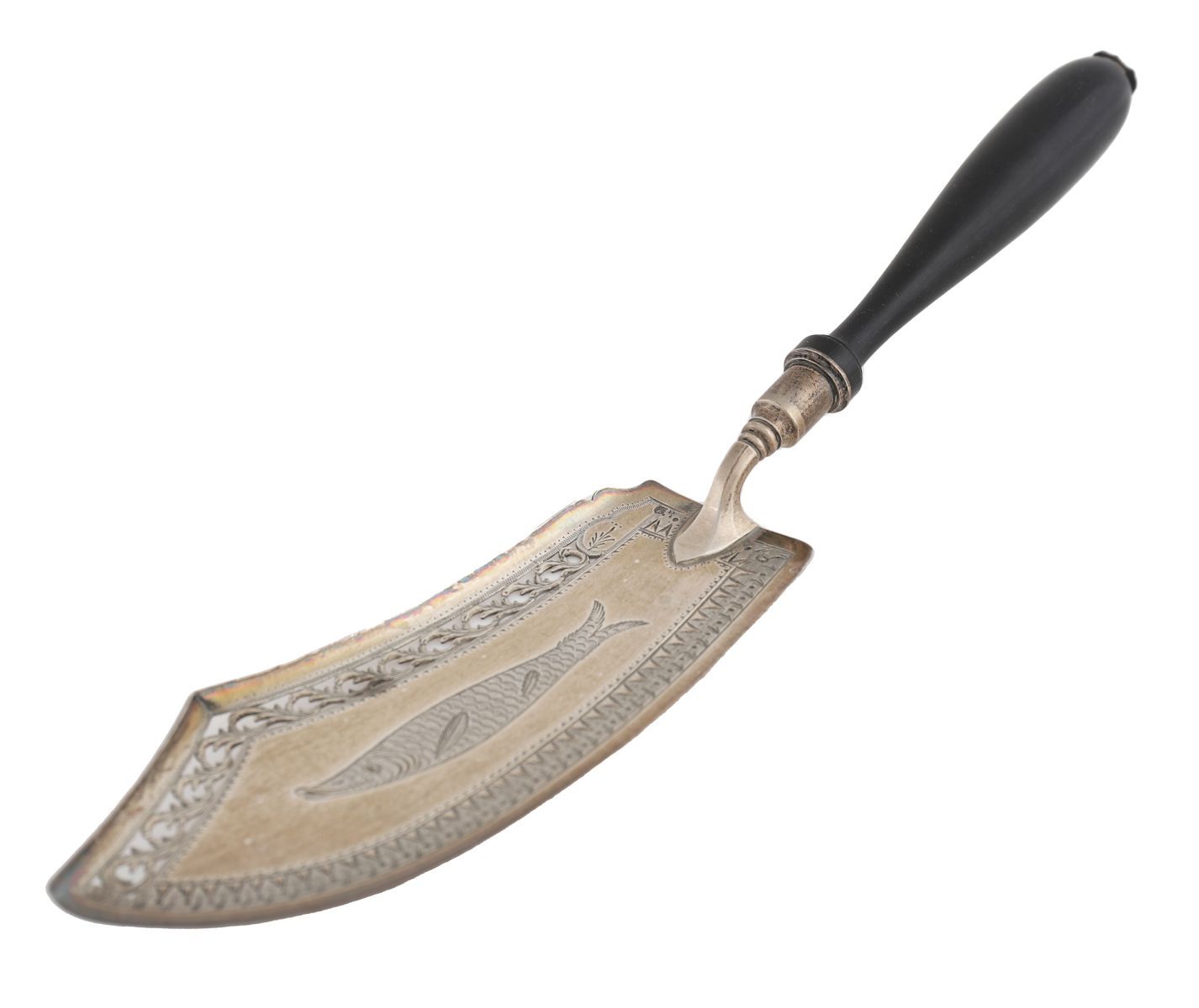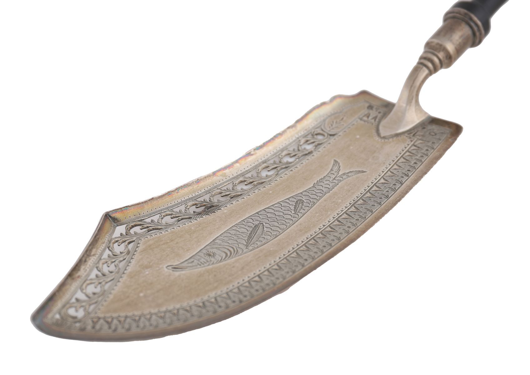 Marks: struck with the Minerva head (1st standard French silver mark) and maker’s lozenge and later stamped with a French swan control mark for imported silver. The shaped silver blade is finely pierced and engraved with a fish amid scrolling foliate borders, echoing its use in the fish course. The handle is of turned dark wood (likely ebony), ending in a rounded finial. Length: 34 cm (13½ in). Weight: approximately 130–150 g (gross).