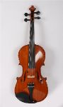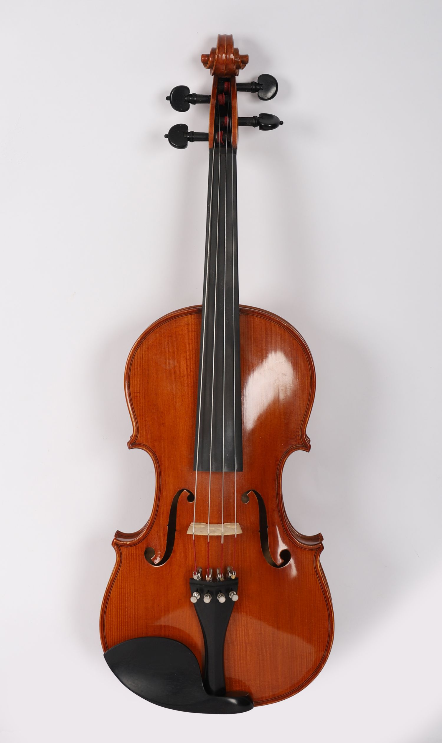 A full-size violin with dark amber varnish, fine tuner tailpiece, and ebonised fittings, housed in a padded case with bow. No maker's label visible.