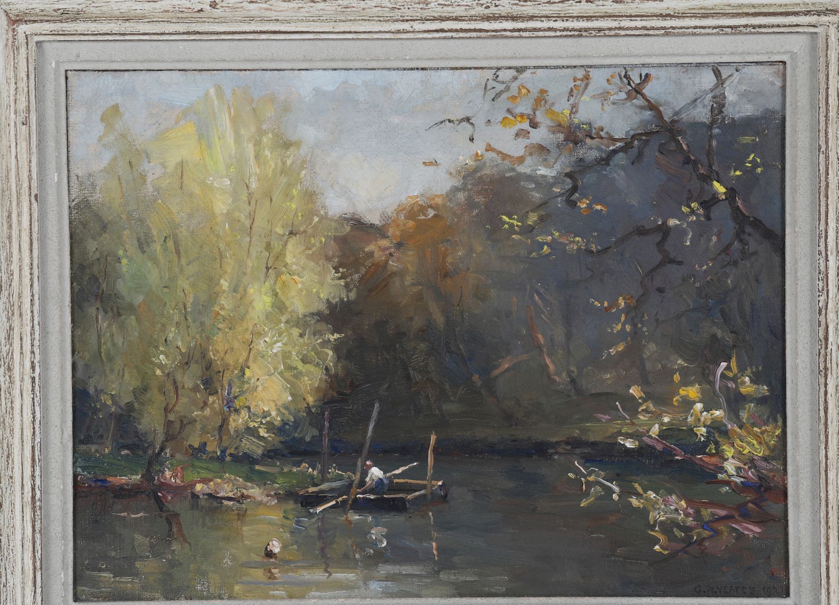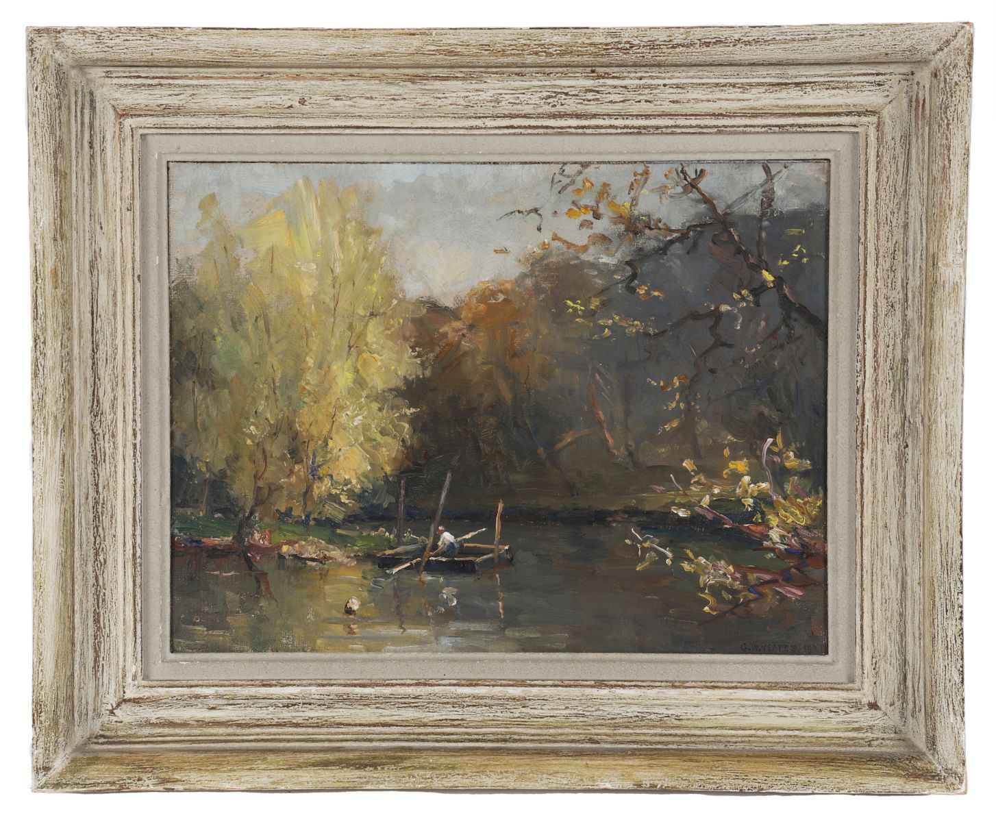 Figure in a boat on a river with dense trees, oil on board, signed bottom right, dated 1931, enclosed in a partially painted moulded frame.
