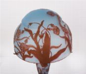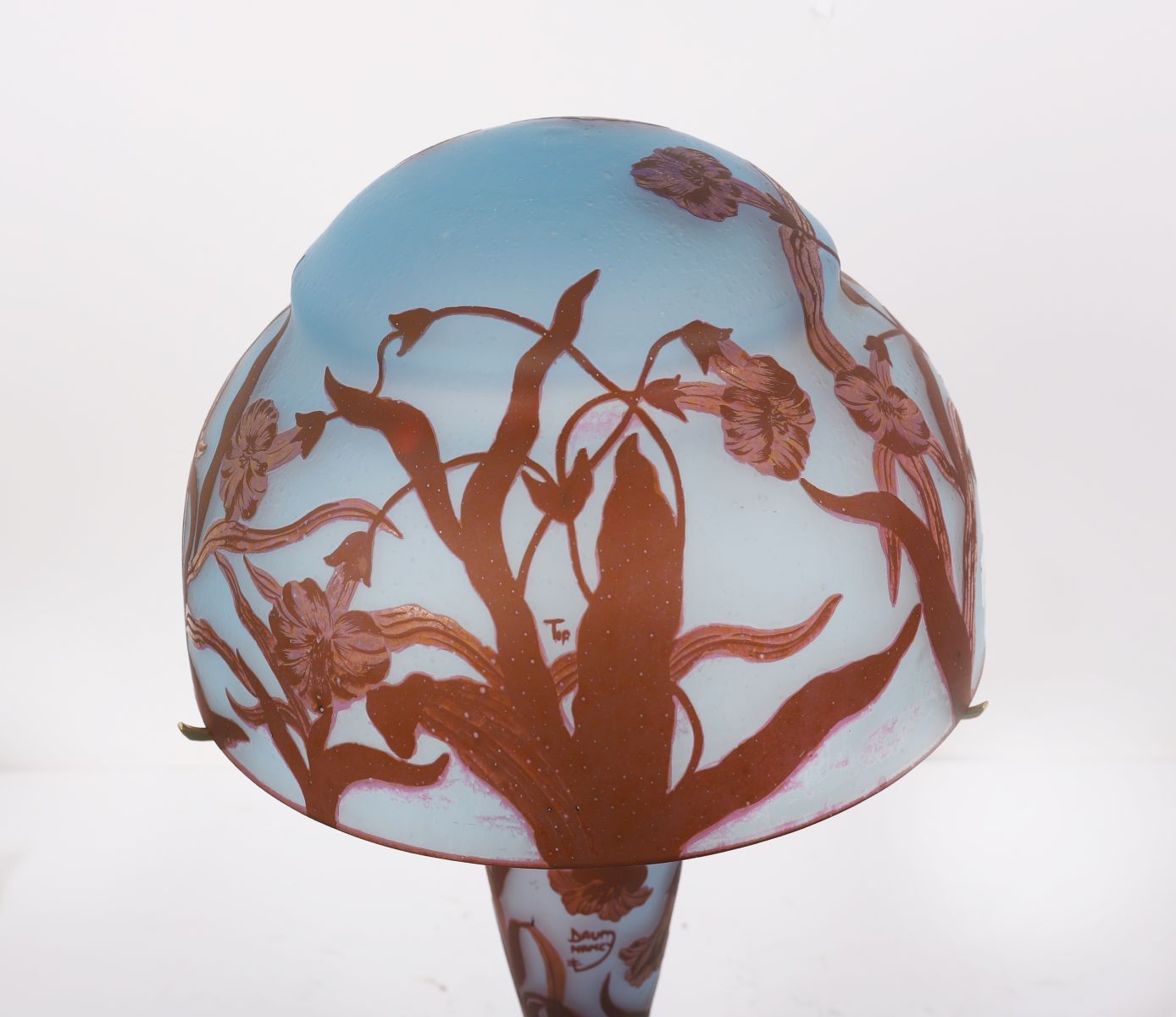 Two-colour cameo glass lamp decorated with floral motifs on blue and brown ground, signed in the style of Gallé. Electrified, early 20th century.