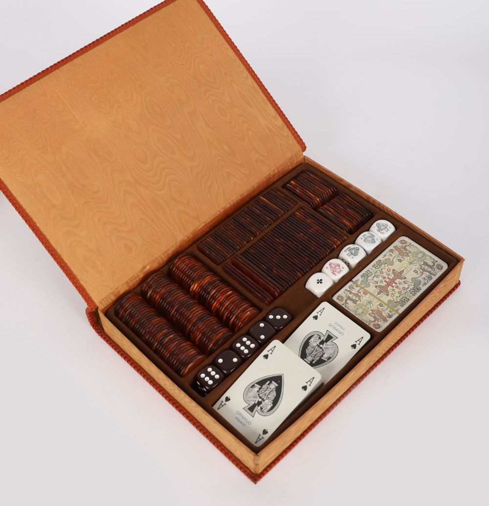 A mid-20th century games compendium in tooled velvet case, fitted with sets of playing cards, dice, and faux tortoiseshell gaming counters, complete with compartmented tray. Retains original Grimaud playing cards.