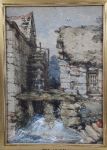 Watercolour depicting a rustic mill building beside a stream, with architectural ruin and flowing water rendered in rich brown and grey tones.