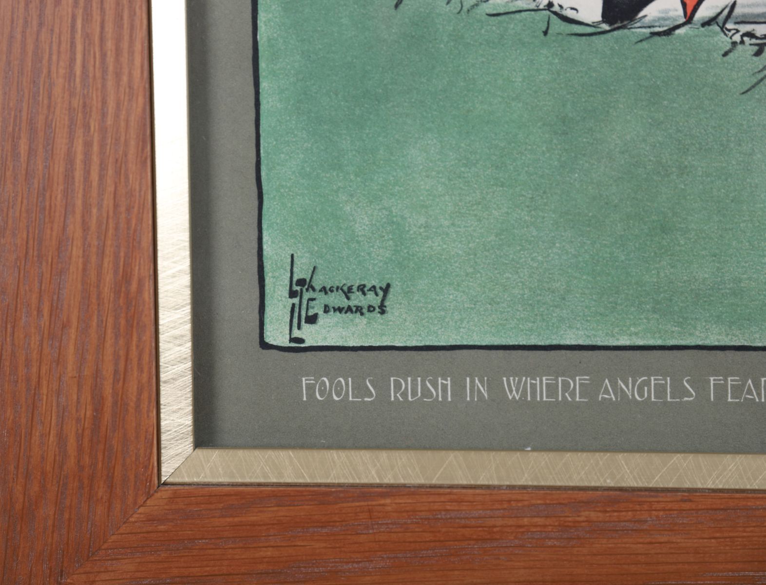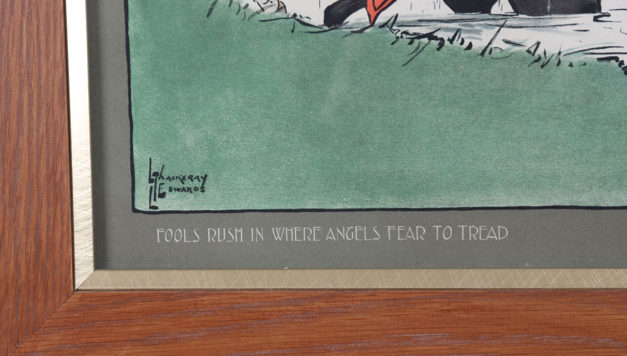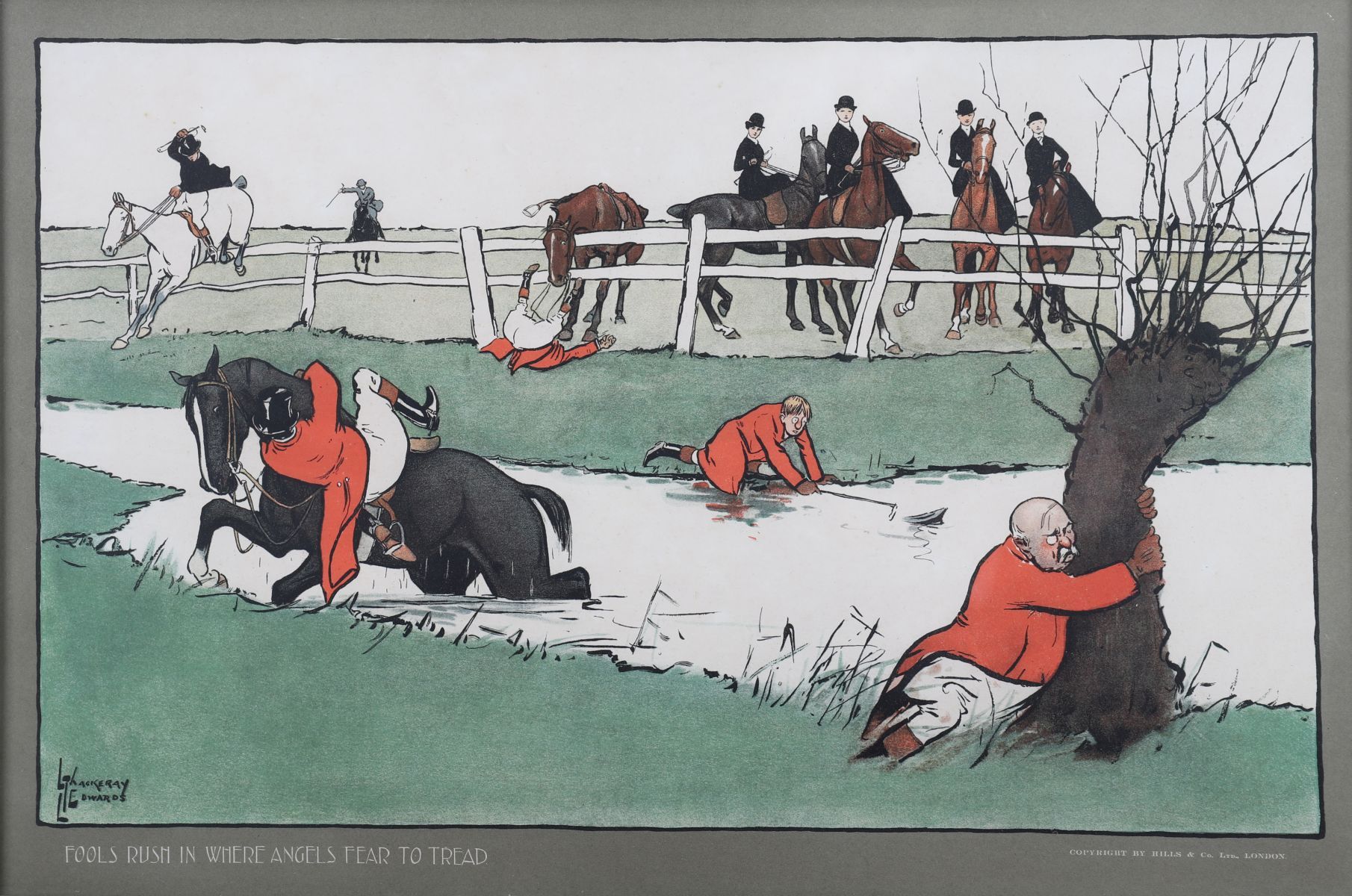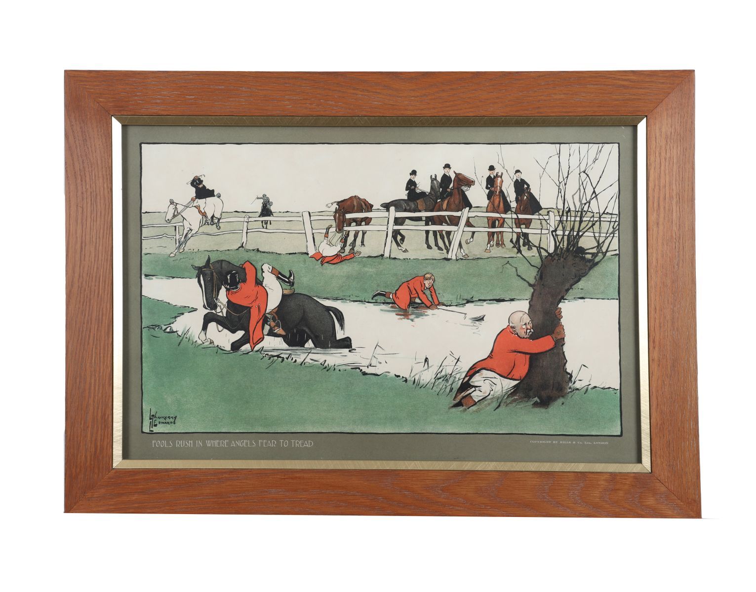 A coloured print after George Denholm Armour, titled Fools Rush in Where Angels Fear to Tread, depicting humorous hunting misadventure with riders and hounds in pursuit. Presented in a contemporary oak frame.