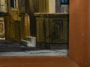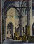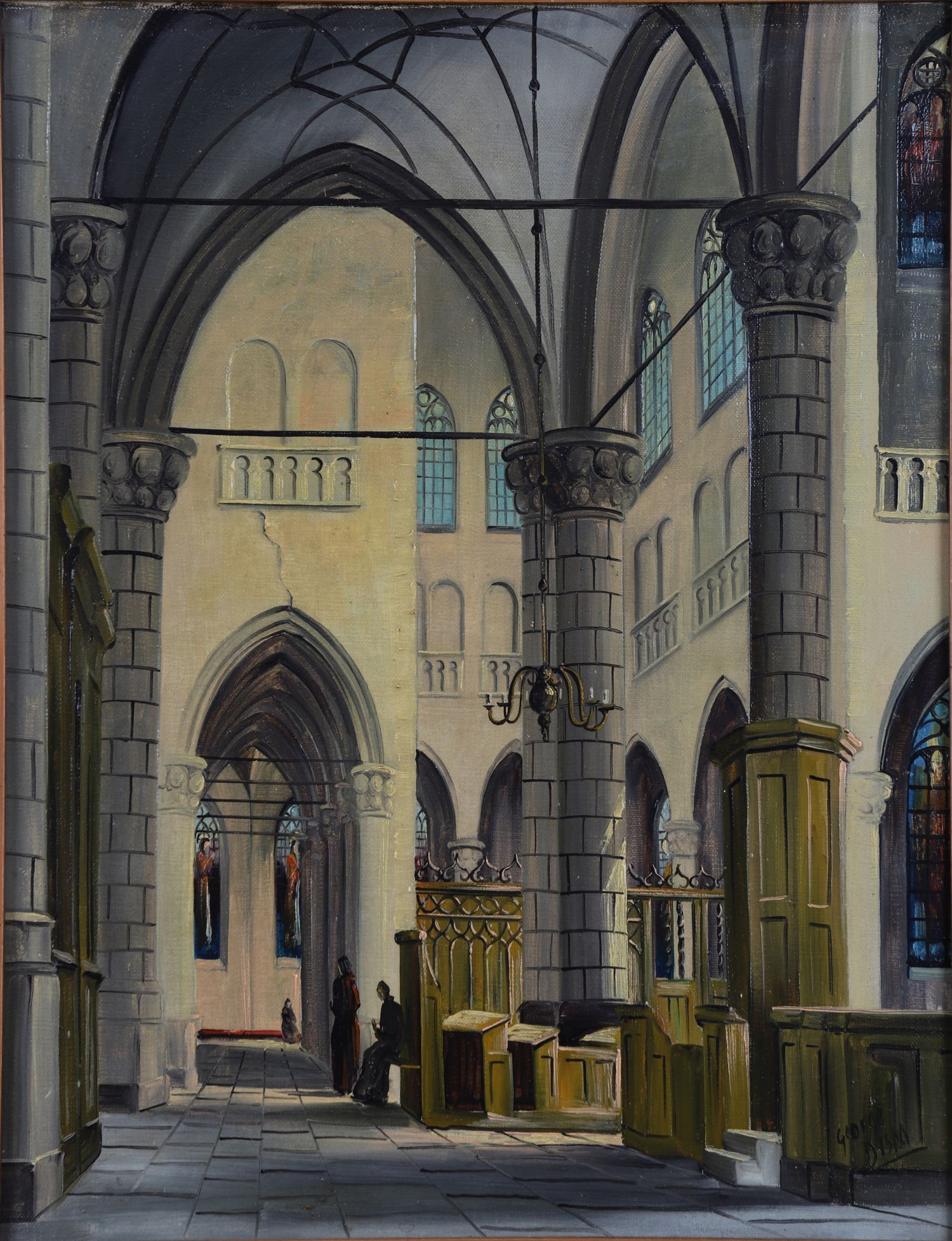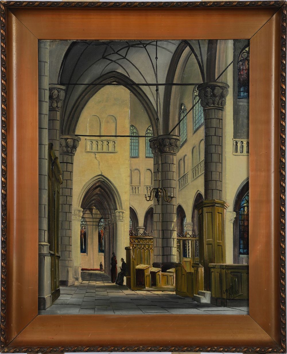 A realistic oil on canvas depicting the interior of a church with tall arches, wooden pews, chandeliers, and stained-glass windows. Presented in a copper-toned frame. Signed oil on canvas.
