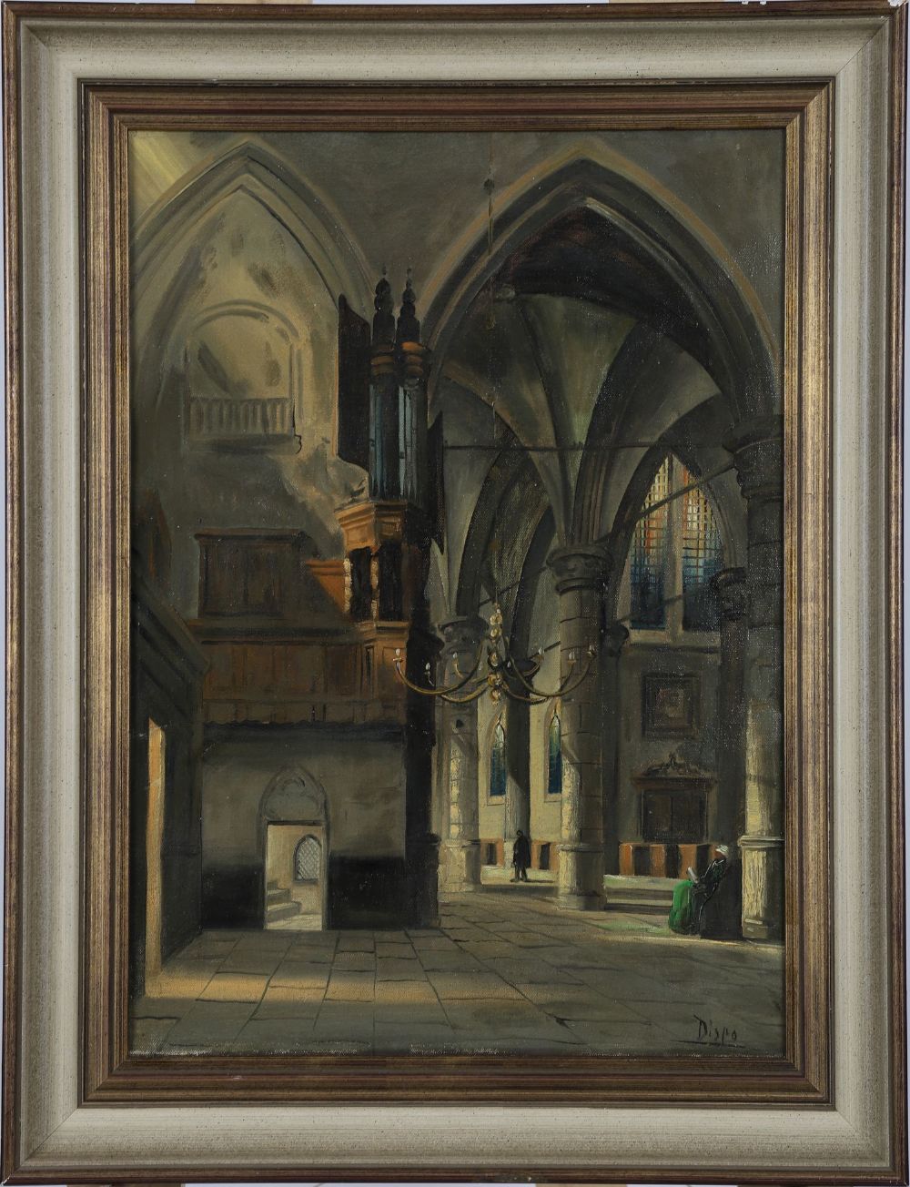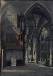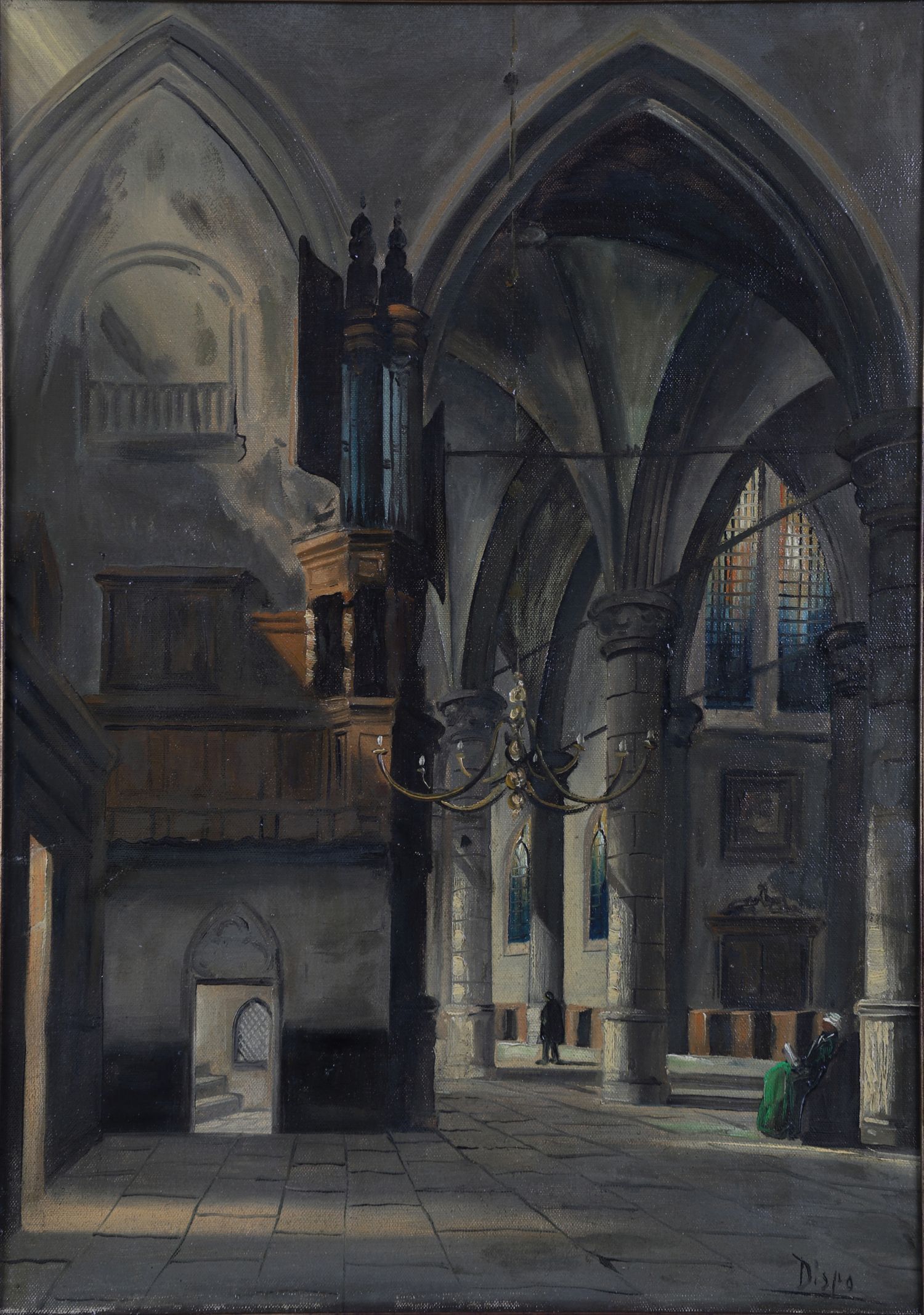 A detailed oil painting showing the interior of a cathedral with a grand organ and vaulted arches, figures in the background, and a seated woman in green. Signed lower right. Framed. Oil on canvas.