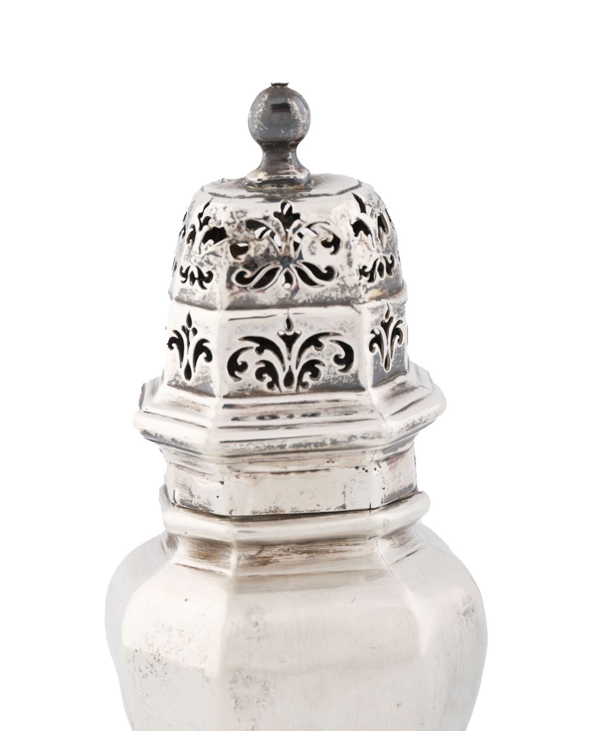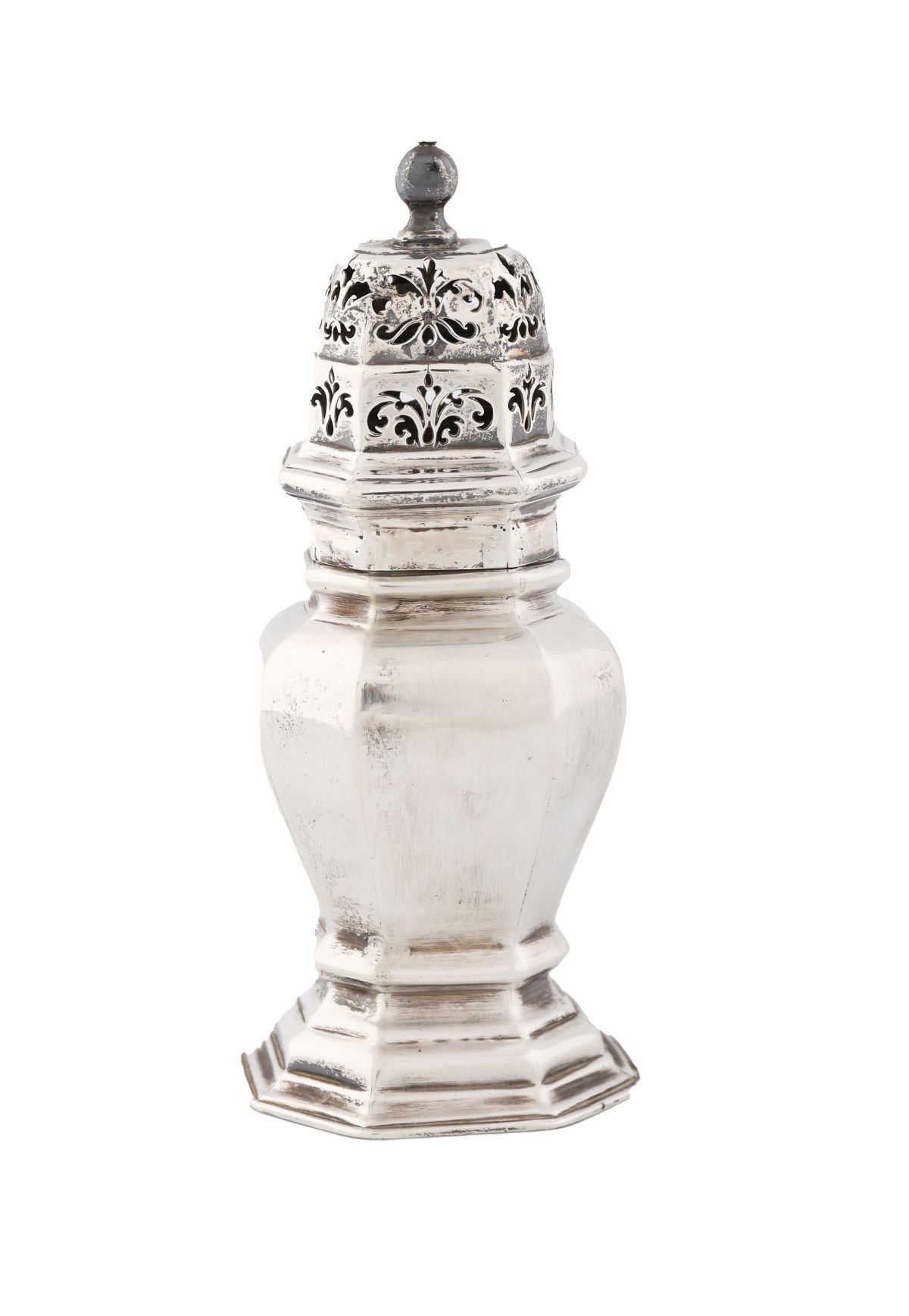 A George I octagonal silver sugar caster, mark of Joseph Ward (Grimwade 3856), London, 1719. With panelled sides, domed pierced cover, and knob finial. 202 g (6½ oz)