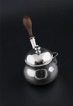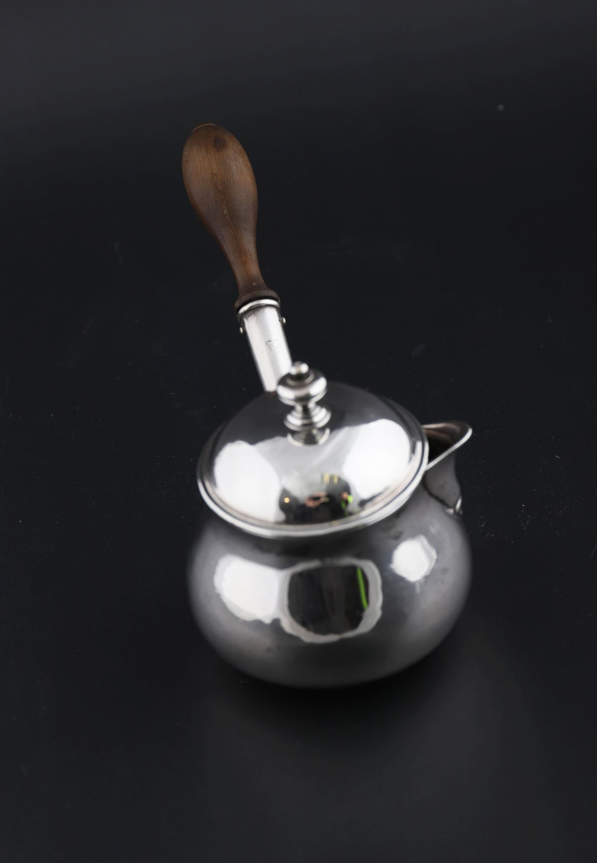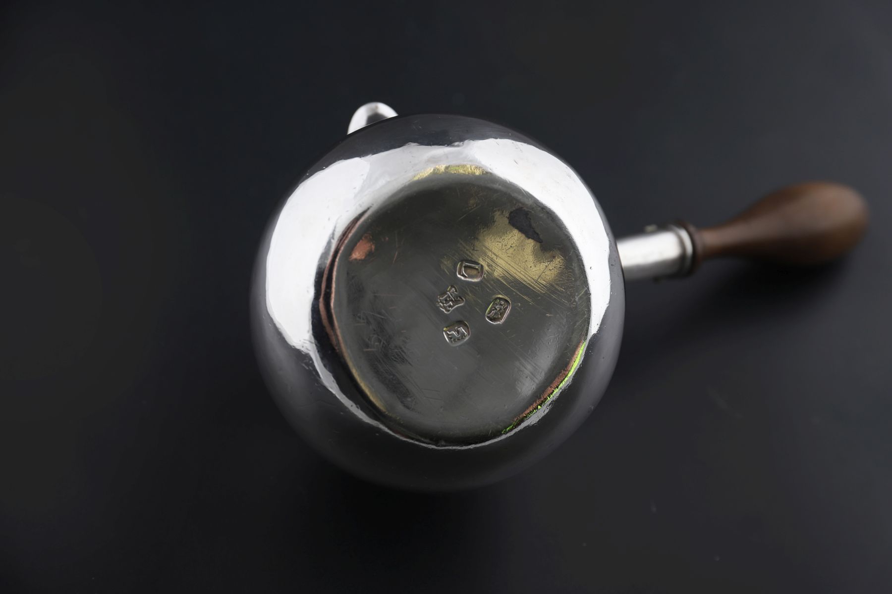 A George I small silver brandy saucepan and cover, William Fleming, London, 1726, Britannia standard. Baluster form with part-wood baluster handle and detachable cover with finial. 177 grams (5 oz)