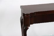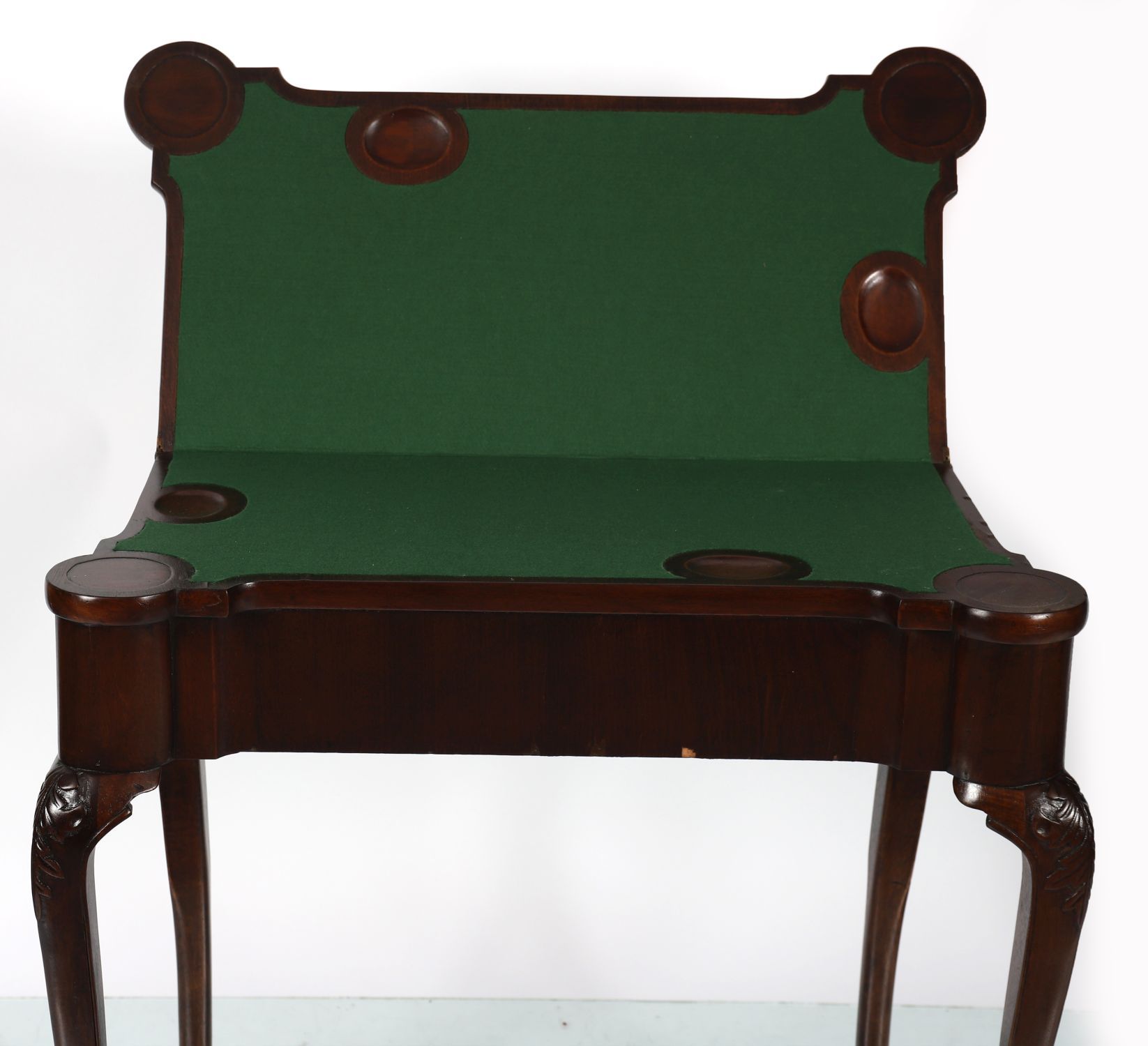 A fine George II mahogany fold-over games table, the hinged rectangular top opening to reveal a baize-lined interior with counter wells, raised on cabriole legs carved with shell motifs.