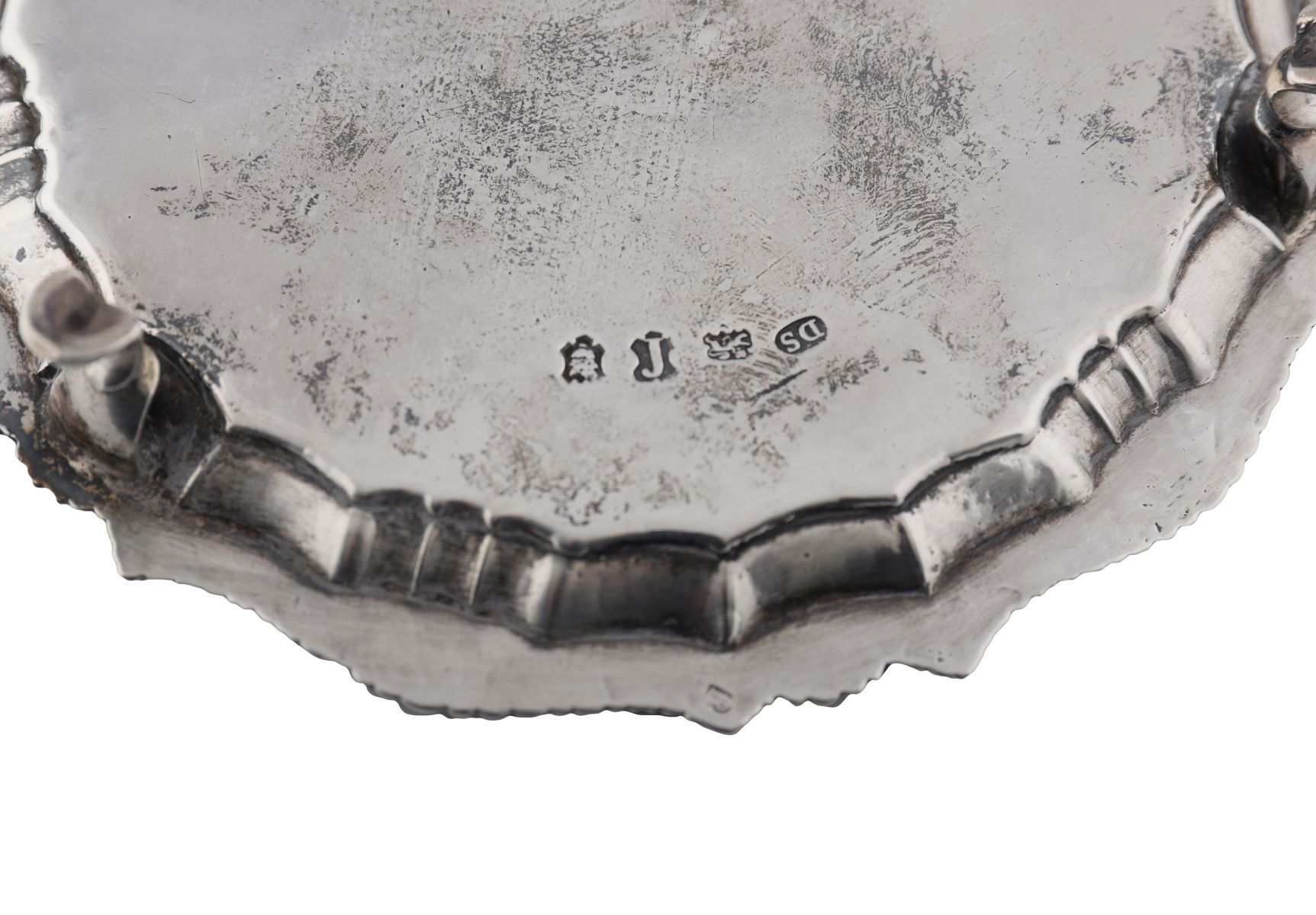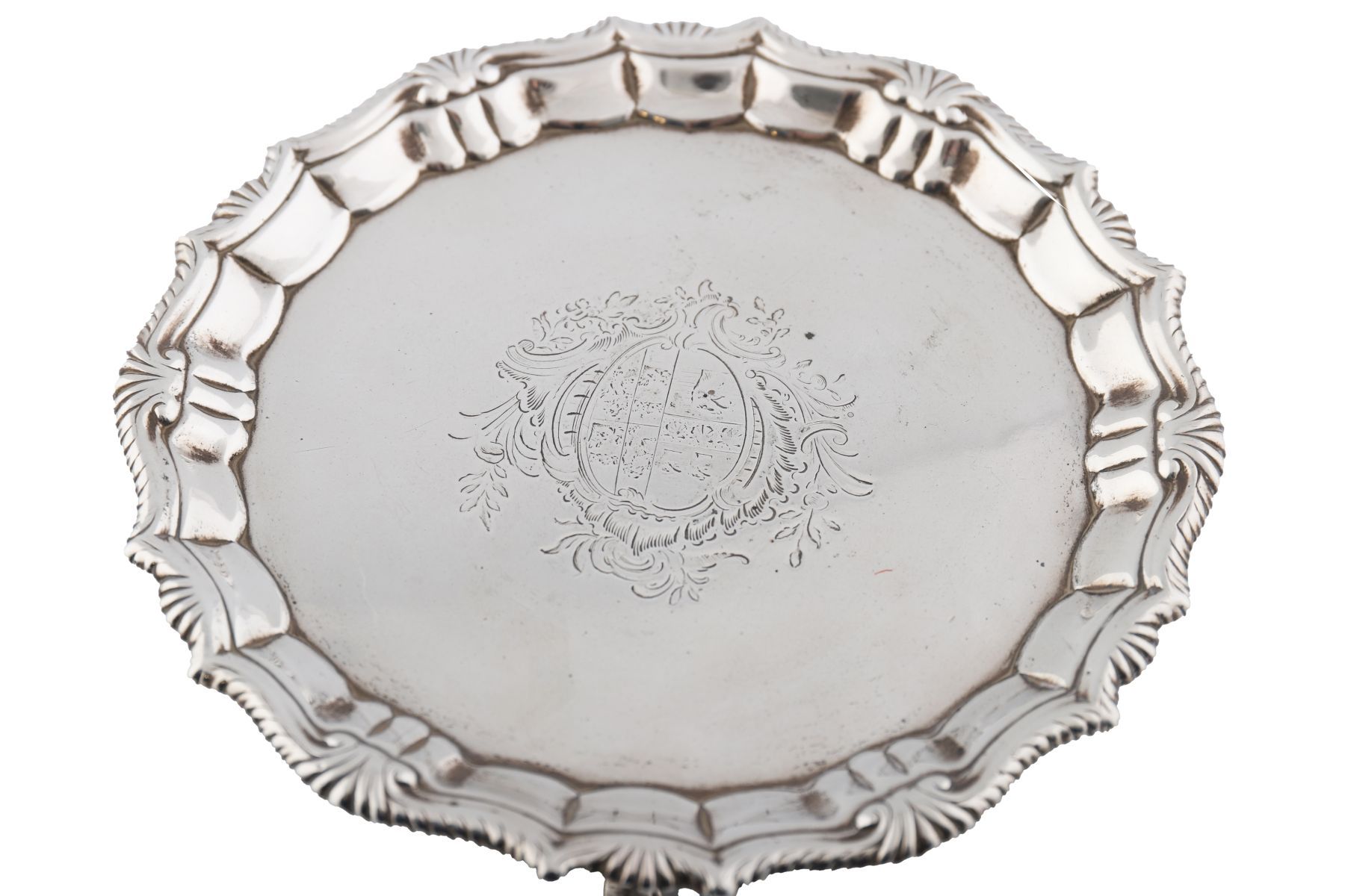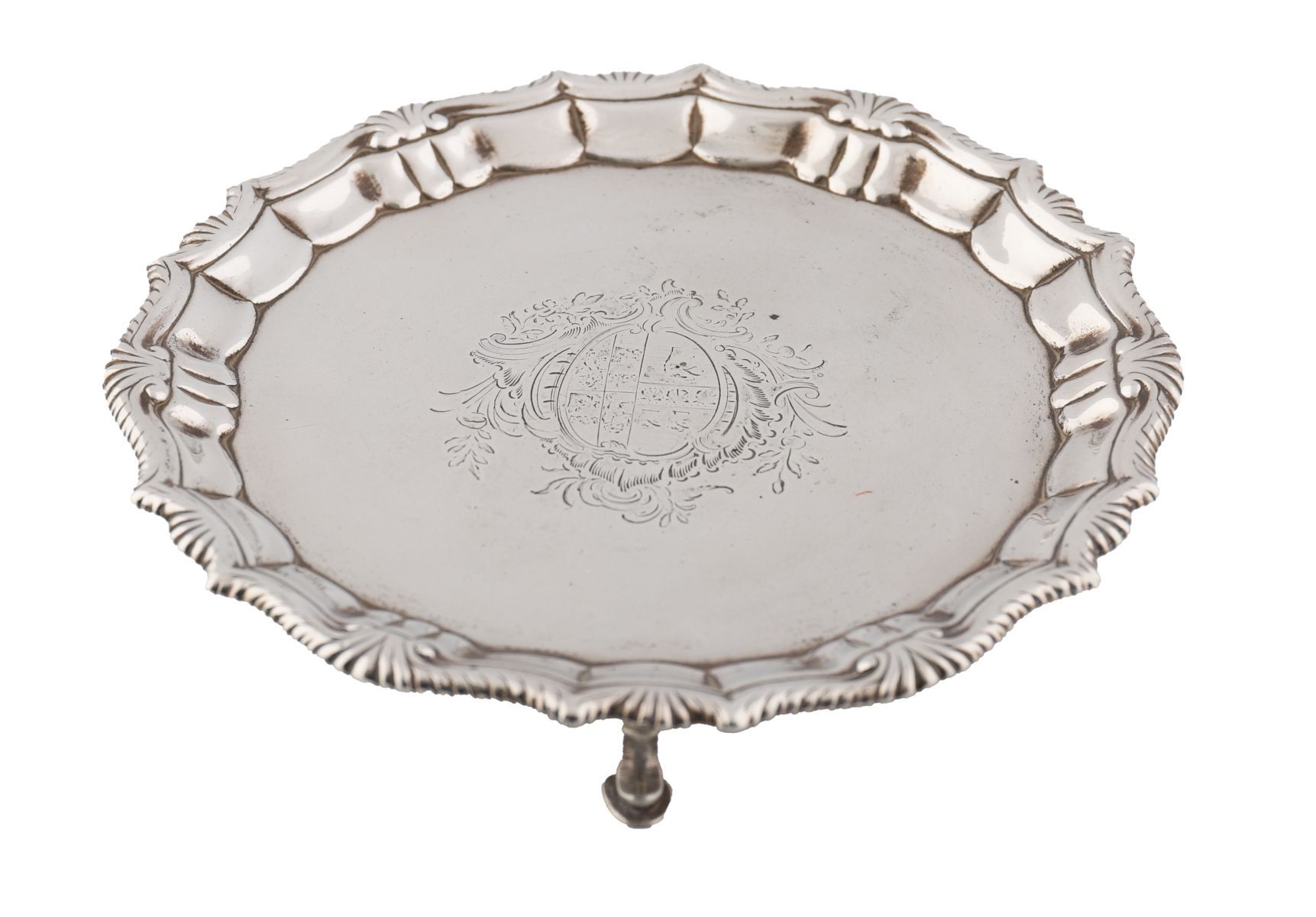 A George II silver card tray by Dorothy Sarbitt, of shaped circular form with moulded and scalloped rim, engraved with an armorial crest to the centre, raised on three hoof feet. Weight 223g