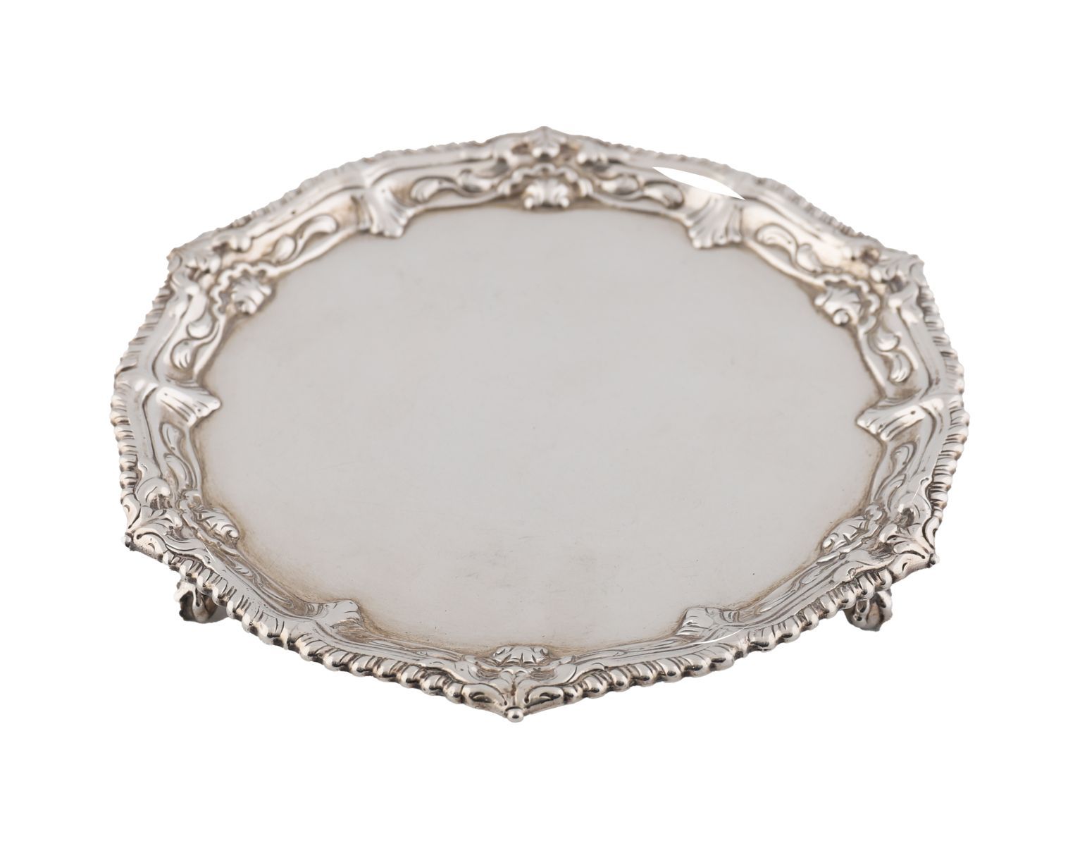 A George II silver card tray by Ebenezer Coker, of circular form with bold rococo shell and scroll border, raised on three acanthus-capped feet. 266 grams.