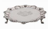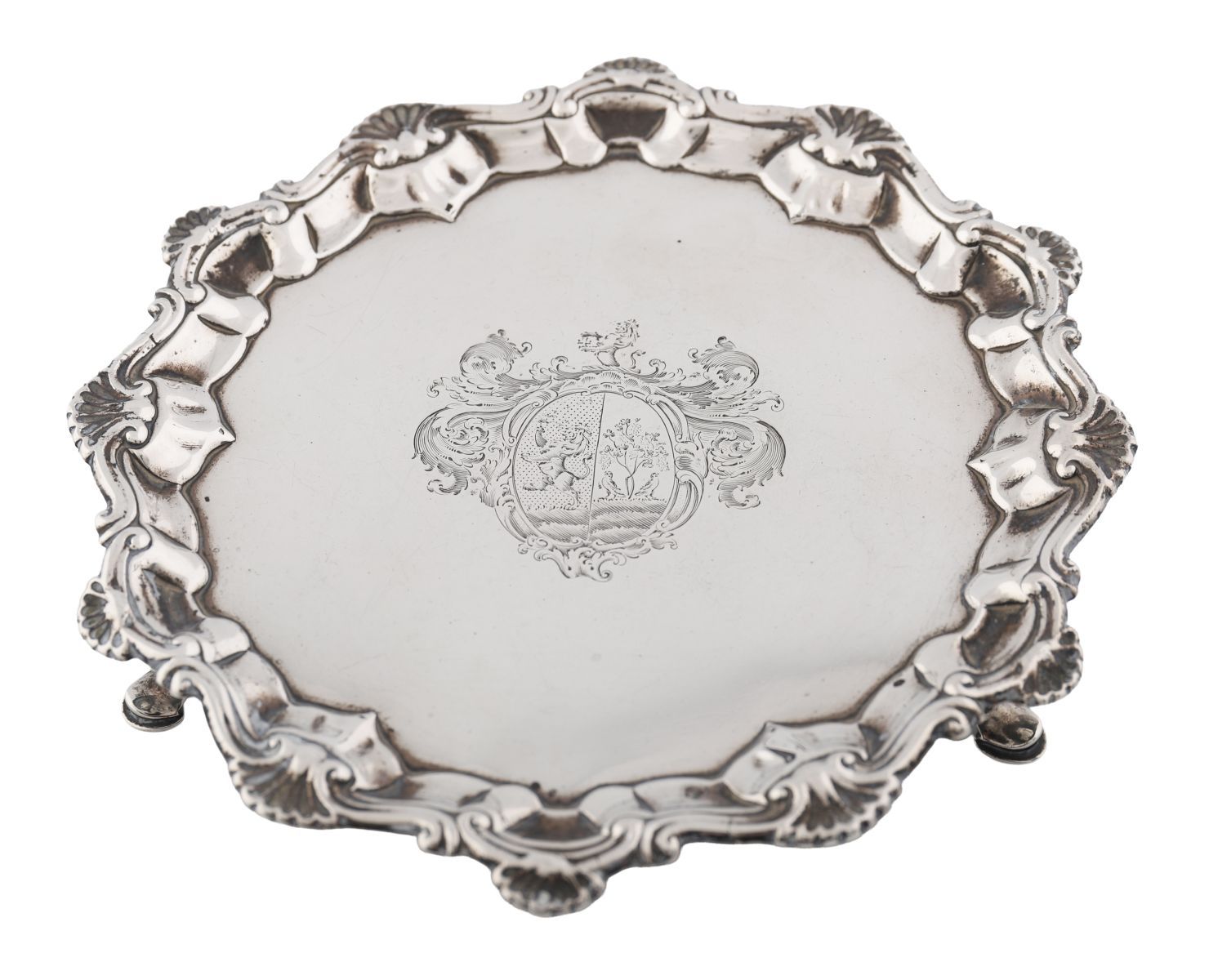 Circular silver waiter with bold shell and scroll border, engraved with an armorial crest, raised on three hoof feet.