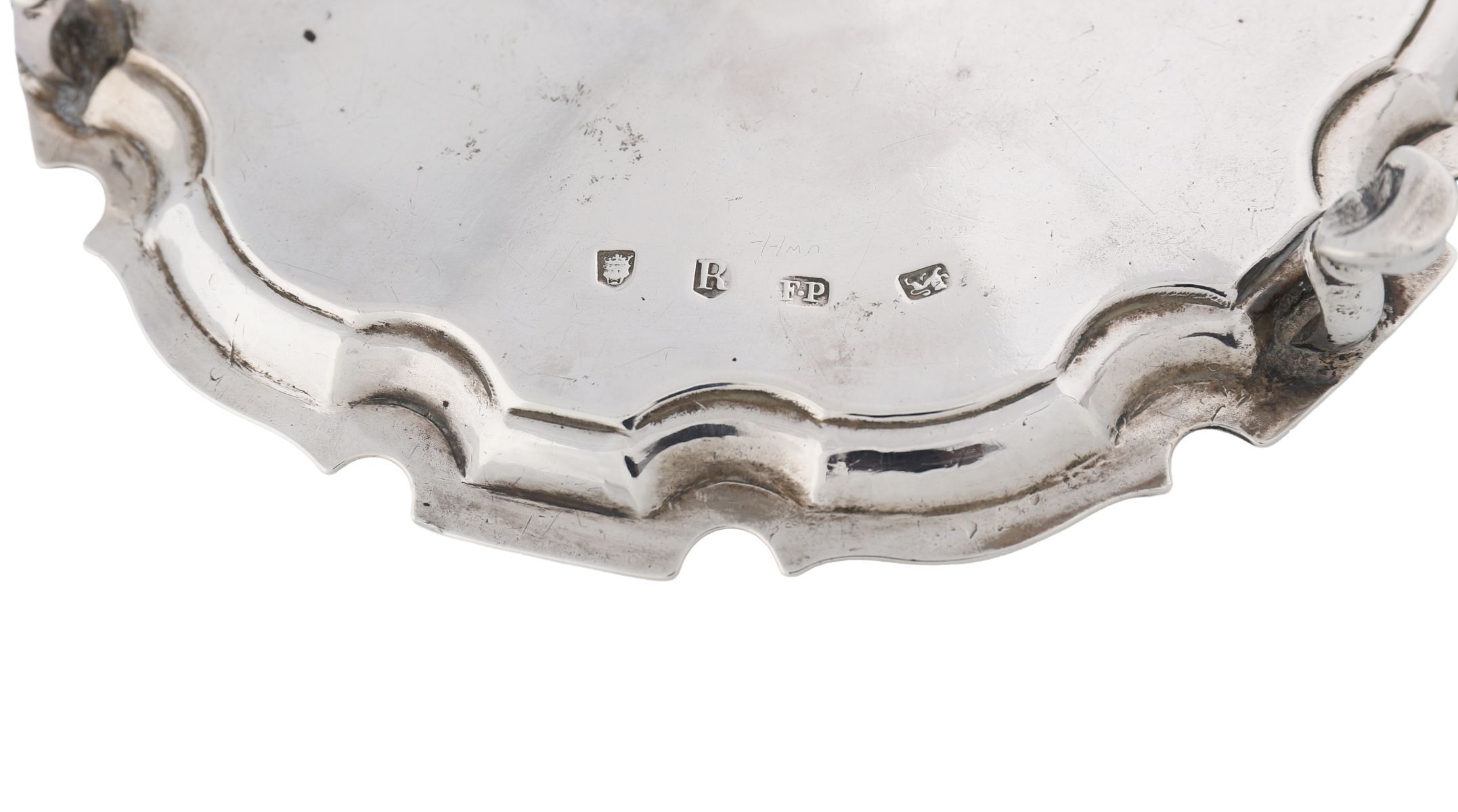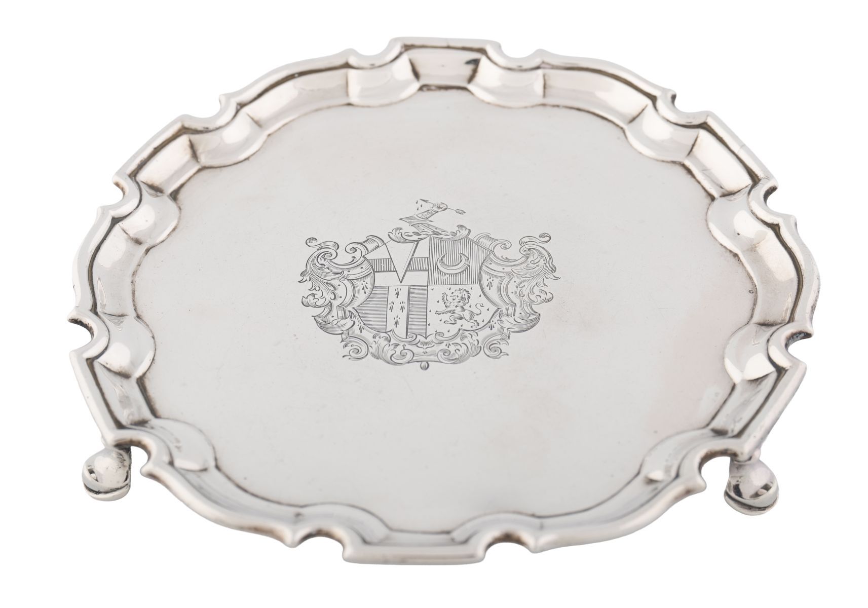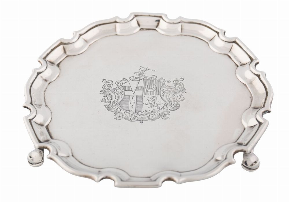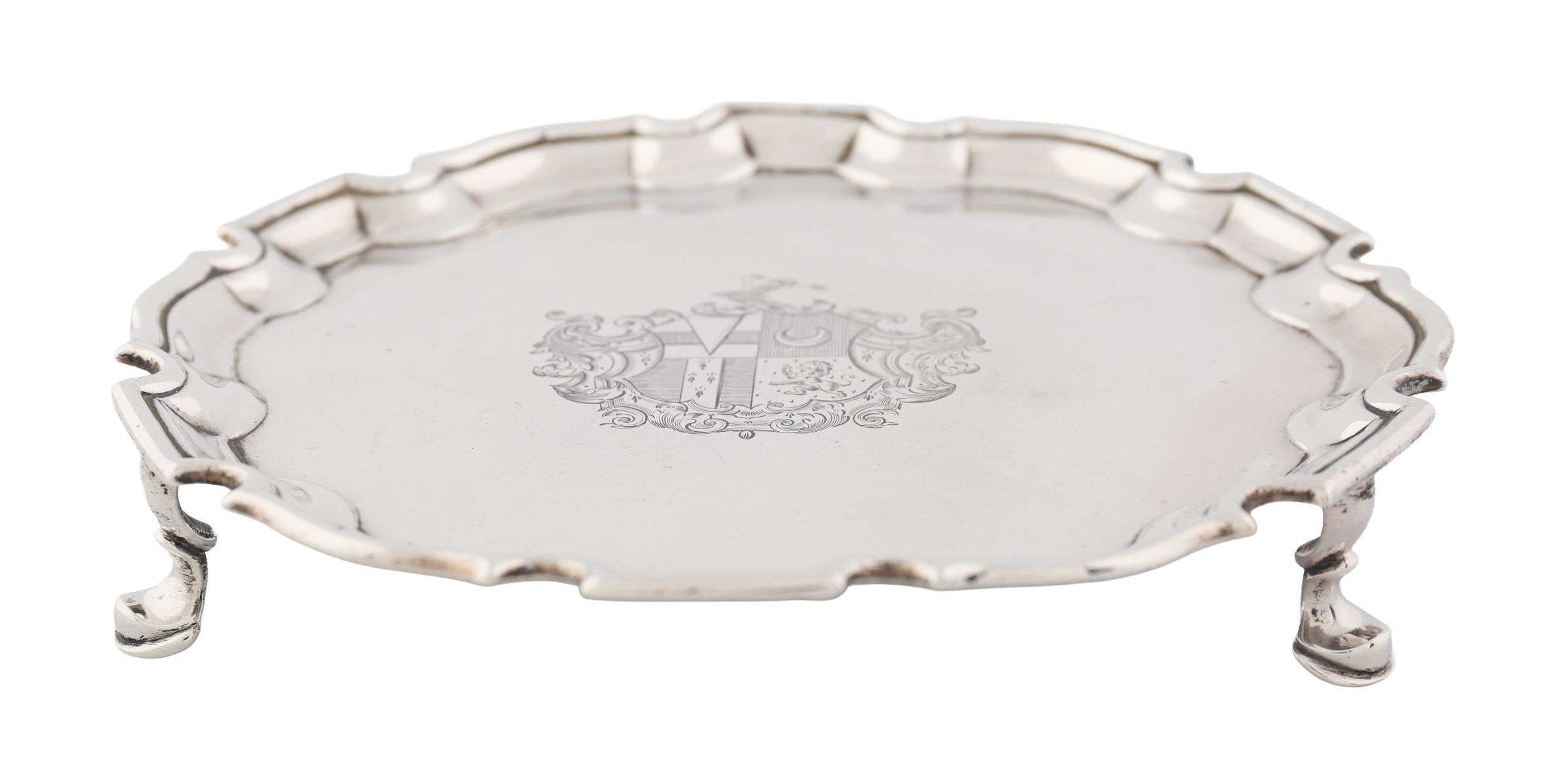 Silver salver engraved to the centre with a coat of arms within Baroque mantling, on three hoof feet, with pie-crust border and contemporary initials E*F. weight 11oz (341g)
