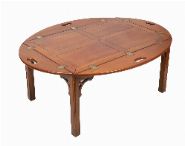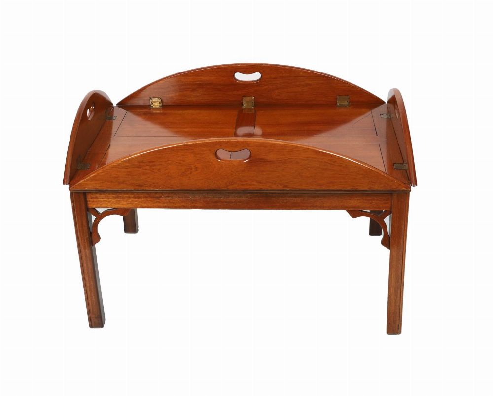 A mahogany butler's tray of George II style, the rectangular top with four hinged flaps and pierced carrying handles, raised on a fold-over X-frame stand.