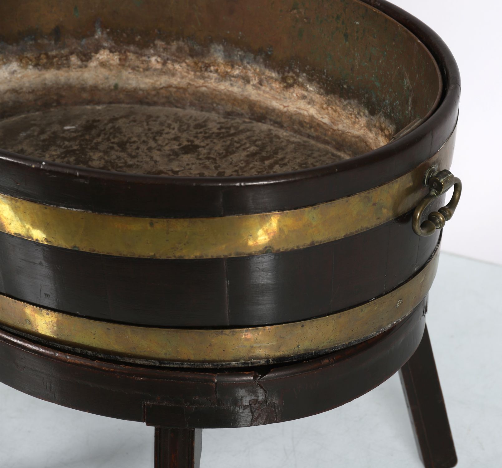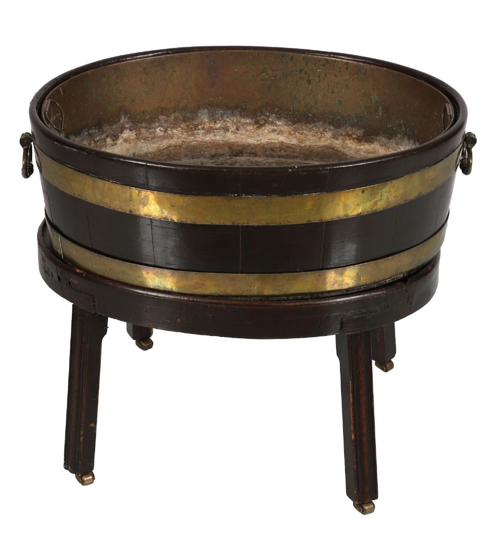 Lot 1652 GEORGE III BRASS-BANDED MAHOGANY WINE COOLER ON STAND