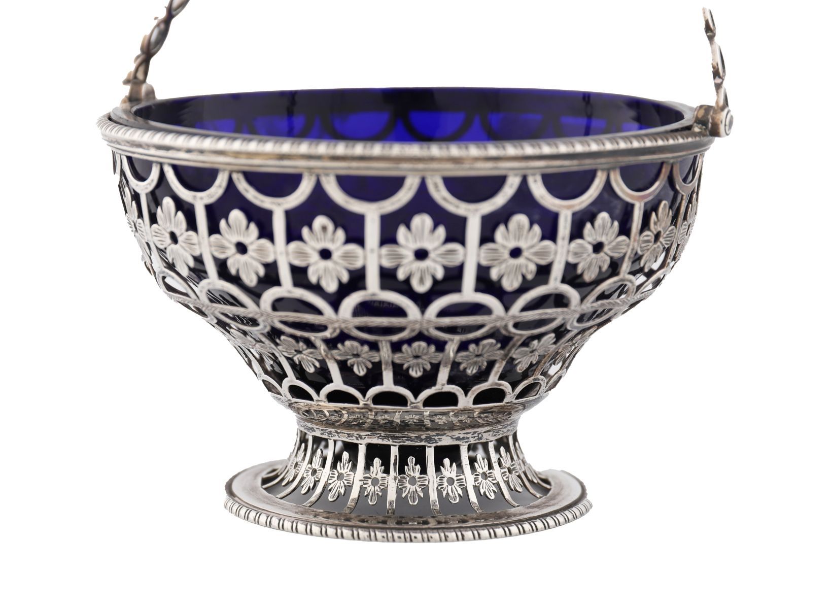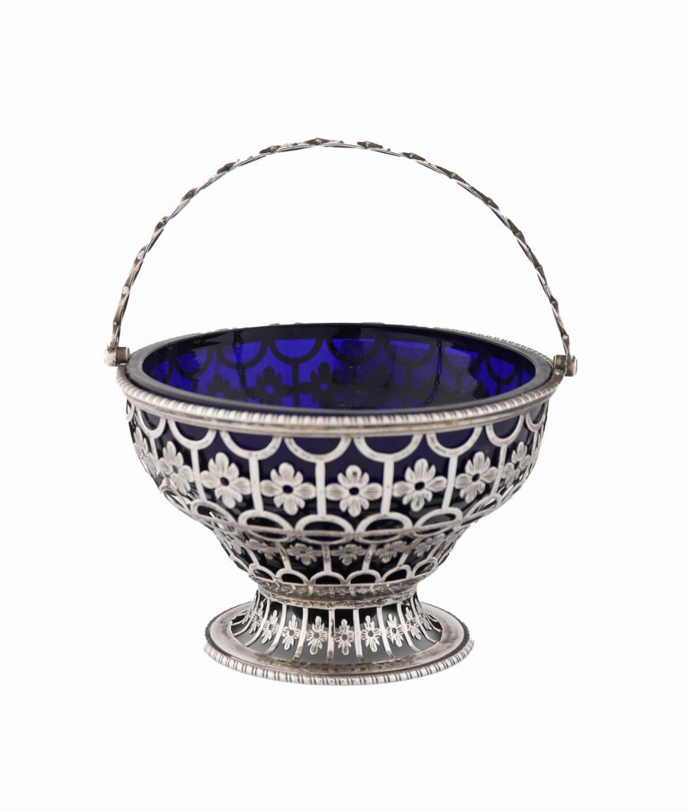 A George III Irish silver sugar basket, William Bond, Dublin, circa 1770. With pierced and embossed decoration, animal-mask cartouche, crest, and blue glass liner, fitted with a swing handle. weight approx. 4.8 oz