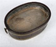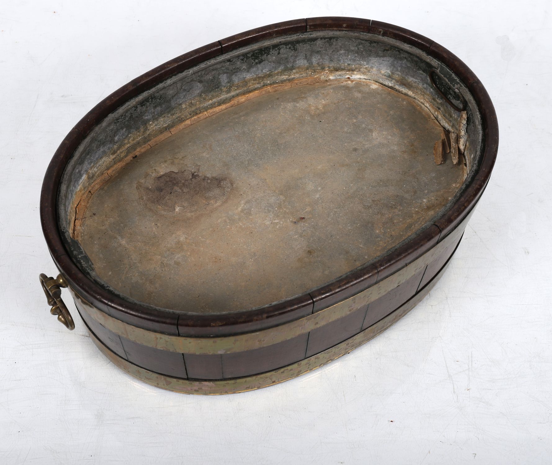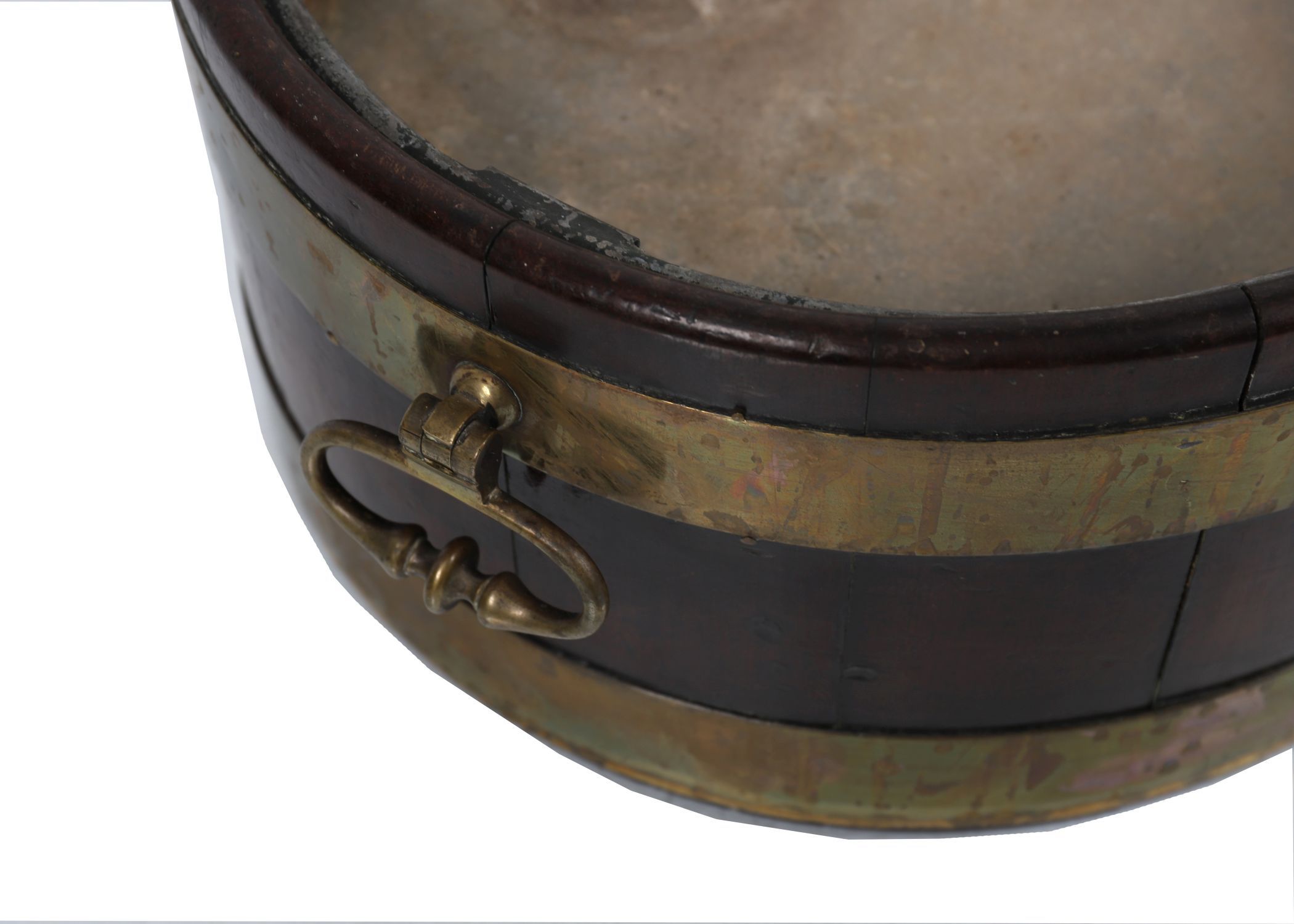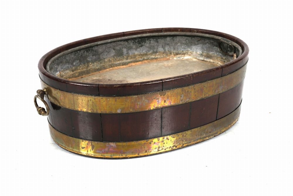 An early 19th-century oval mahogany wine cooler, brass-banded and with original lead-lined interior, fitted with brass carrying handles. The exterior with warm, aged colour and patination.