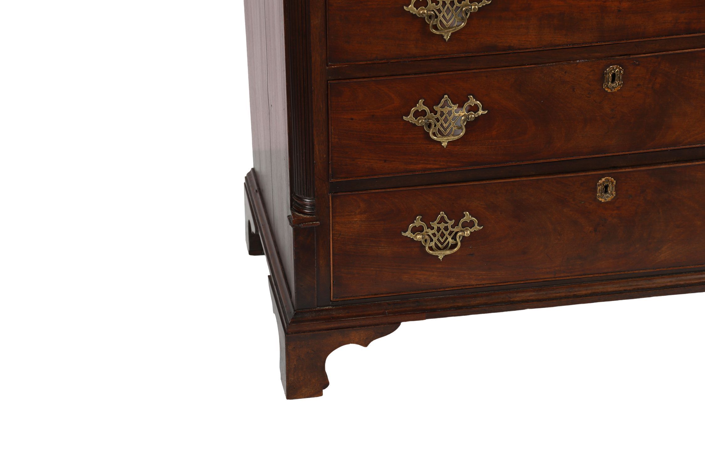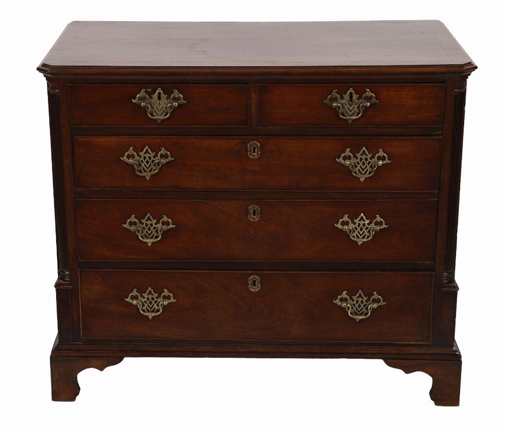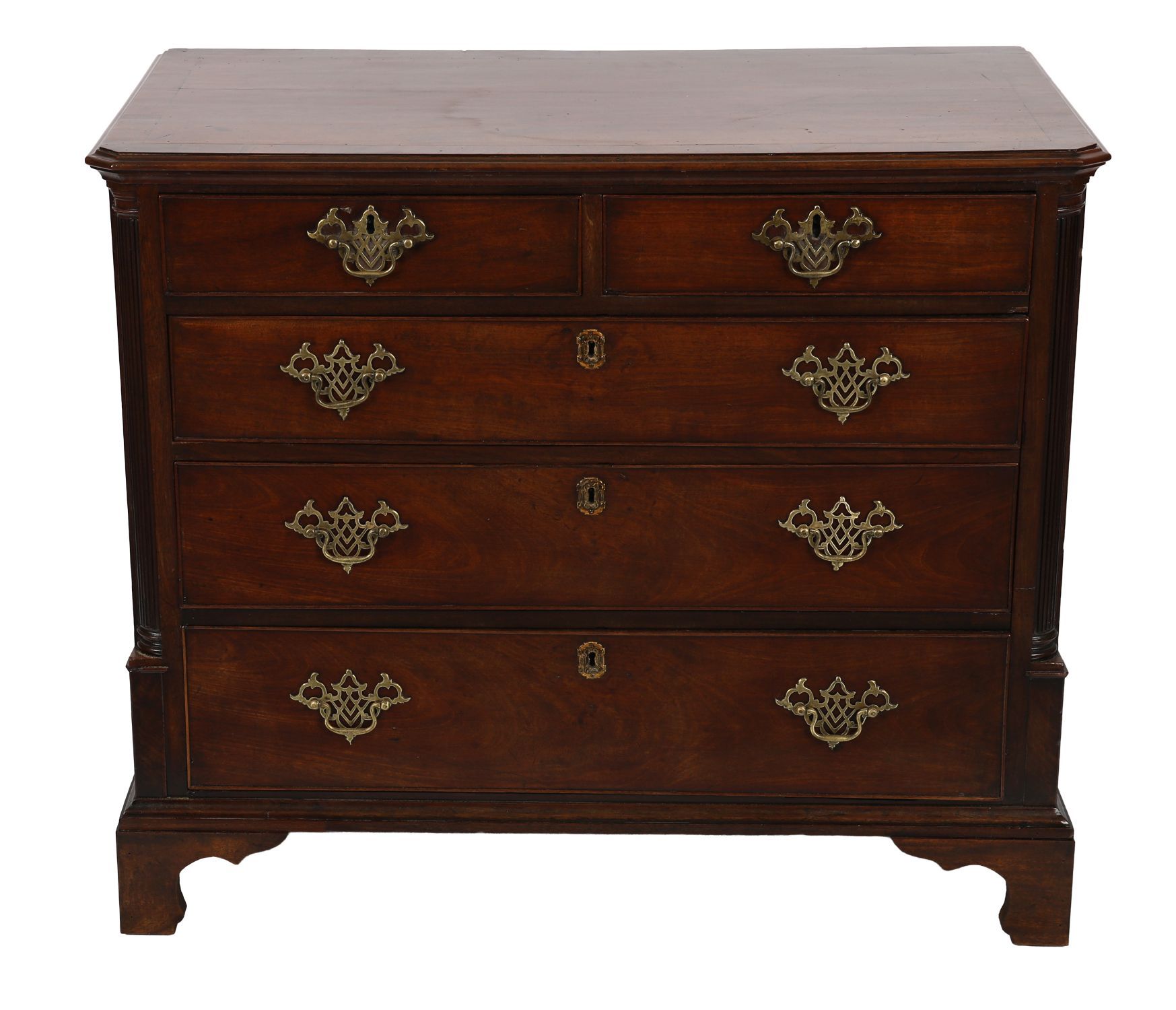 A late 18th-century George III chest of drawers in figured mahogany with crossbanded borders, fitted with two short and three long drawers, each with pierced brass plate handles and escutcheons, raised on bracket feet.