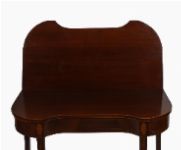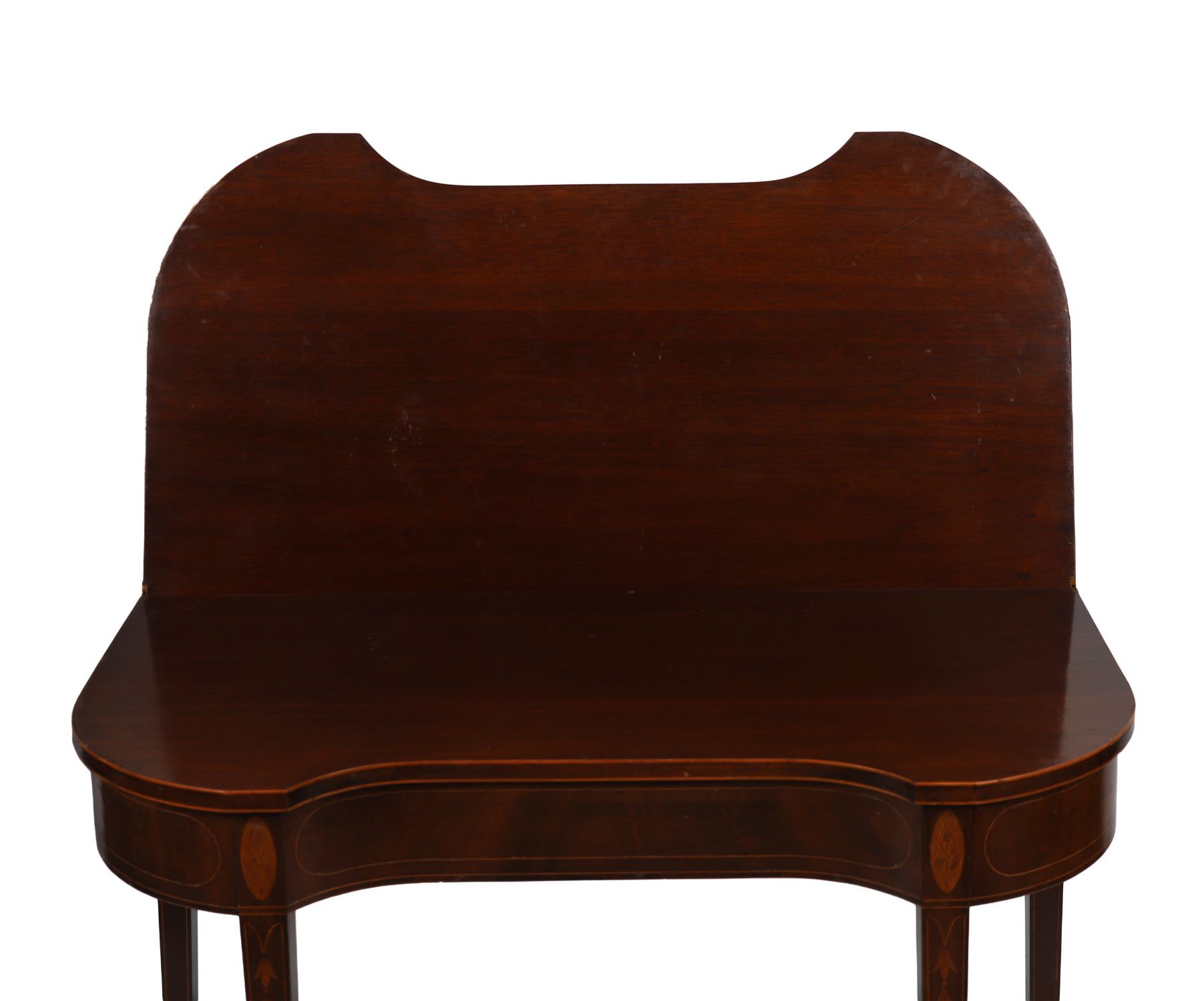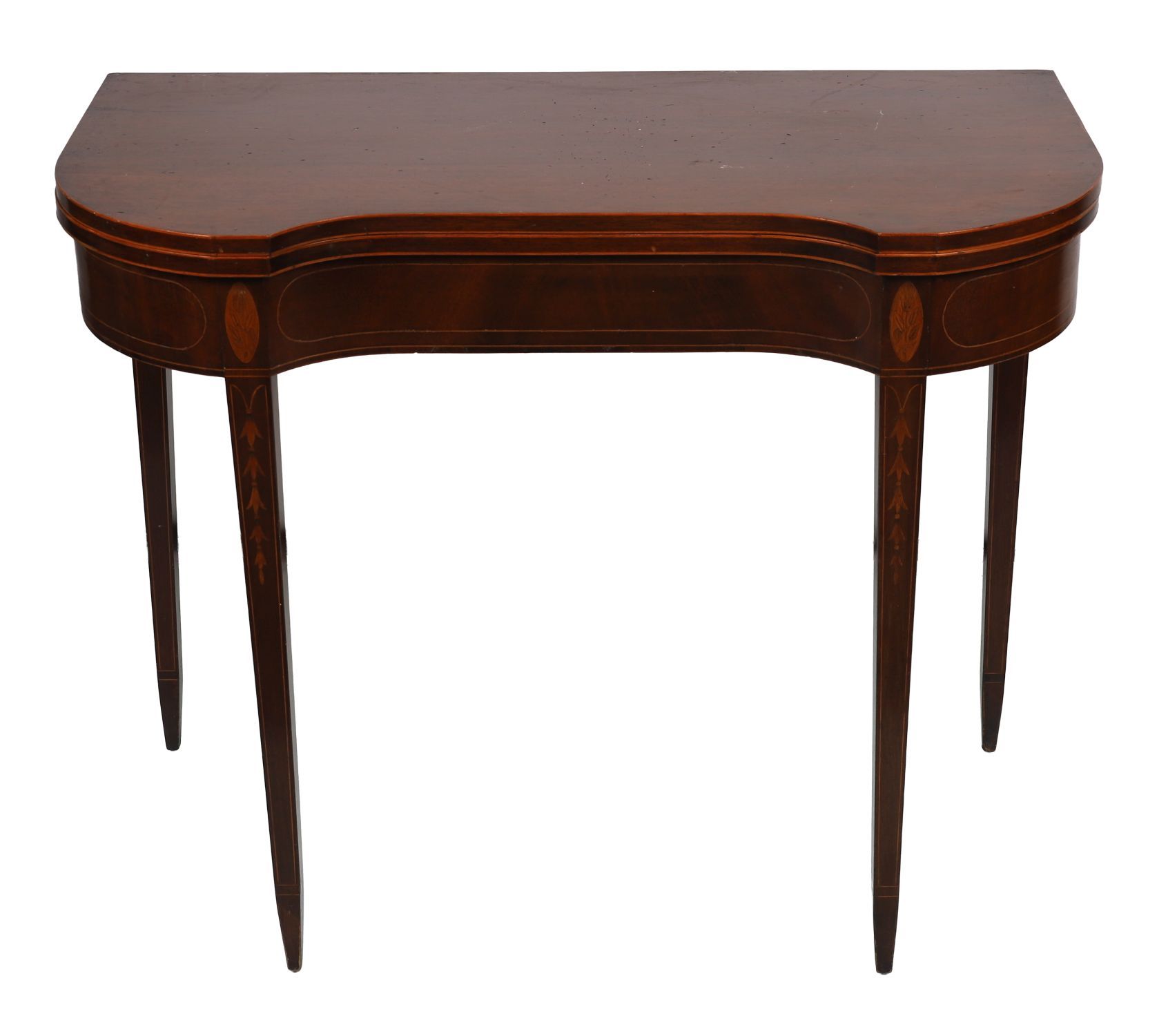 A serpentine-front George III fold-over tea table, the top with crossbanding and line inlay, supported on square tapering legs.