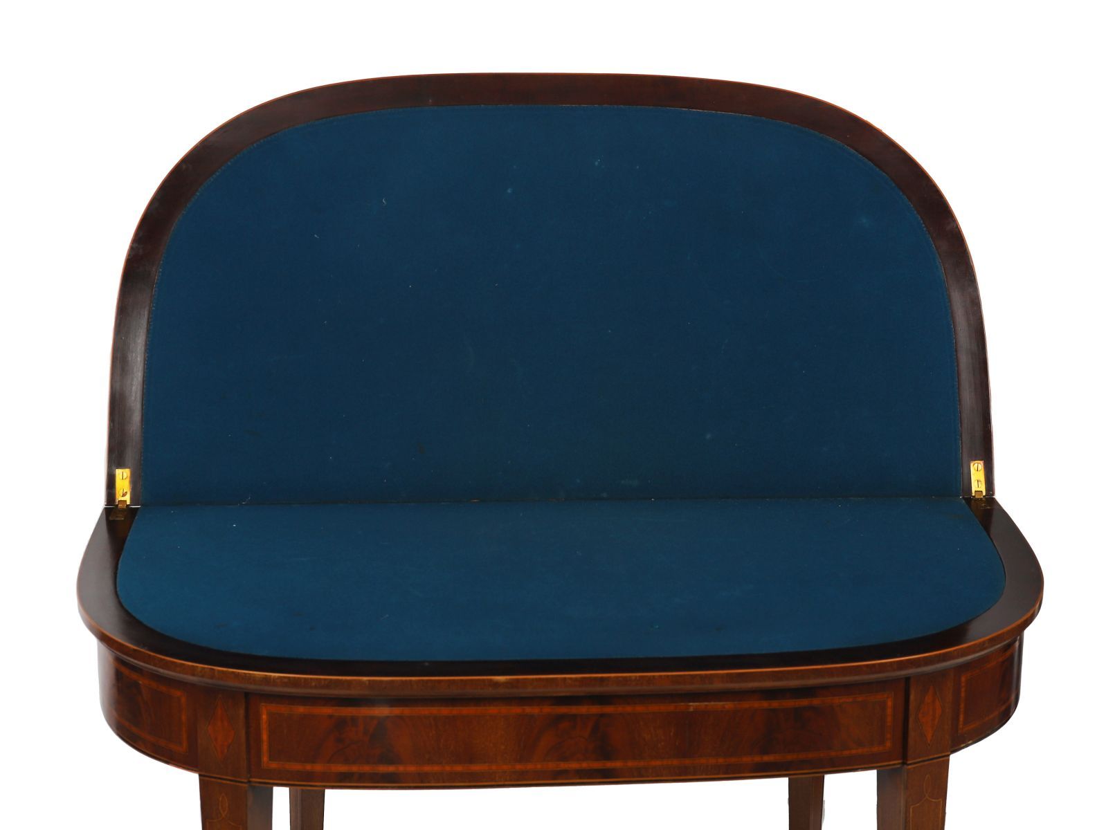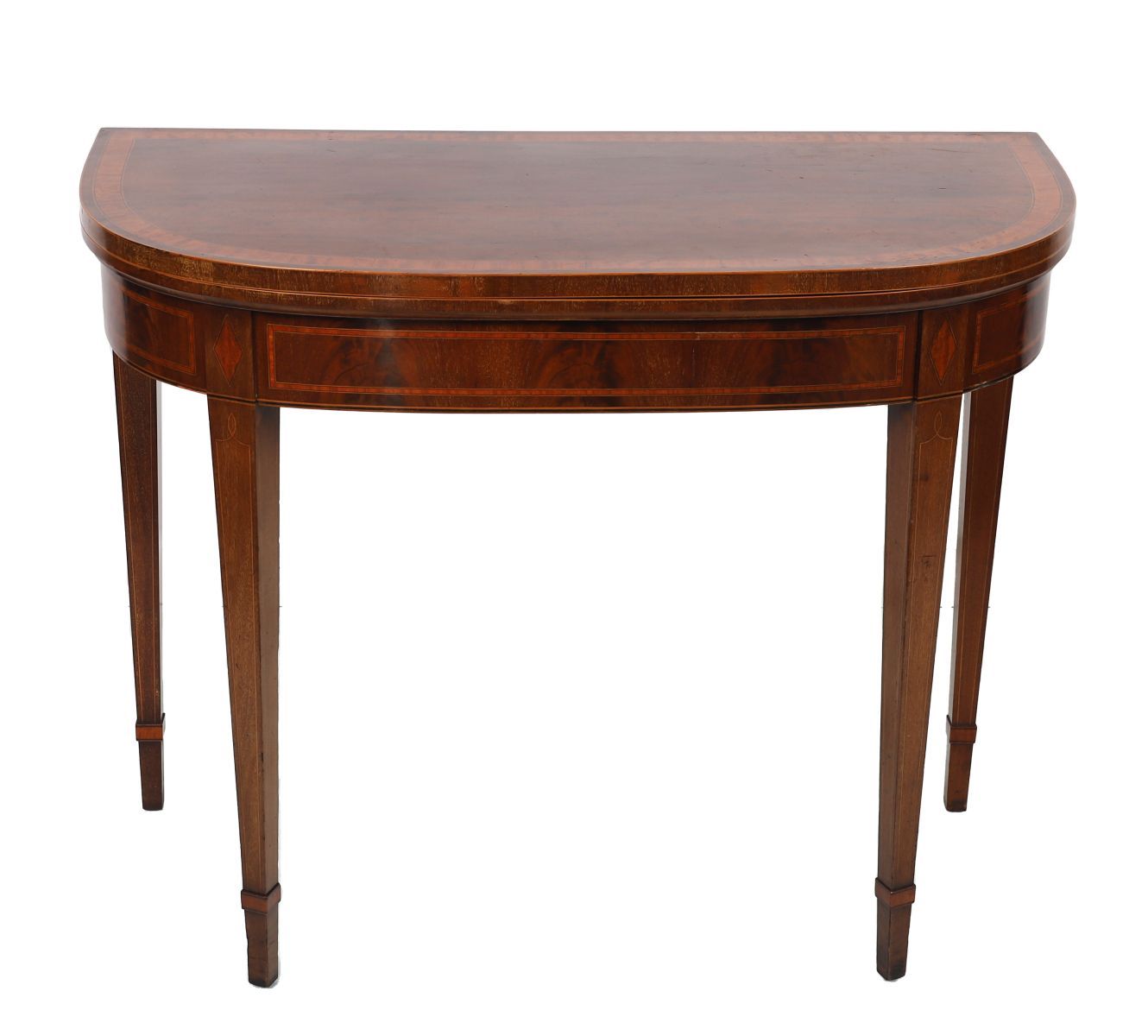 A George III mahogany and inlaid rectangular games table, the fold-over top opening to reveal a baize-lined playing surface, above a fitted frieze, raised on square tapering legs with spade feet, incorporating satinwood line inlay throughout.