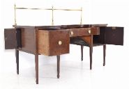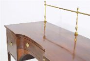 the rectangular-shaped top with cavetto breakfront above a series of drawers, raised on square tapered legs all below a brass gallery rail.
