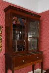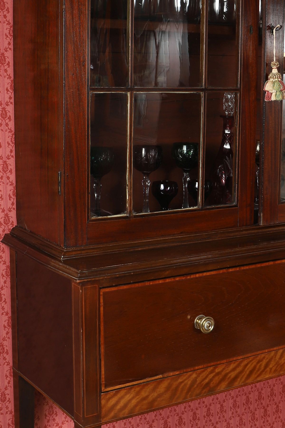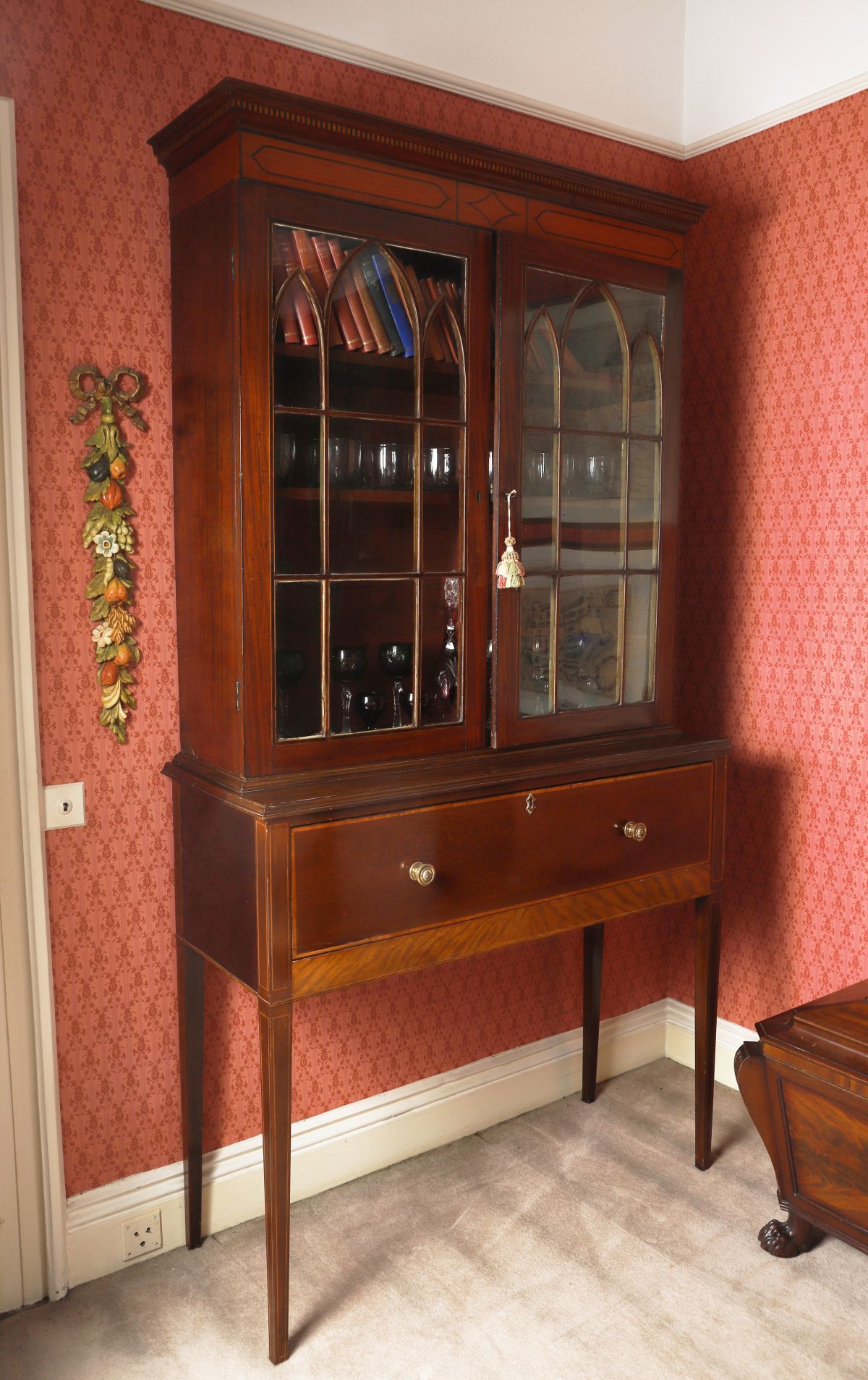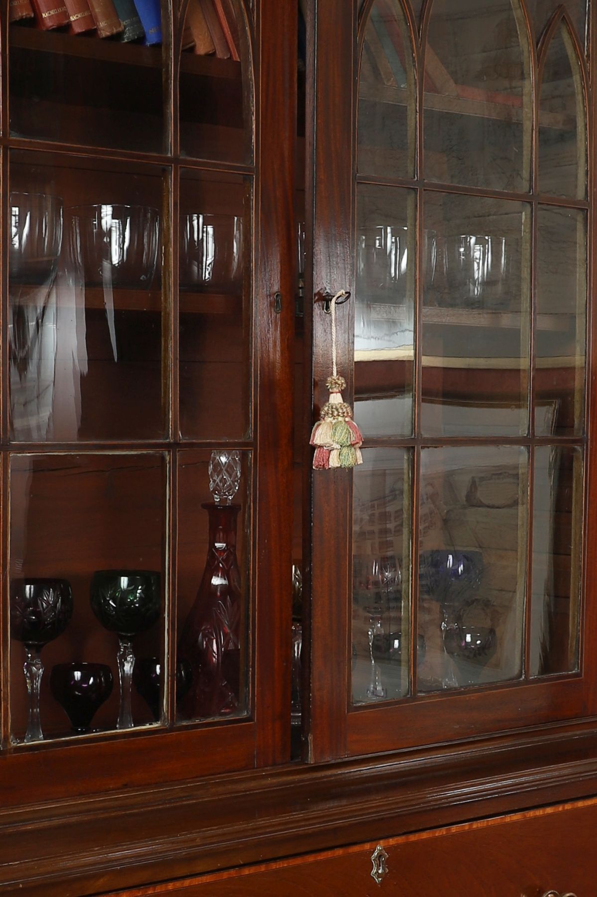 A George III mahogany and satinwood secretaire bookcase, the upper section with twin glazed Gothic-arched panel doors enclosing adjustable shelving, above a fitted secretaire drawer, raised on square tapered legs. Dentil cornice and line-inlaid decoration throughout.