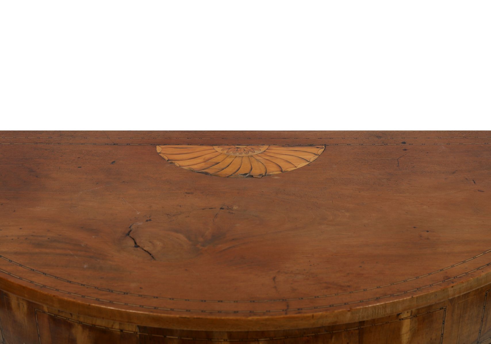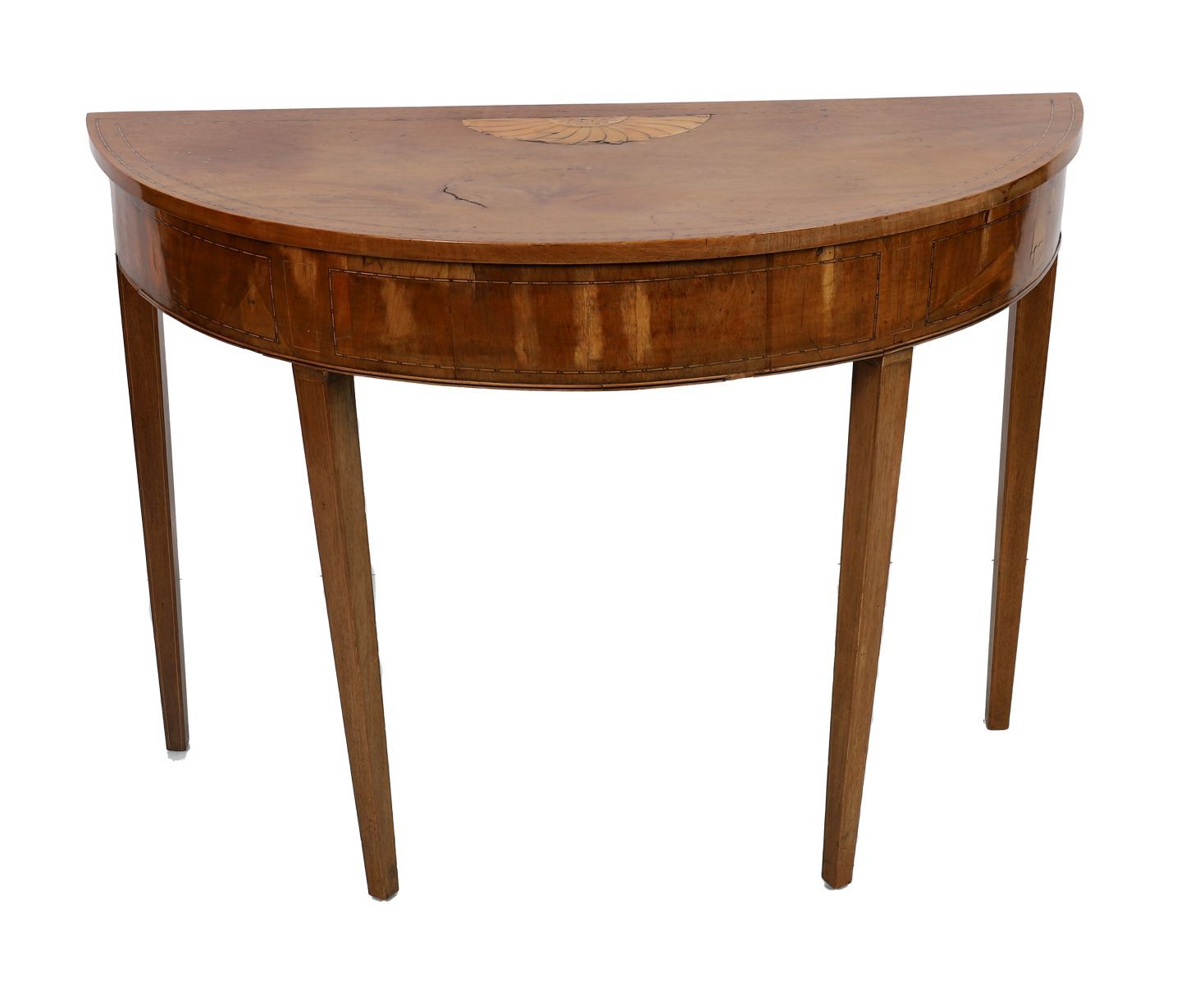 the demilune-shaped top with a demi-paterae motif above a conforming frieze, raised on square tapered legs.
