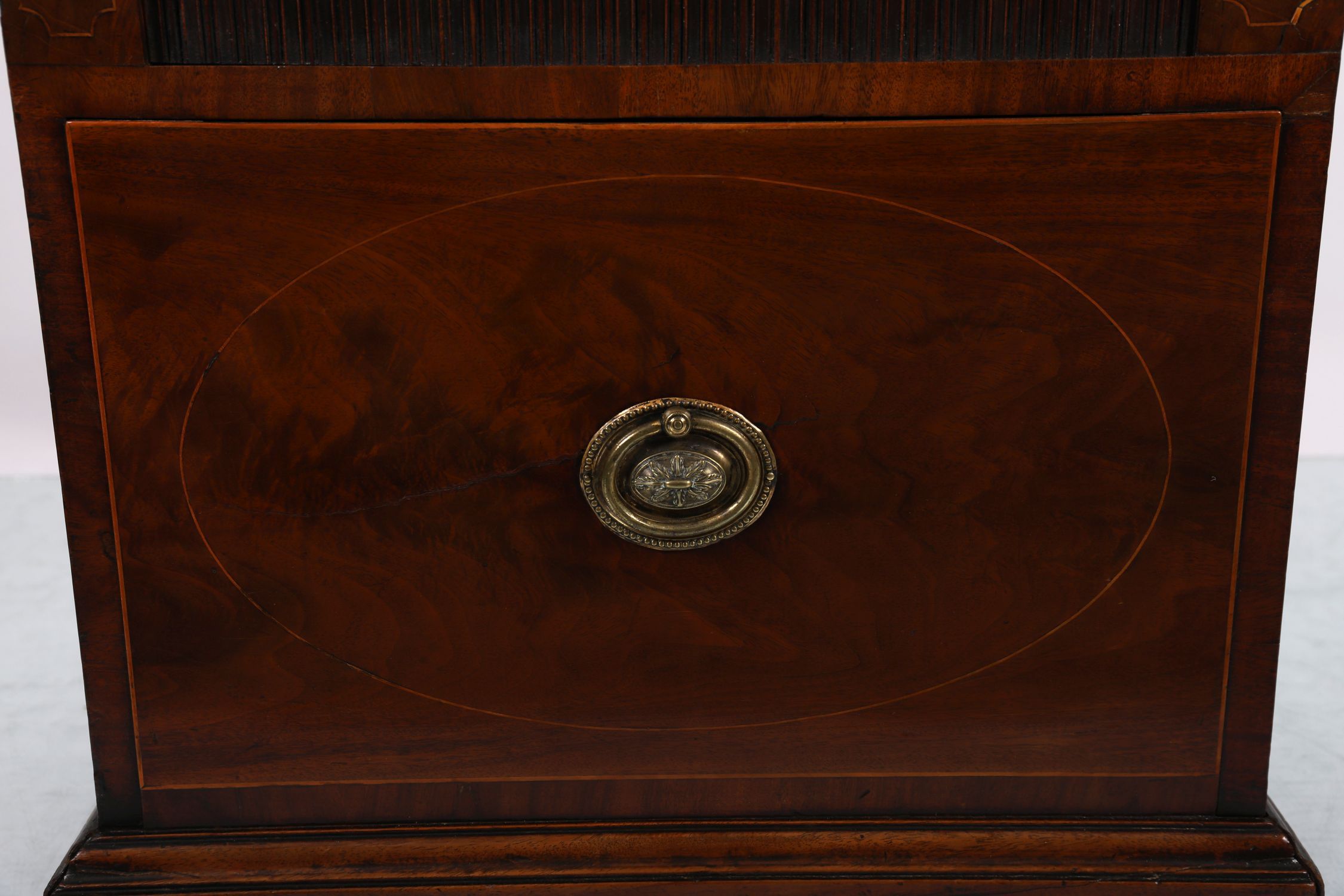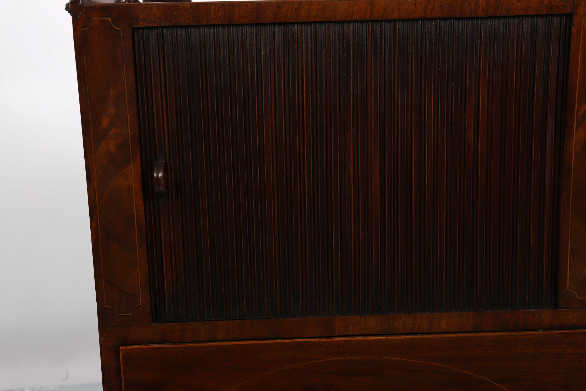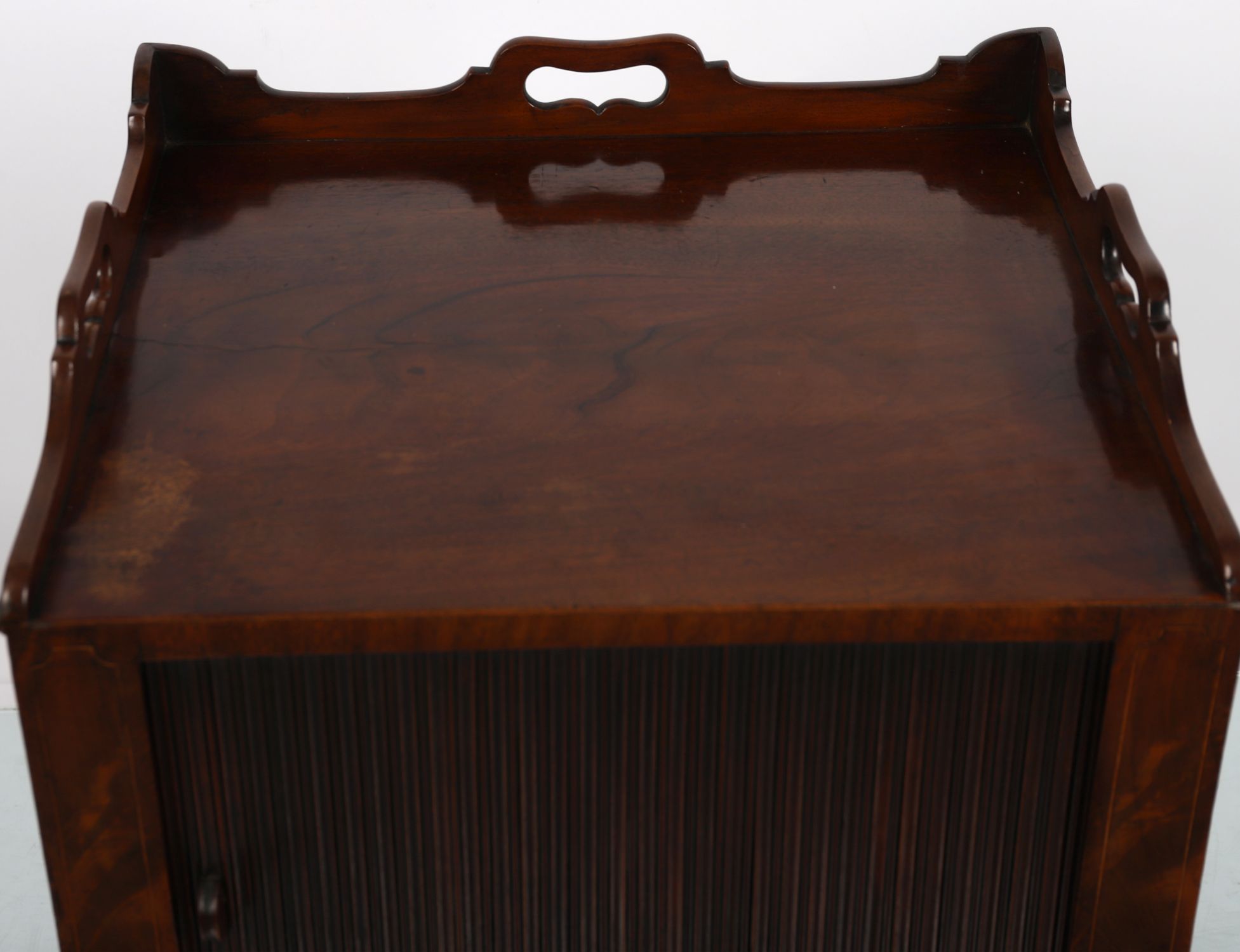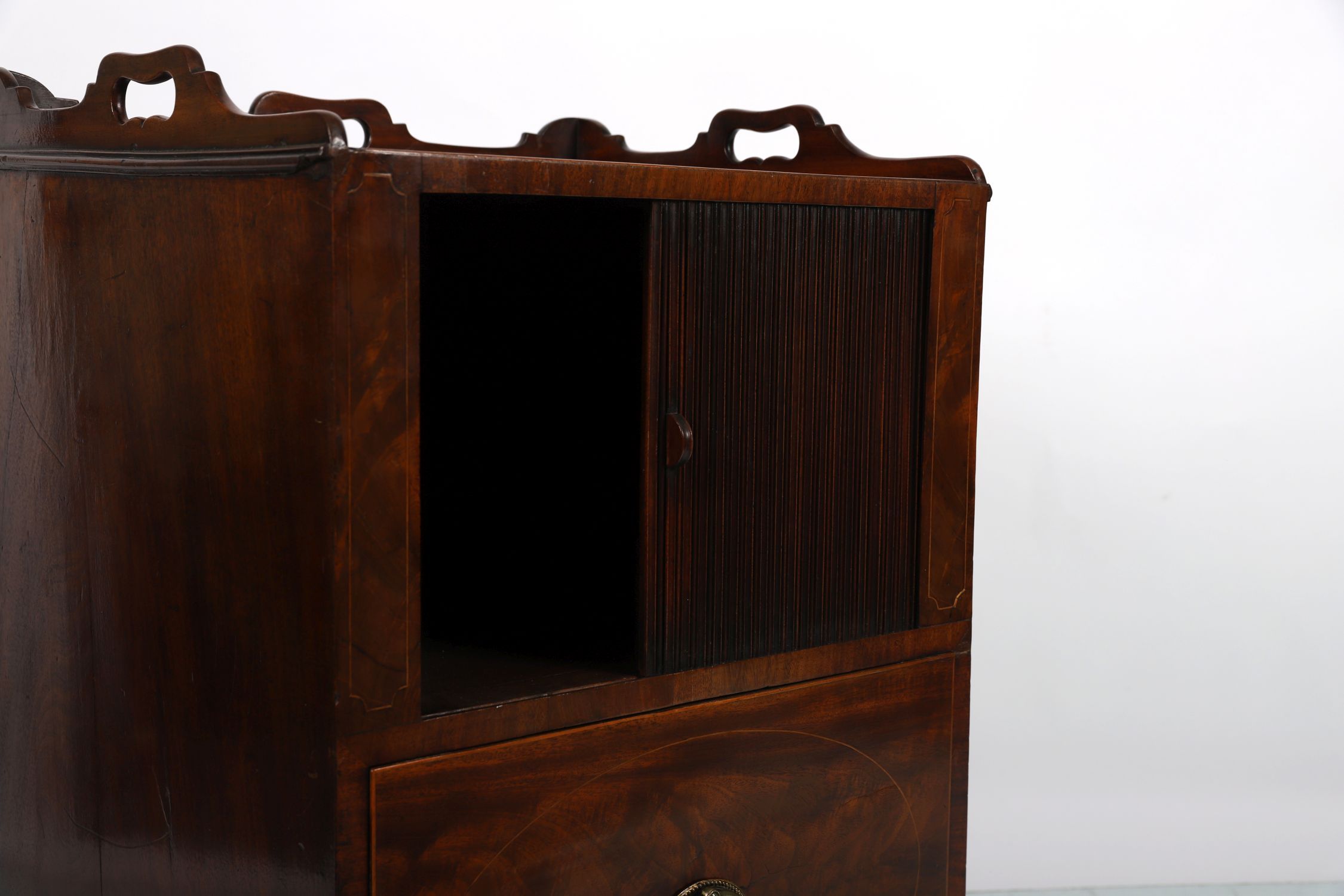 An 18th-century mahogany commode nightstand, with shaped gallery top above a tambour-front cupboard and drawer, on bracket feet.