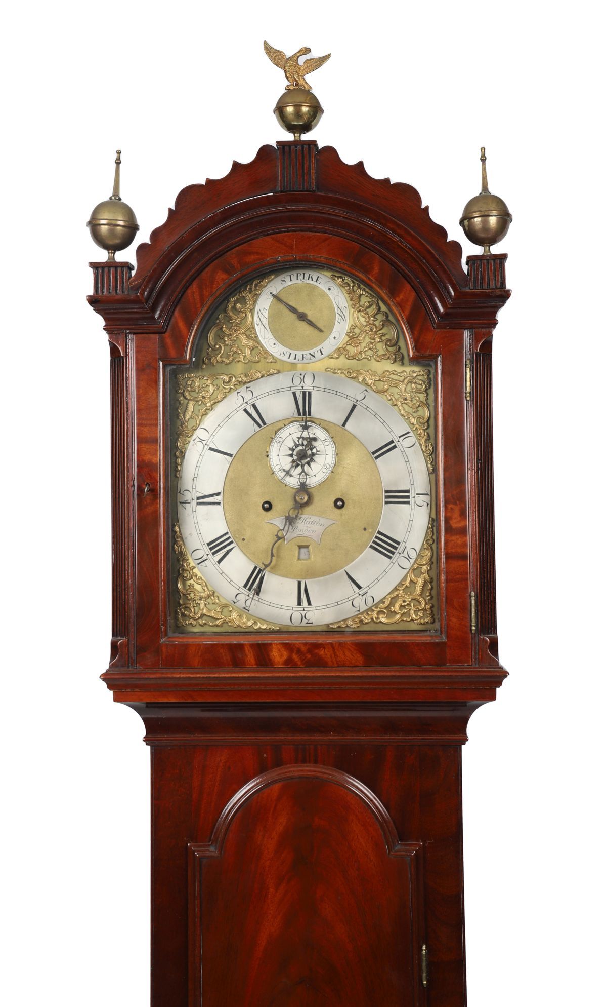 with brass and silvered dial. Inscribed Hatton of London, above a serpentine crown surmounted by eagle and ball finials above a waisted panelled door and stepped base raised on bracket feet.