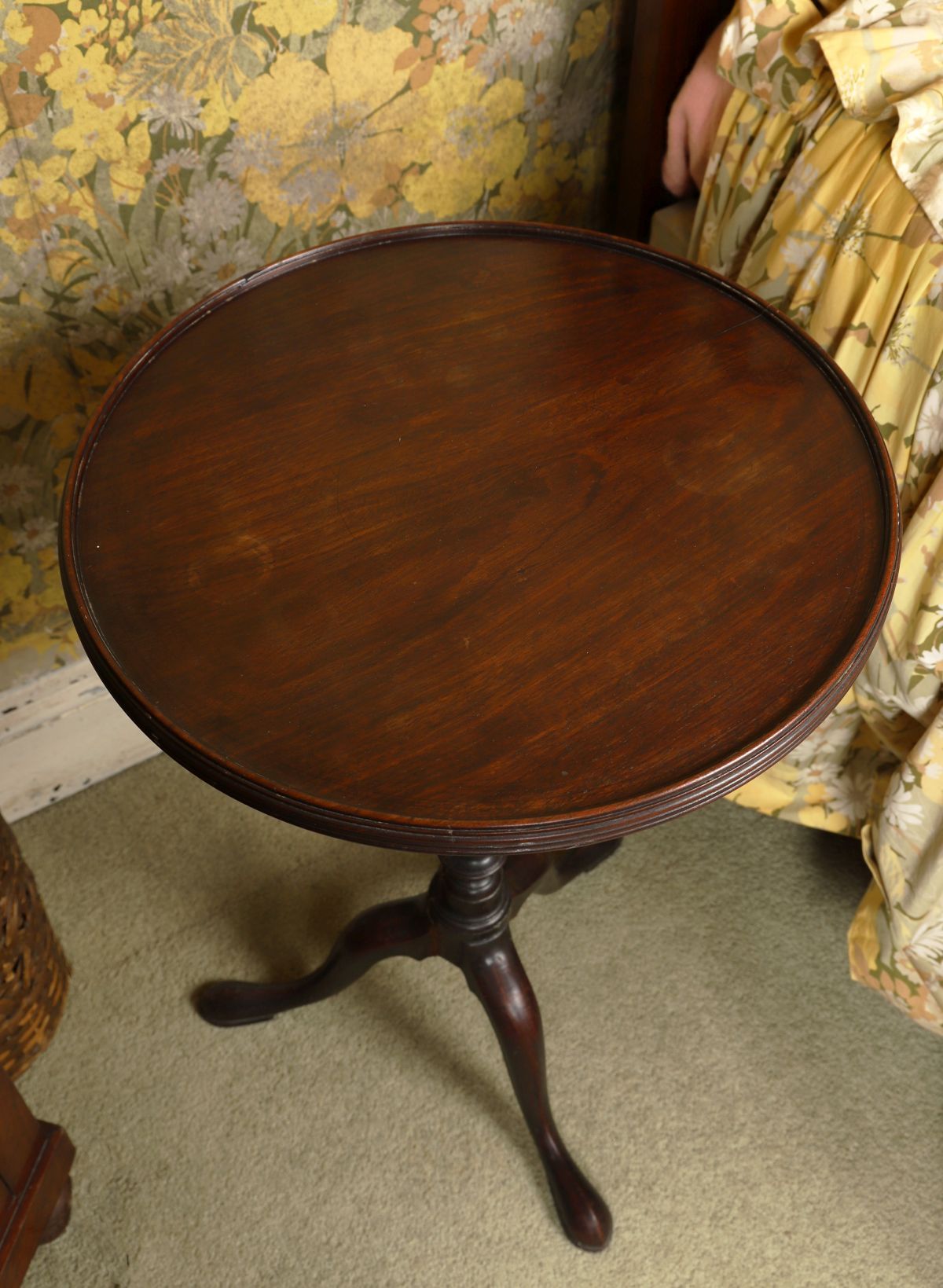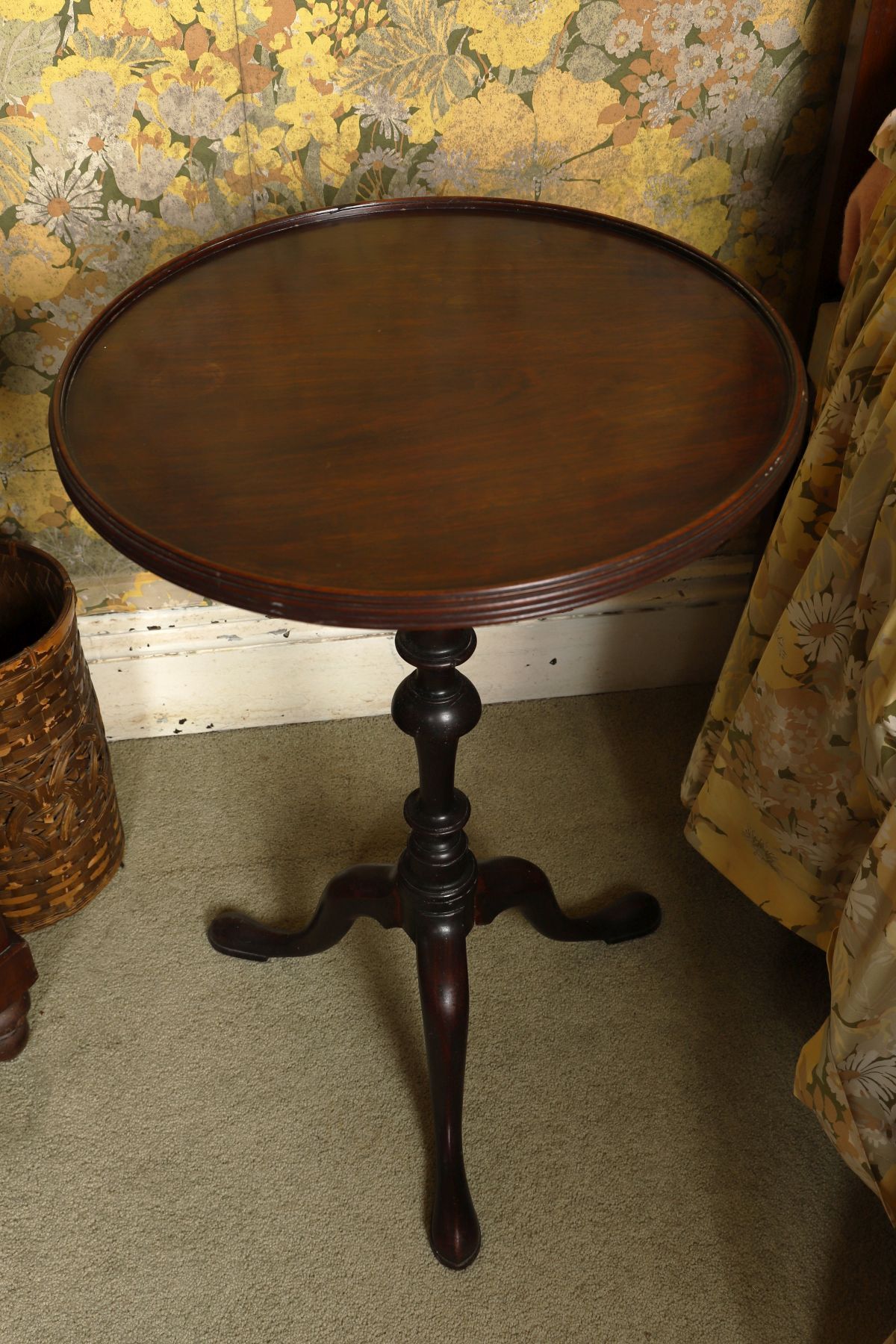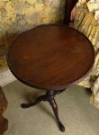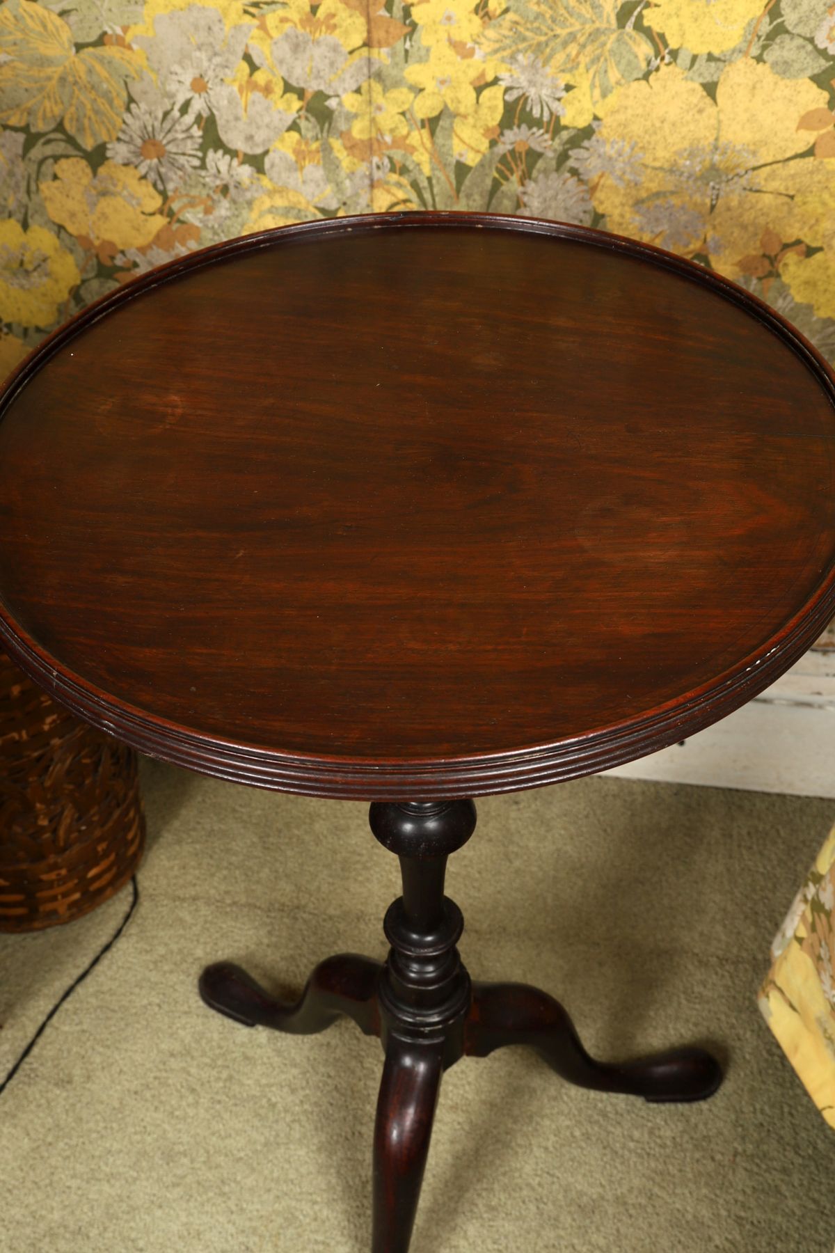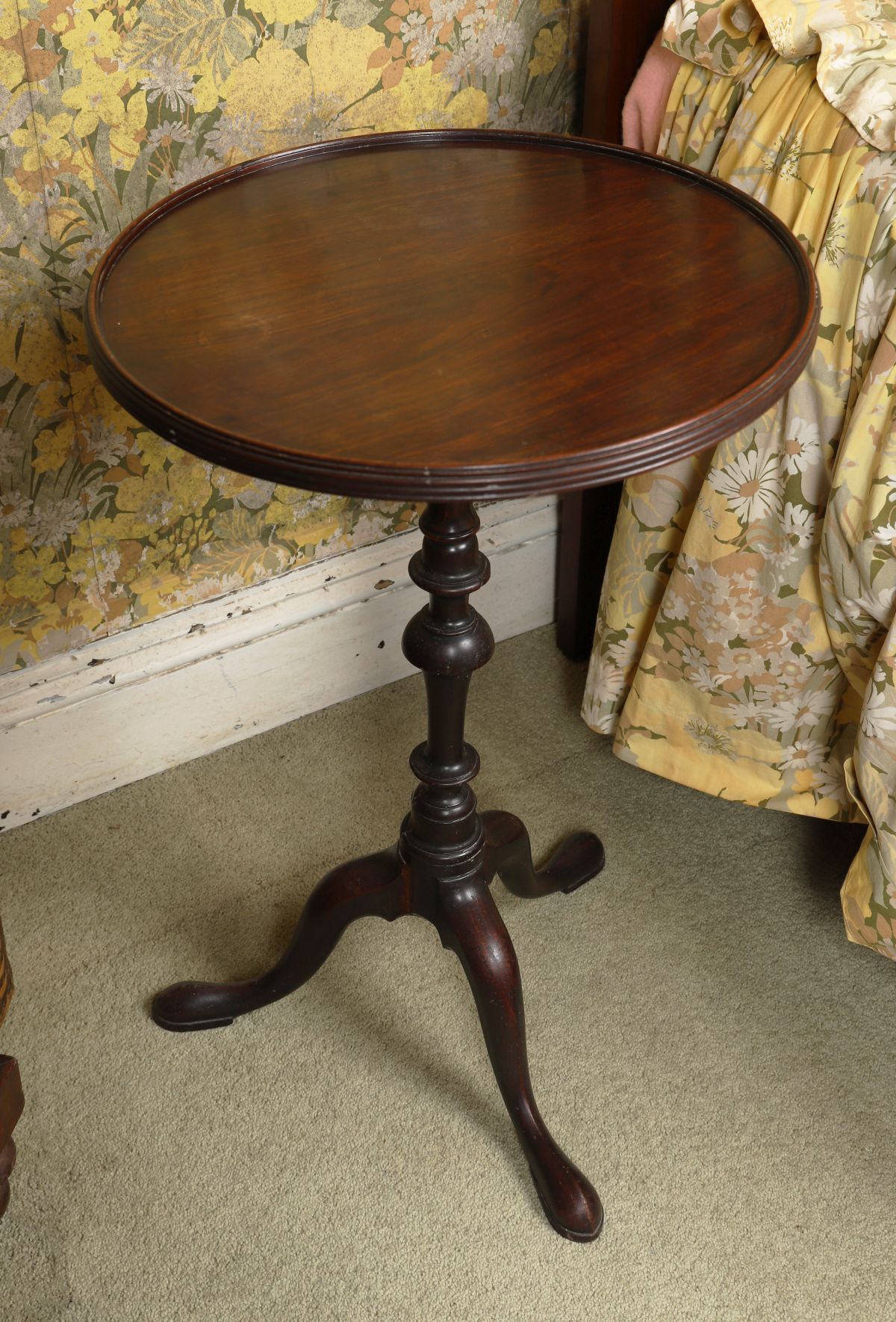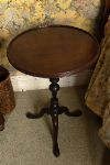 A George III mahogany wine table, the circular dished top raised on a turned baluster stem and tripod base with cabriole legs and pad feet. Late 18th century.