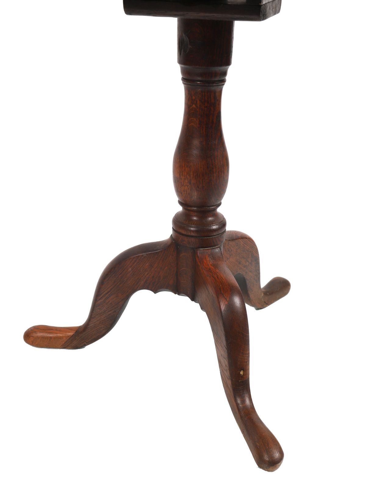 circular snap-top, raised on a baluster stem and scroll-legged pod, terminating on pad feet.
