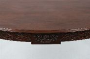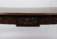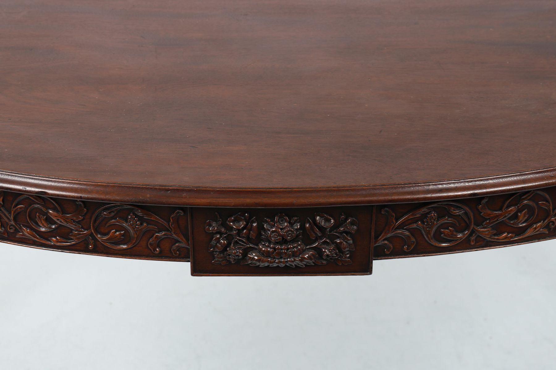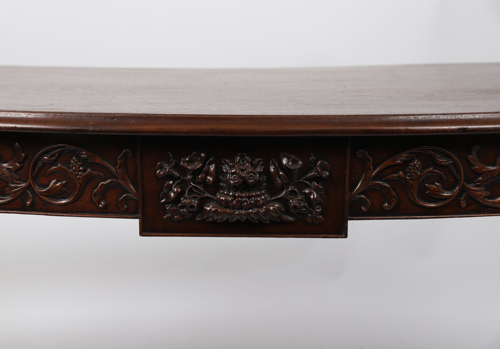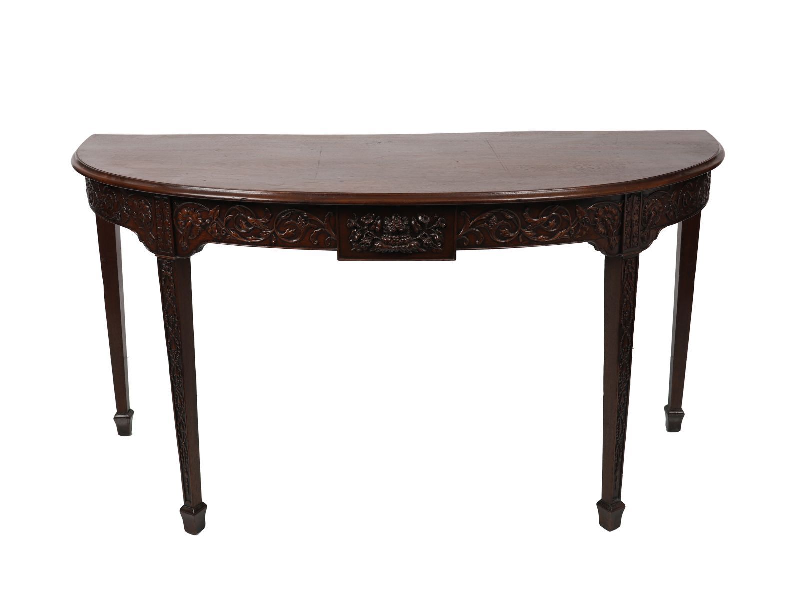 A George III period mahogany side table in the Adam style, the bow front and frieze carved with scrolling foliage and central urn motif, raised on slender tapering legs. Rich patina throughout.